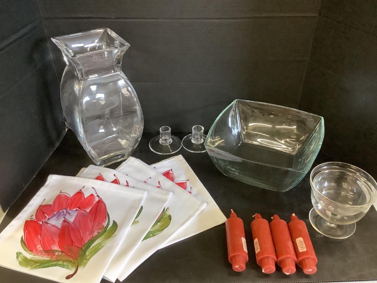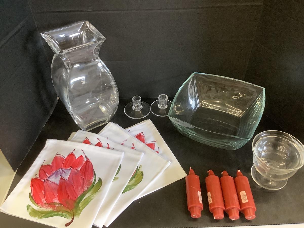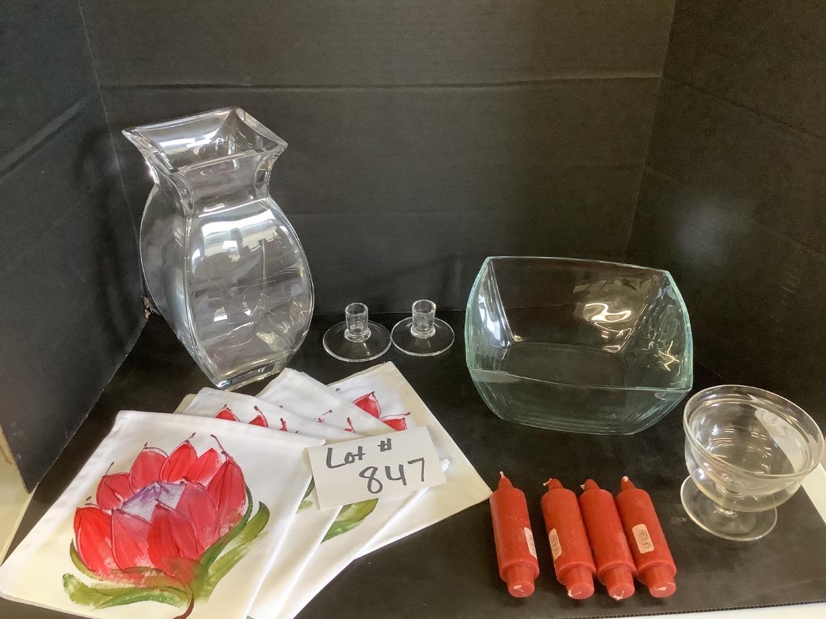 Lot 847. Glass Vase/Bowl,Candlesticks, Handpainted Floral Napkins