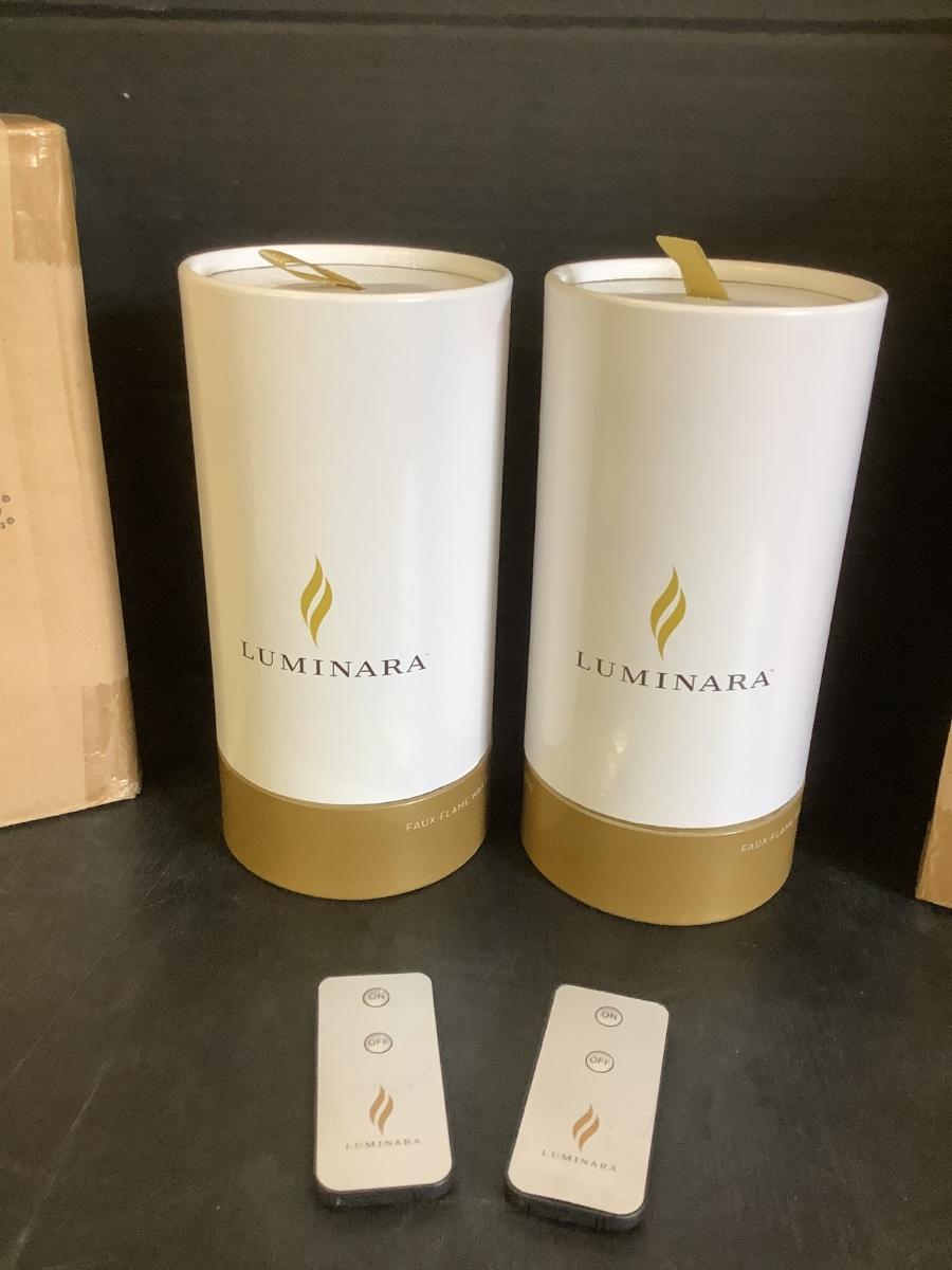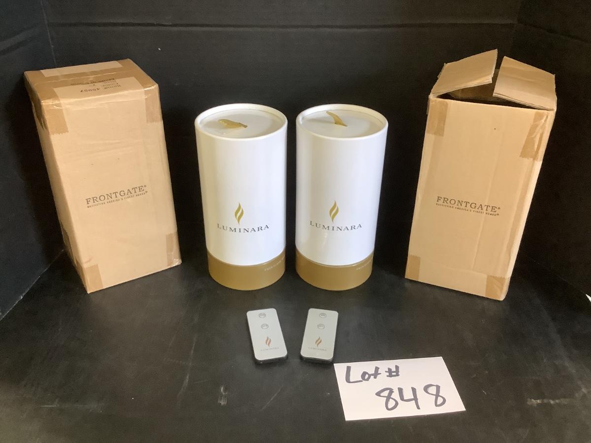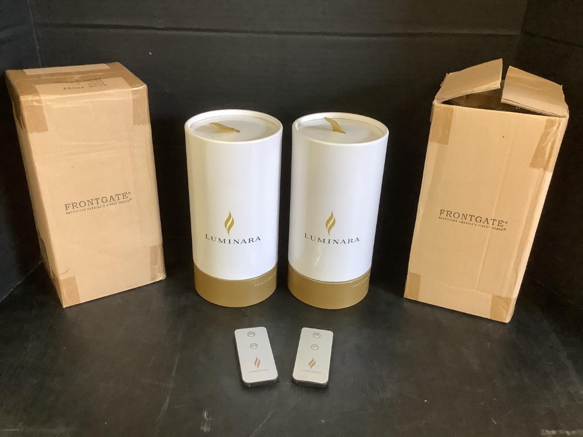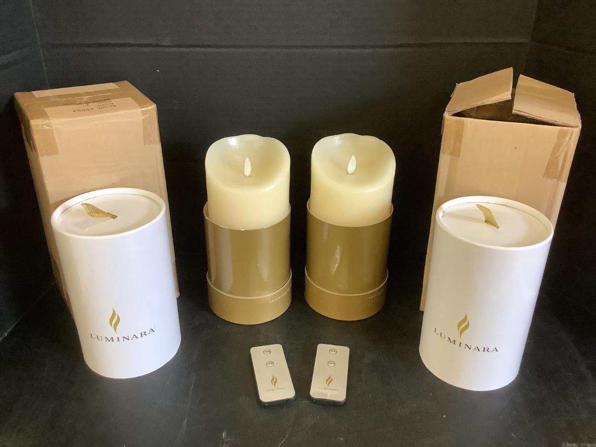 Lot 848. Pair of Luminara Faux-Flame Wax Pillar Candles - NEW - with Remotes
