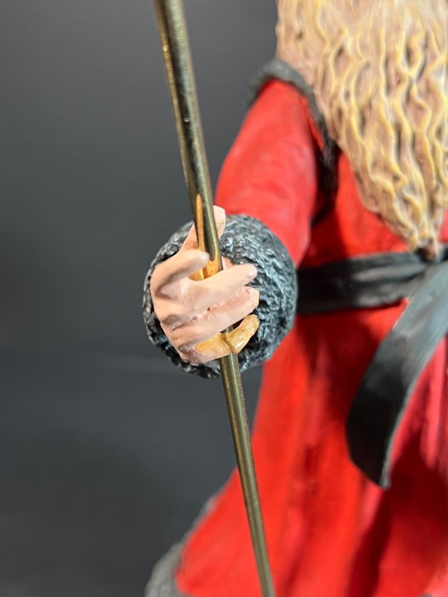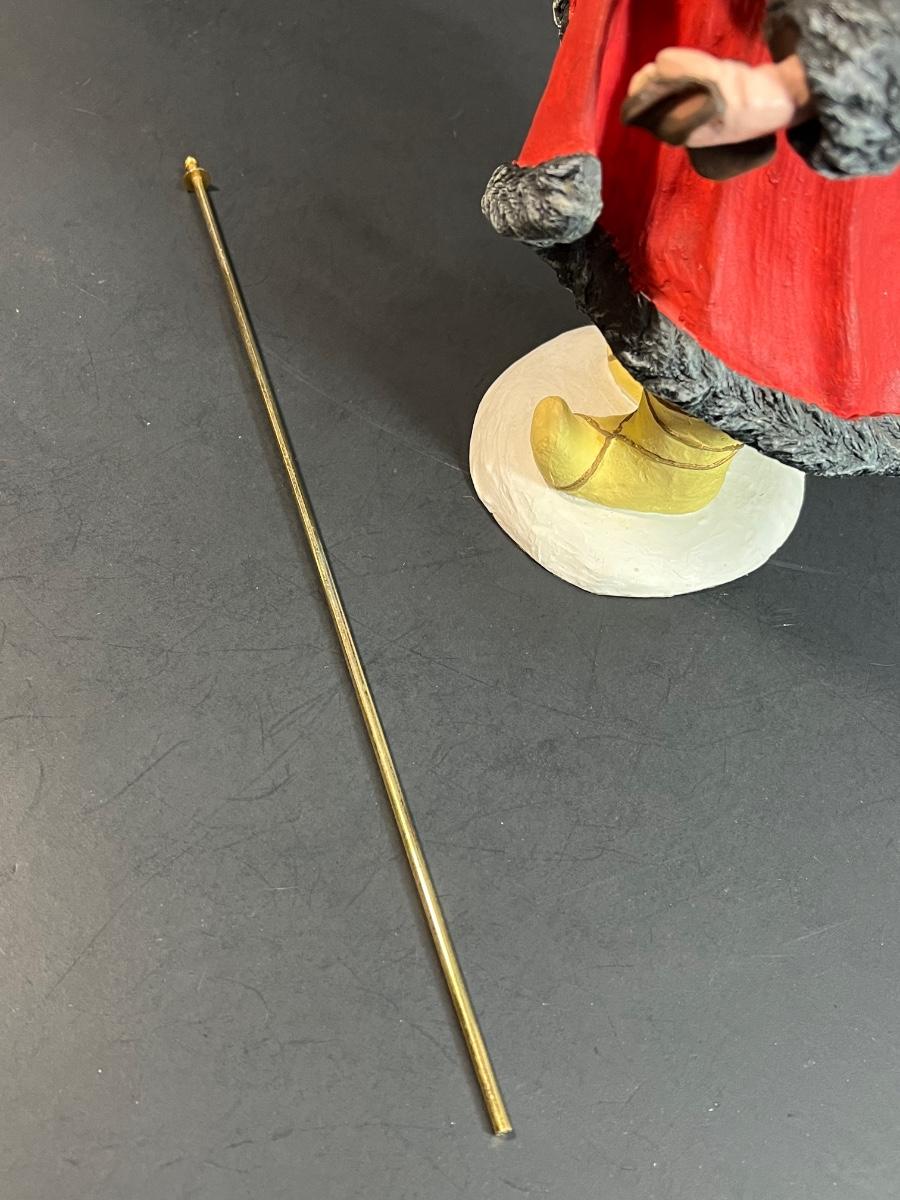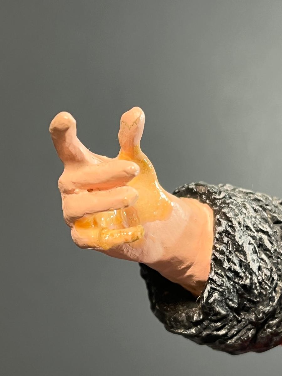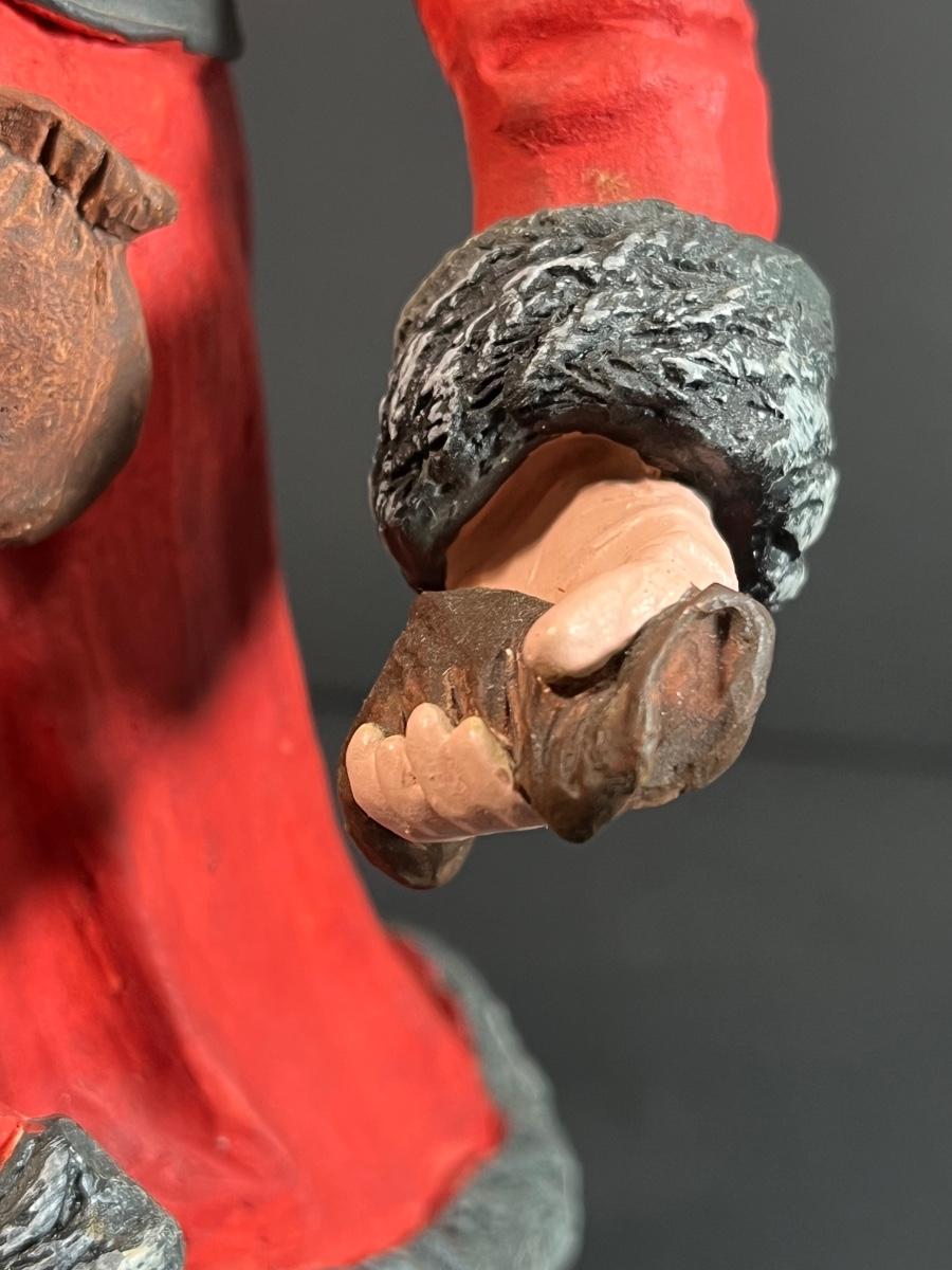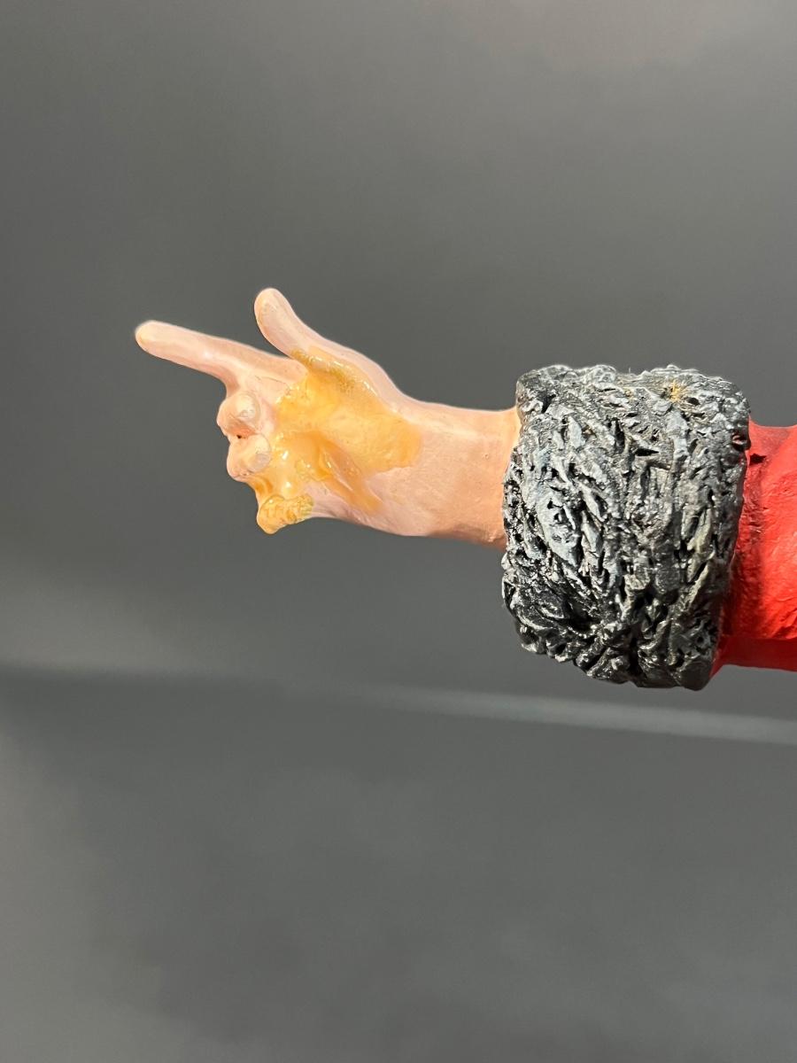 Appears to have had repairs made to his right hand with glue residue visible.