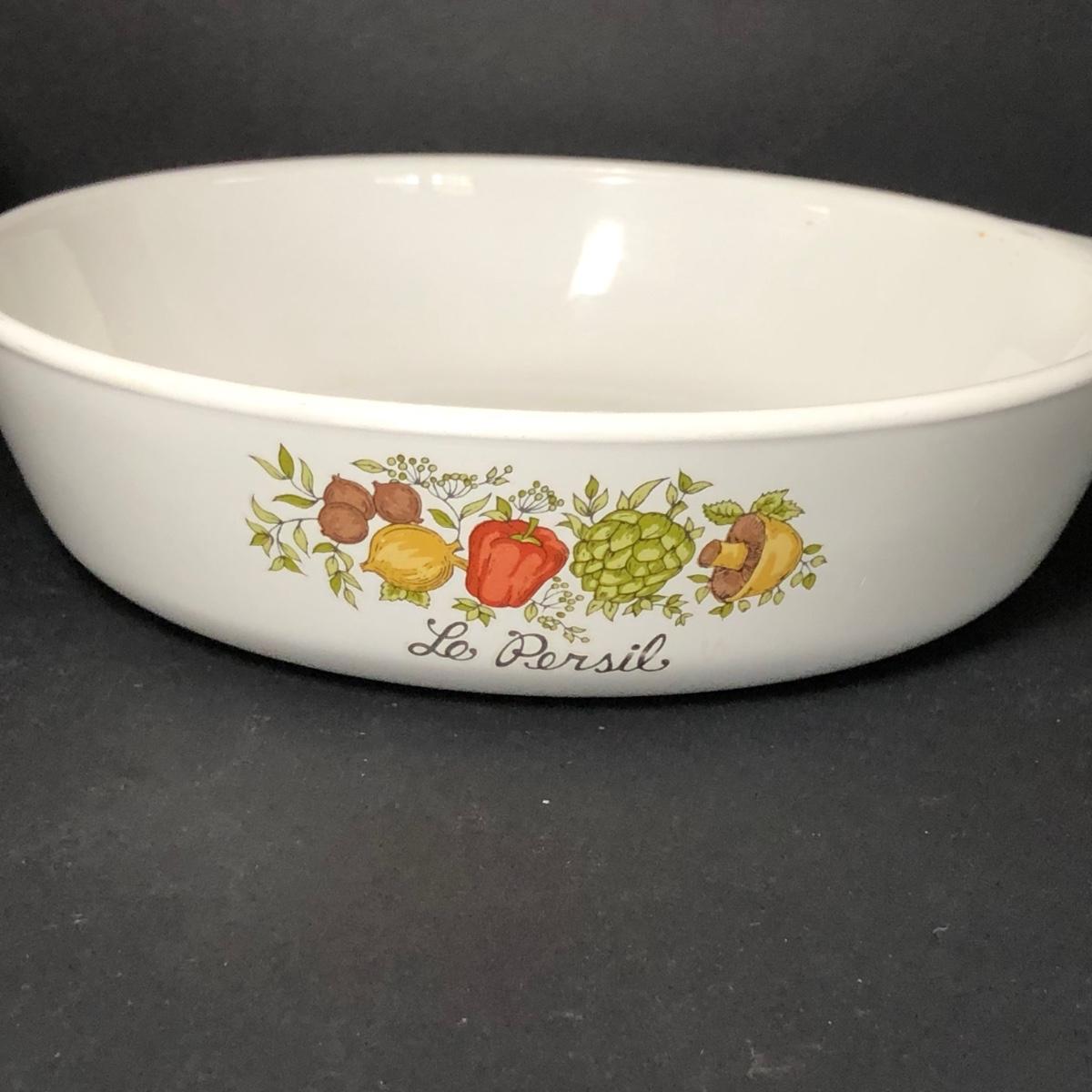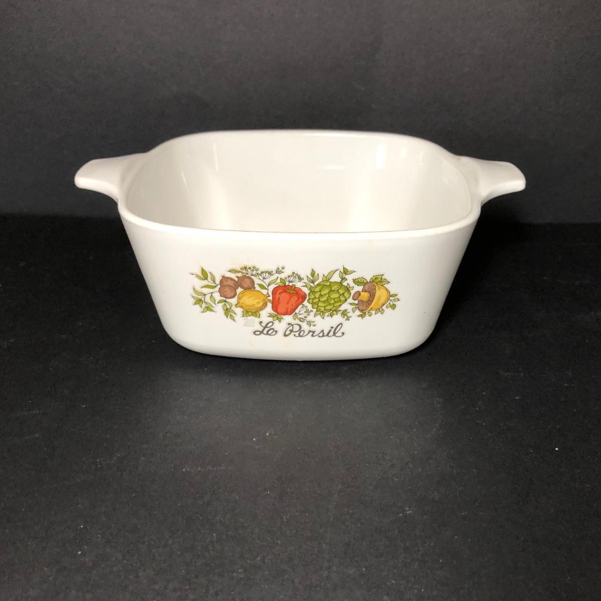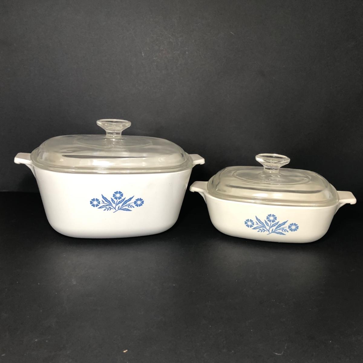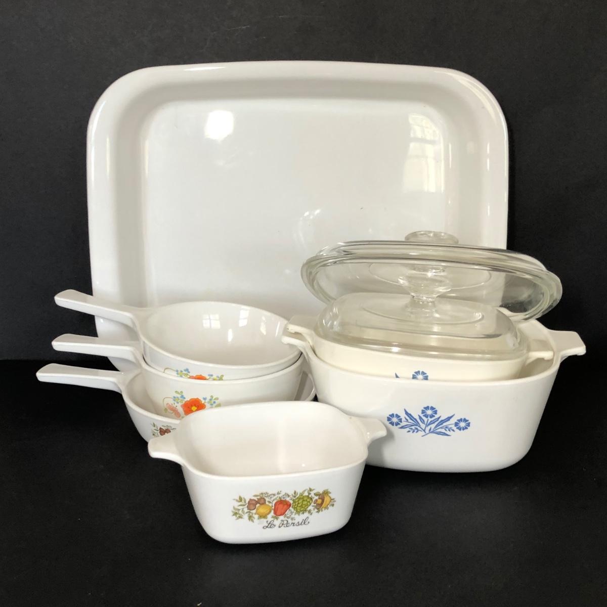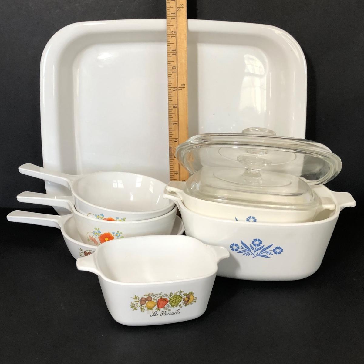 Includes three pieces of blue cornflower Corning Ware, two pieces of wildflower and two pieces of the Le Persil pattern.