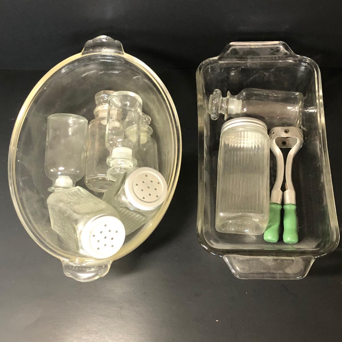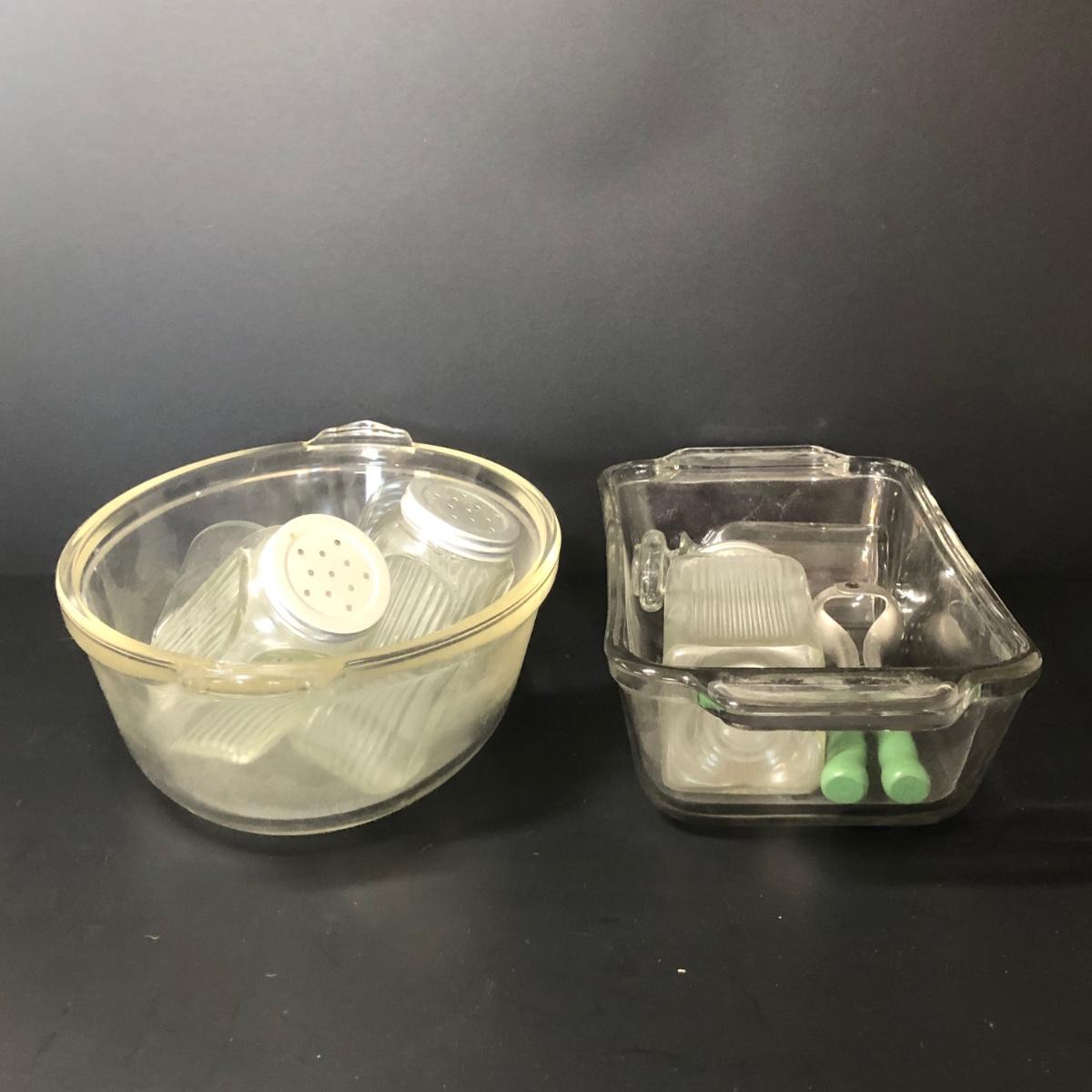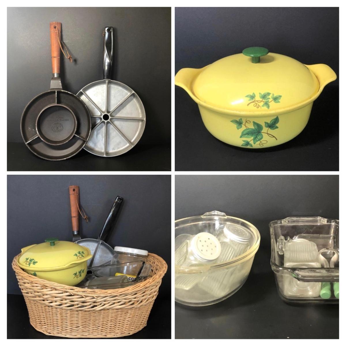 Also includes alt and pepper shakers, a large jar once used for olives, a yellow serving dish with green leaf accents, a glass loaf pan and a basket.