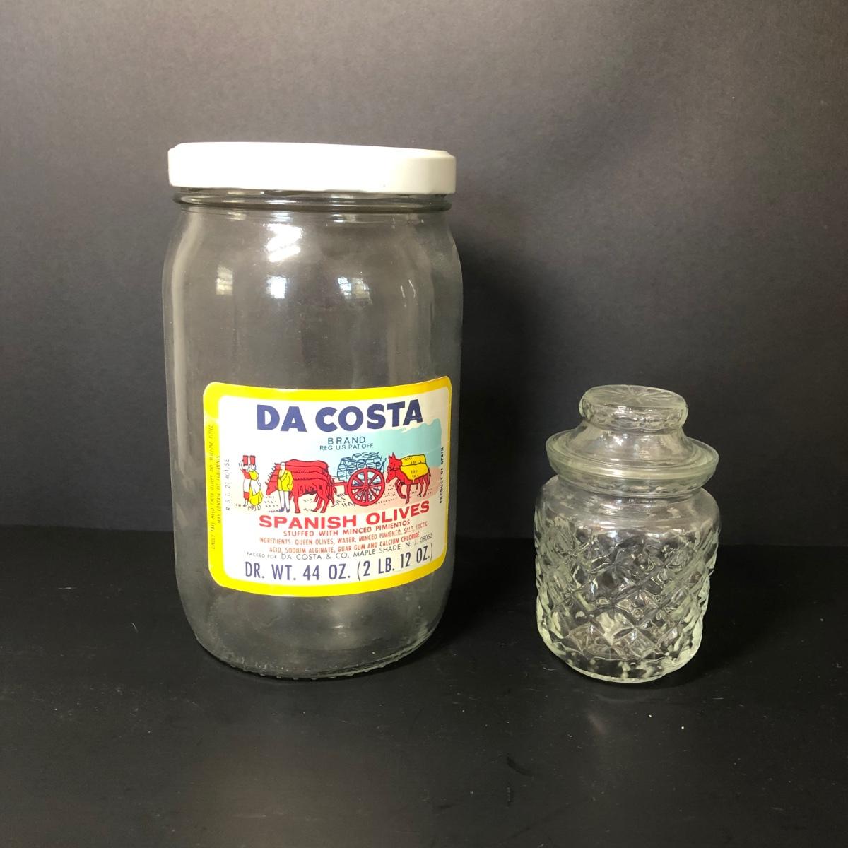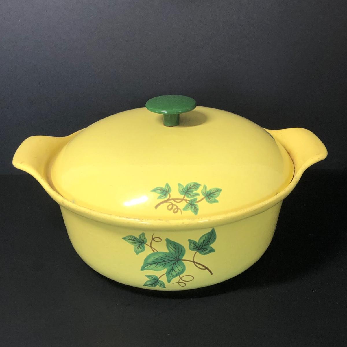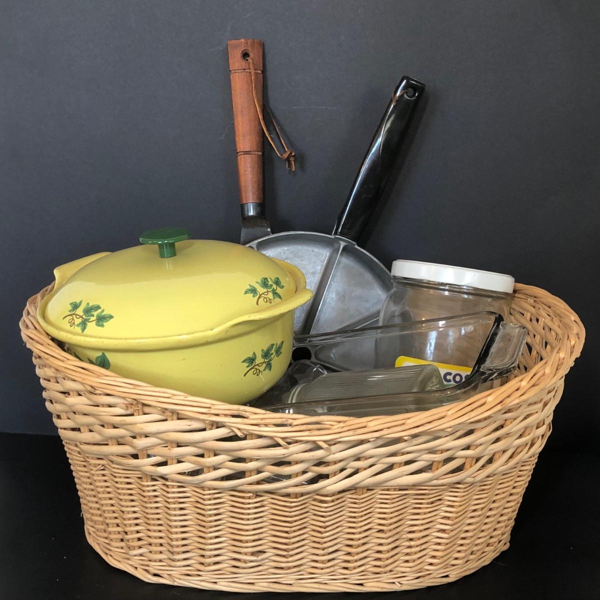 Also includes alt and pepper shakers, a large jar once used for olives, a yellow serving dish with green leaf accents, a glass loaf pan and a basket.
