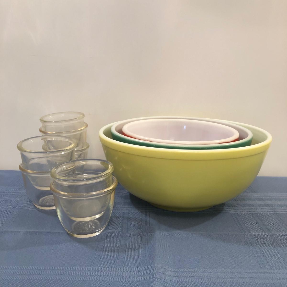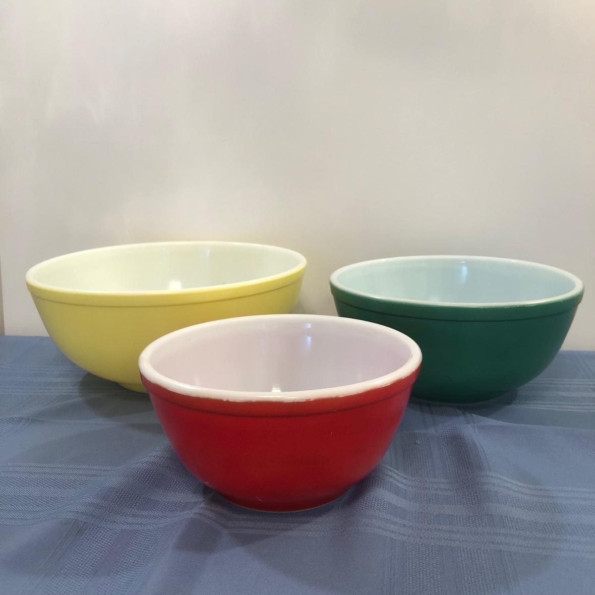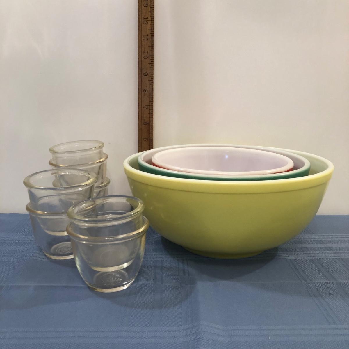 Includes three of the four bowls in the Pyrex primary color mixing bowl set, yellow, green & red. Also includes 7 small glass Pyrex baking dishes.