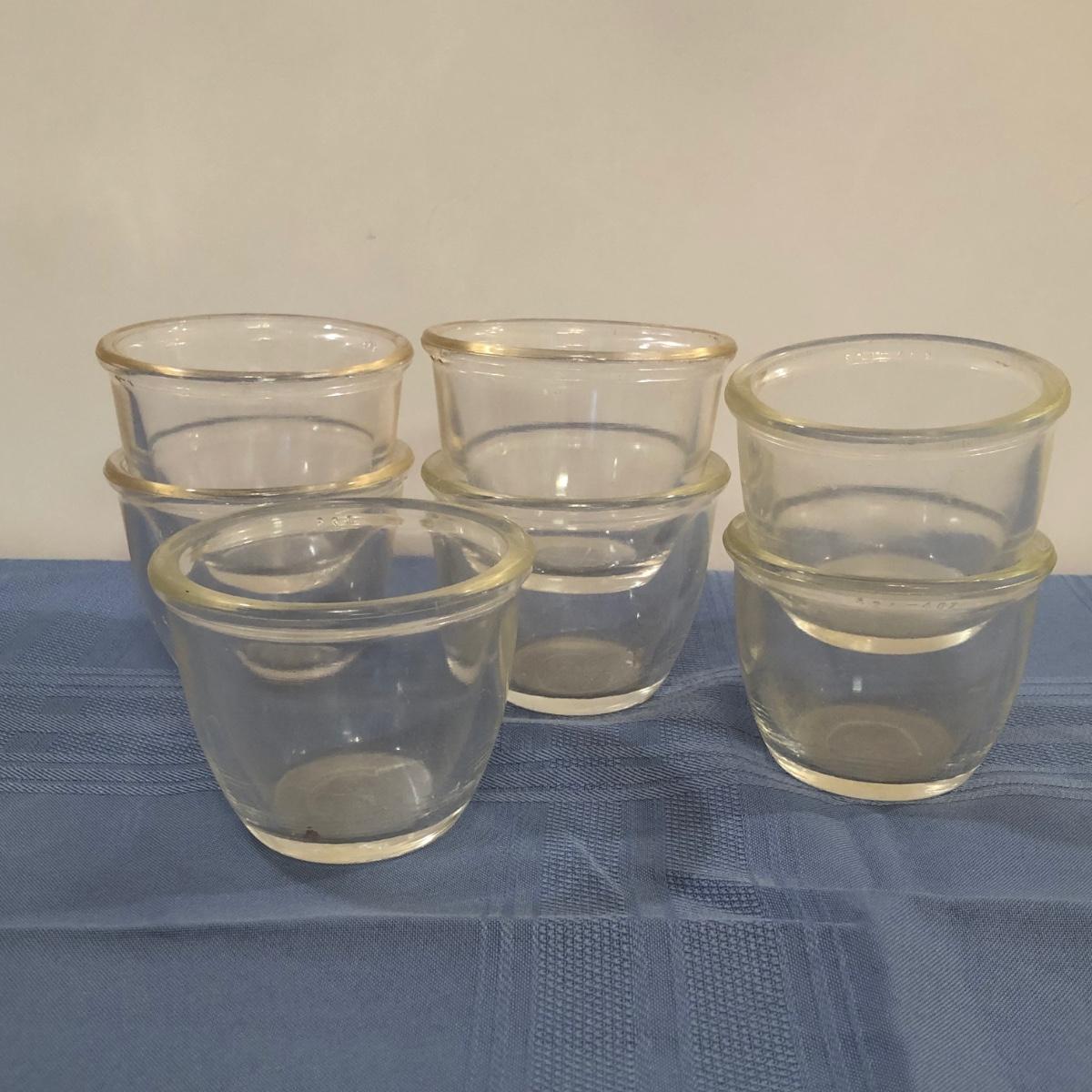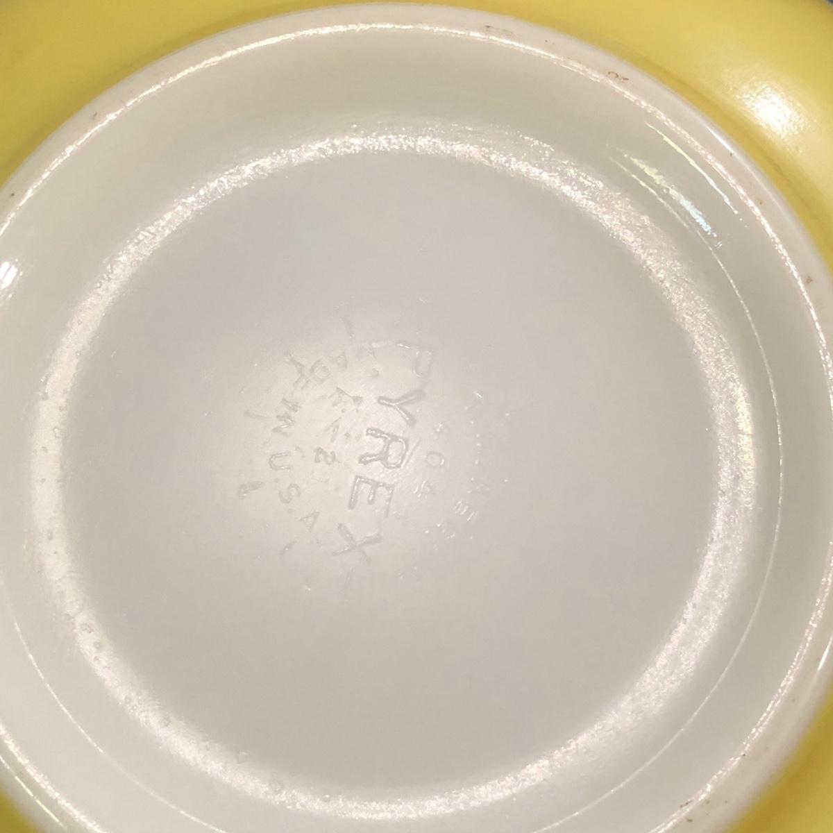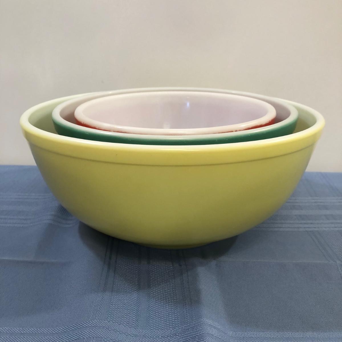 Includes three of the four bowls in the Pyrex primary color mixing bowl set, yellow, green & red. Also includes 7 small glass Pyrex baking dishes.