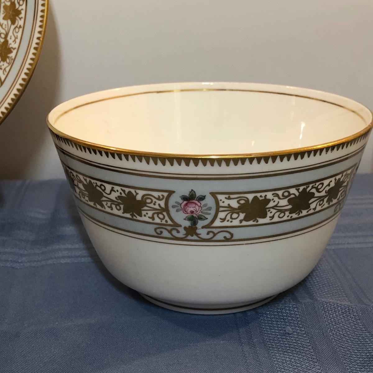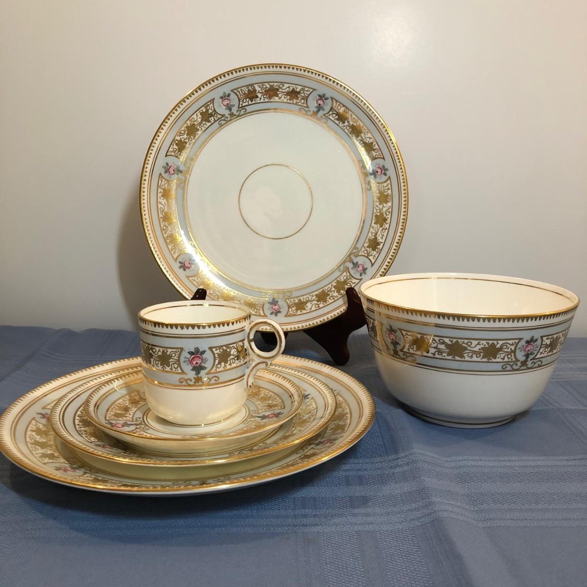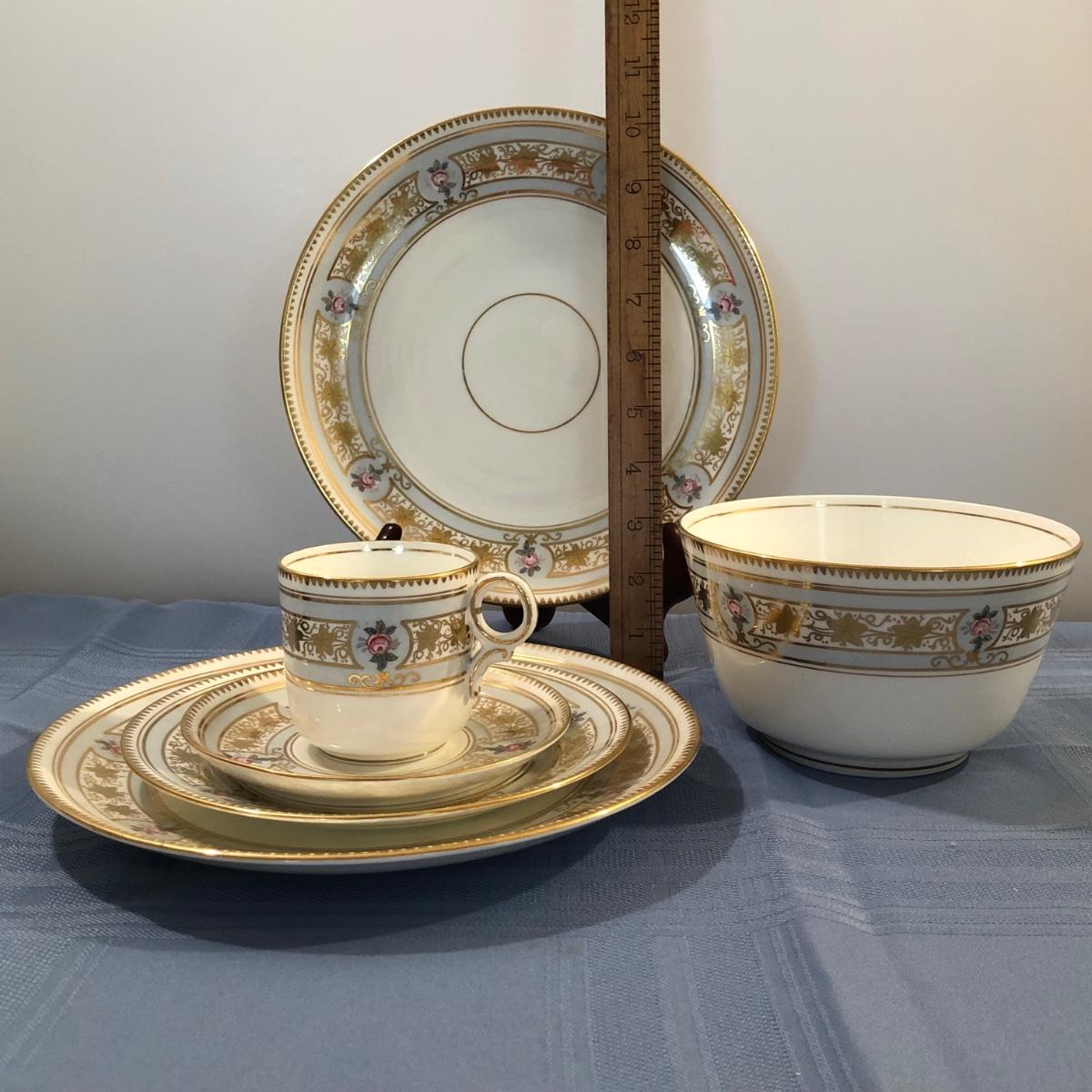This collection includes 2 dinner plates, 10 medium plates, 10 saucers, 10 tea cups, and one large bowl.