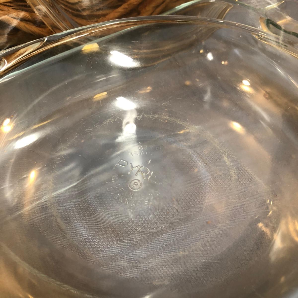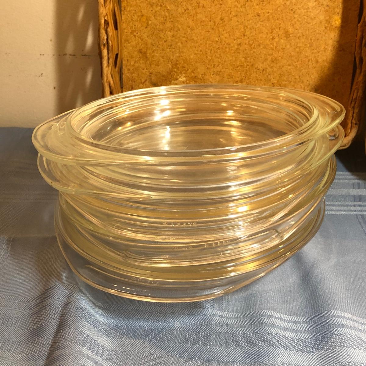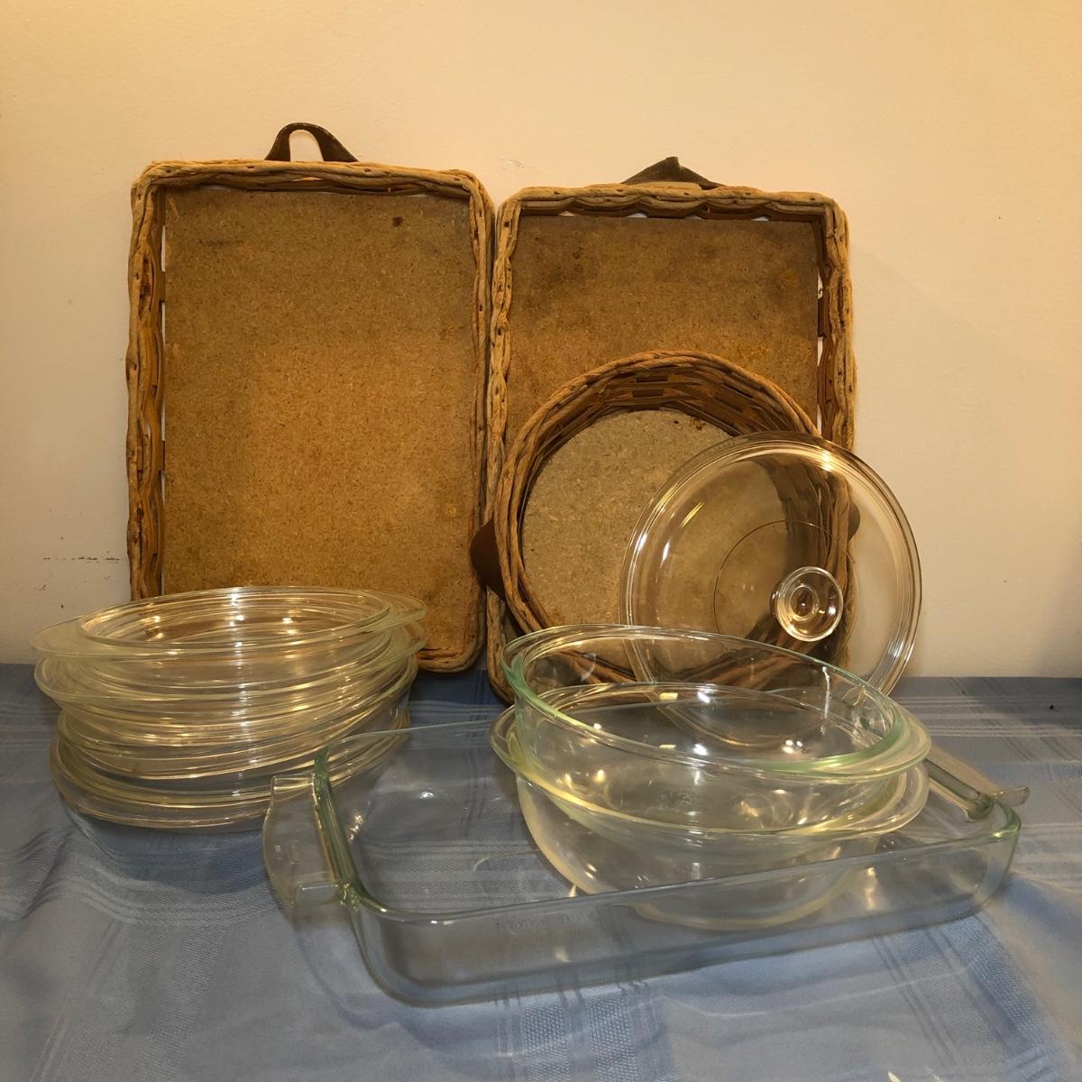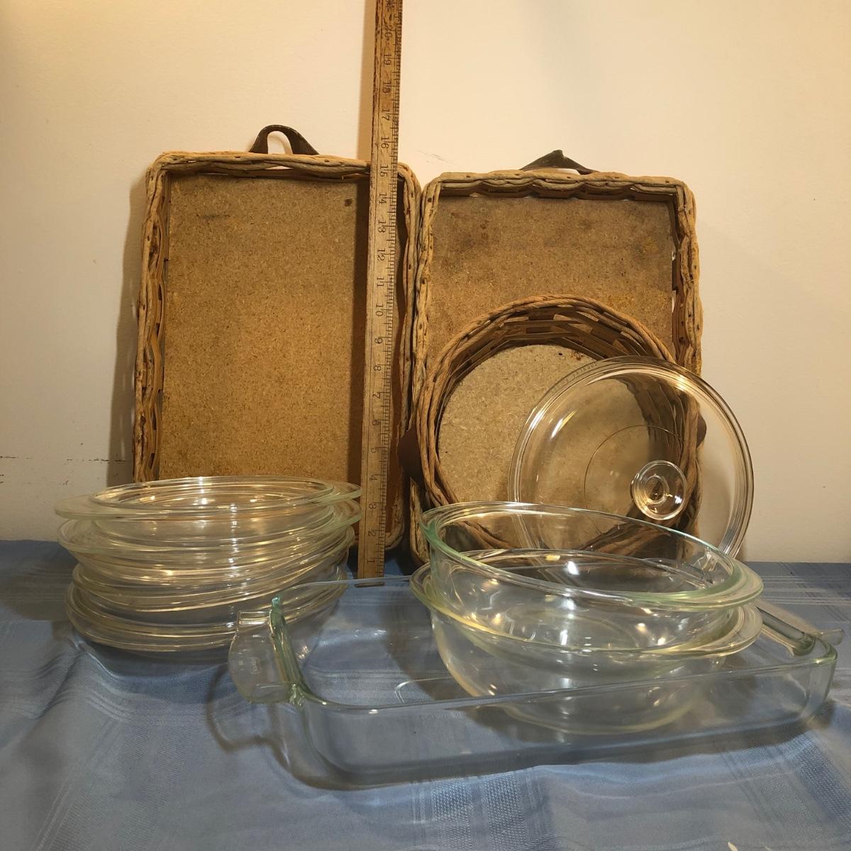 Includes a collection of circular Pyrex baking dishes and one larger rectangular dish. Three baskets are included.