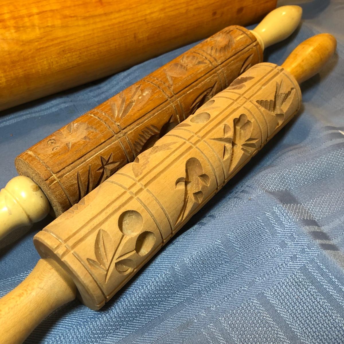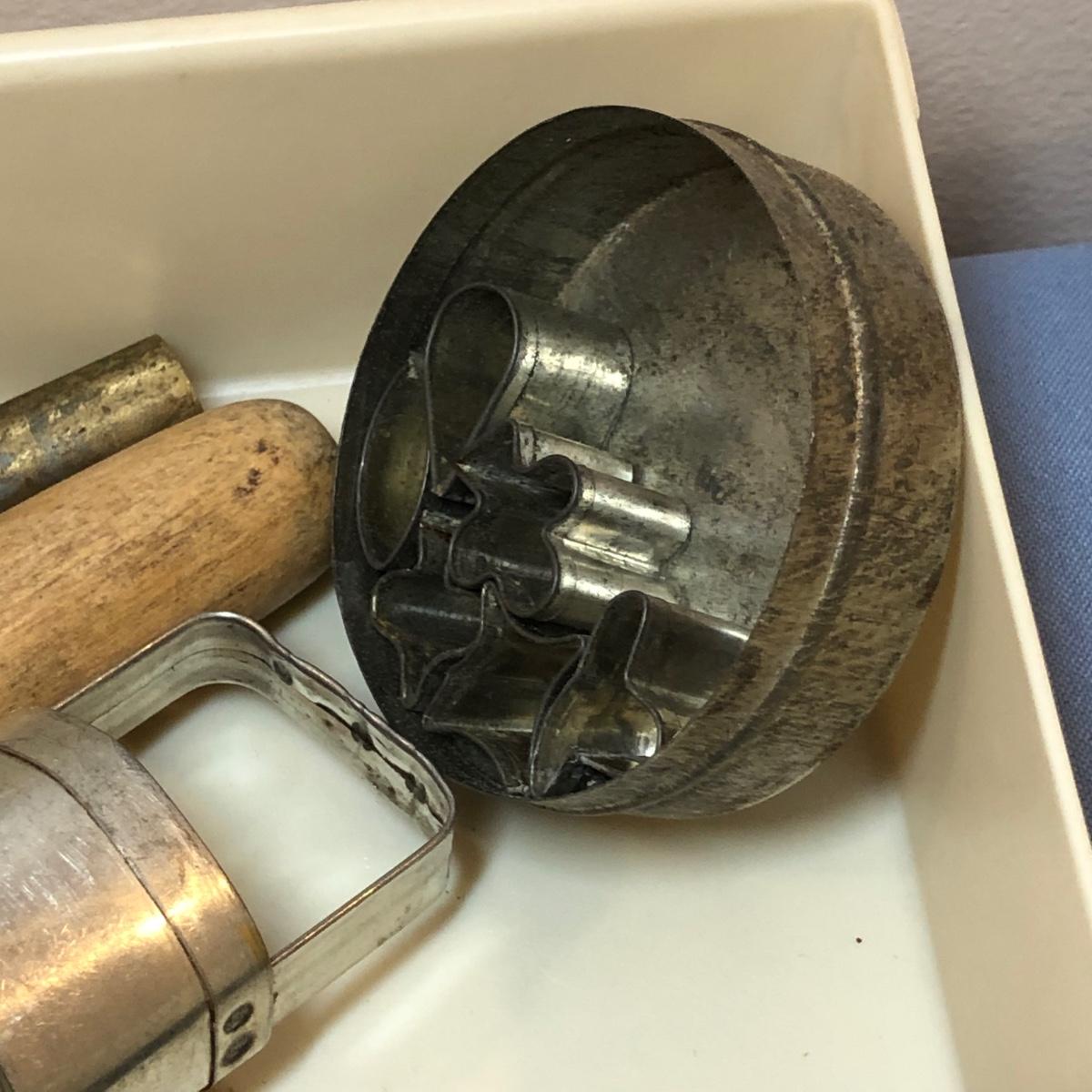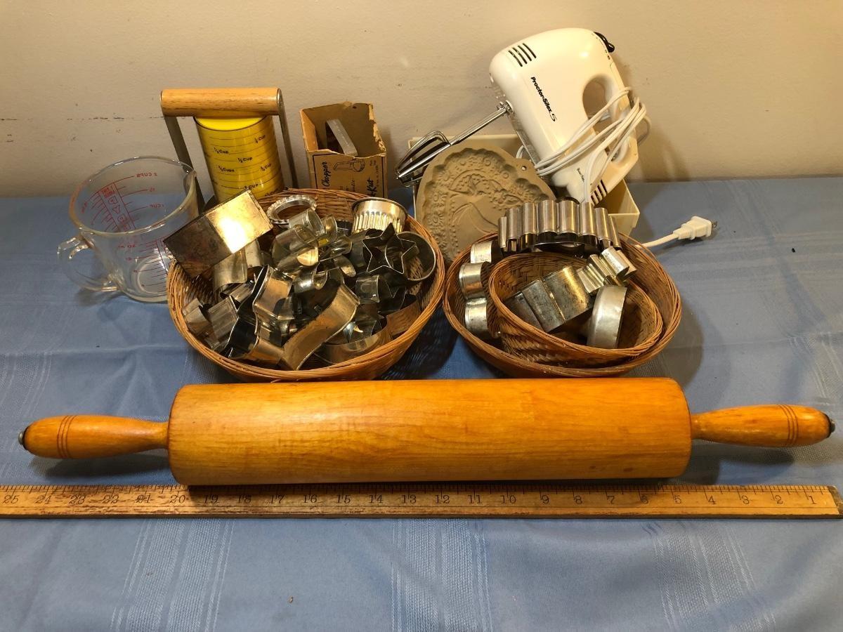 LOT 16M: Baking Collection: 25" Rolling Pin, Engraved Embossing Kitchen Tools, Cookie Cutters, Proctor-Silex 5 Hand Mixer Model 62515RY & More