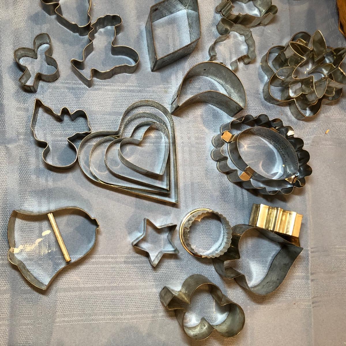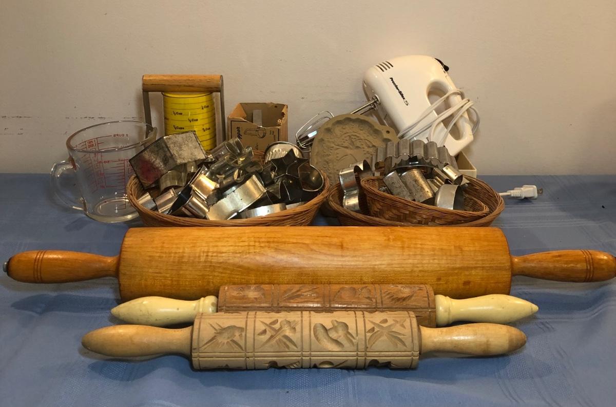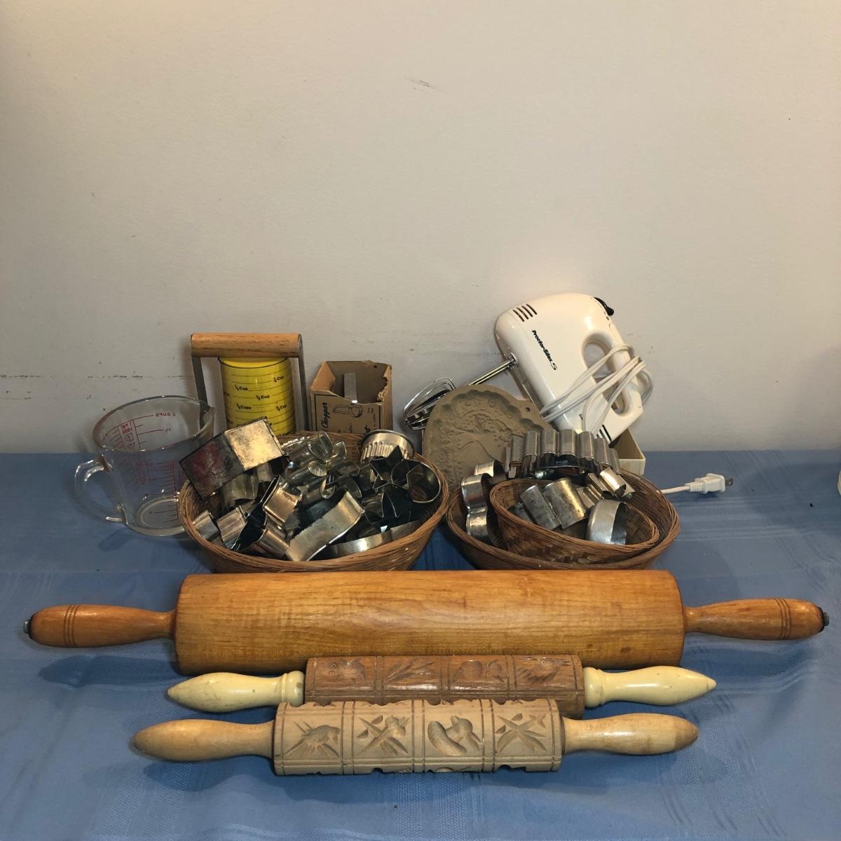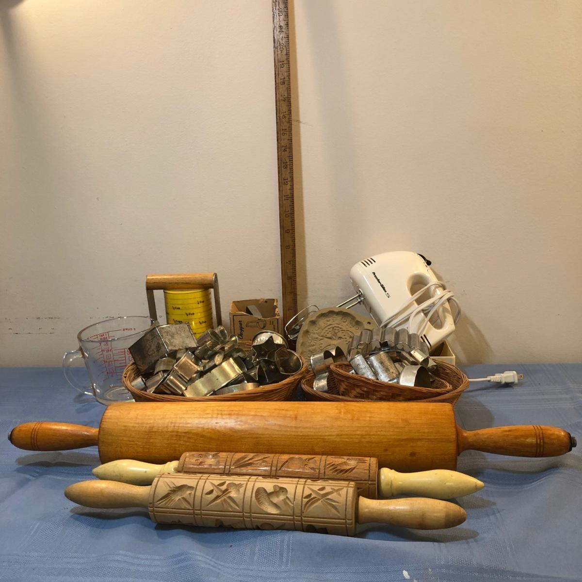 Collection of baking items includes a hand mixer, three rolling pins, baskets of cookie cutters, pastry tools, a Pyrex measuring cup & more.