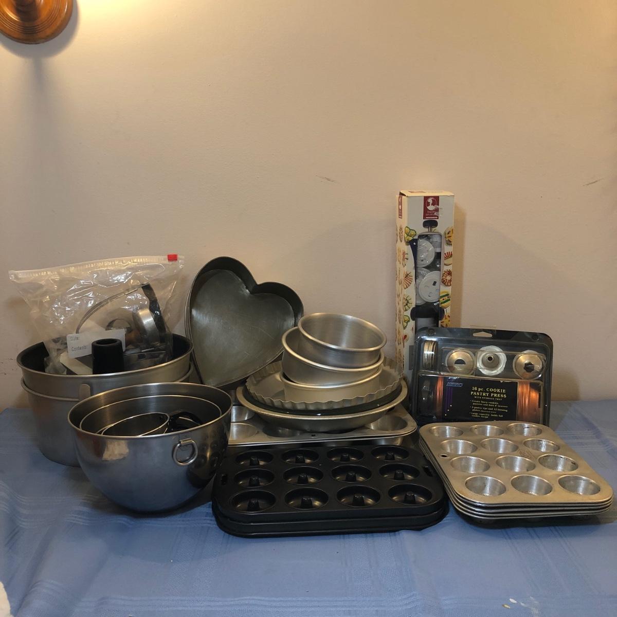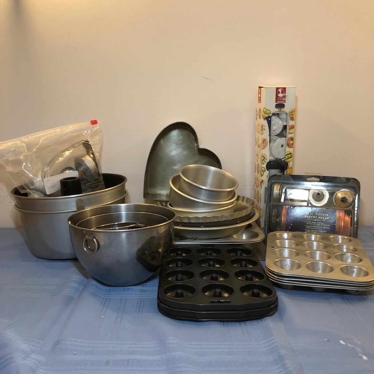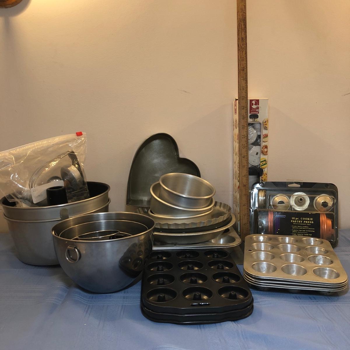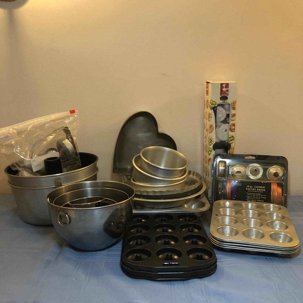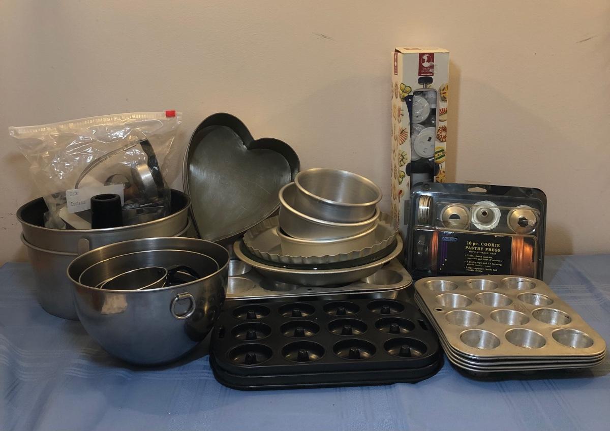 Includes several cupcake pans, cake pans, mixing bowls, donut pans, and two different types of cookie presses.