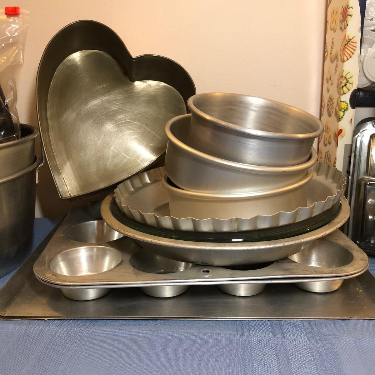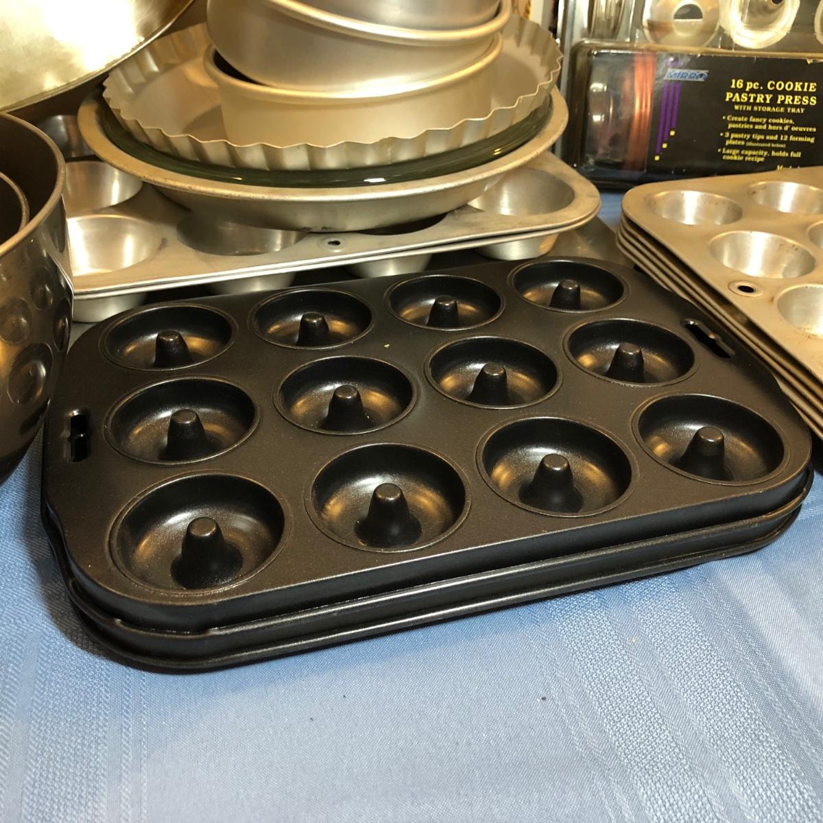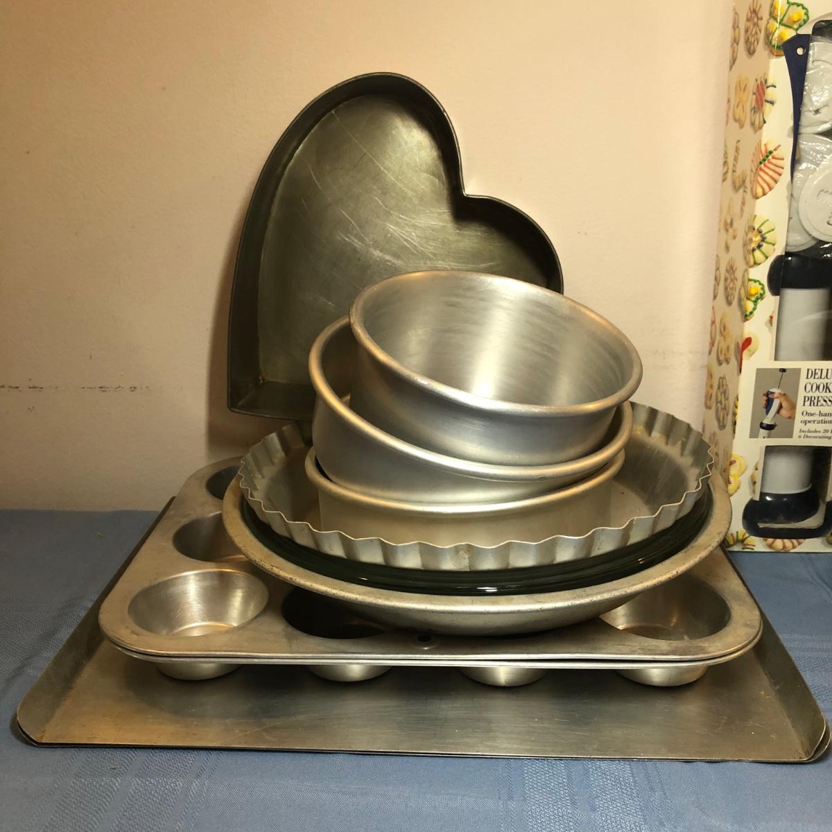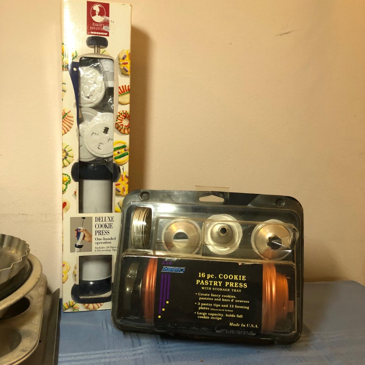 Includes several cupcake pans, cake pans, mixing bowls, donut pans, and two different types of cookie presses.