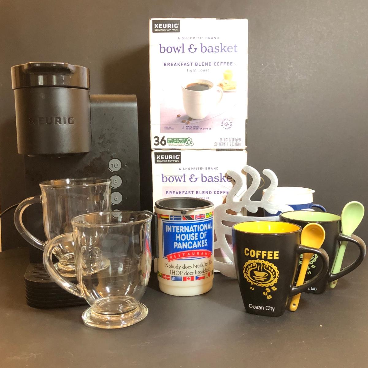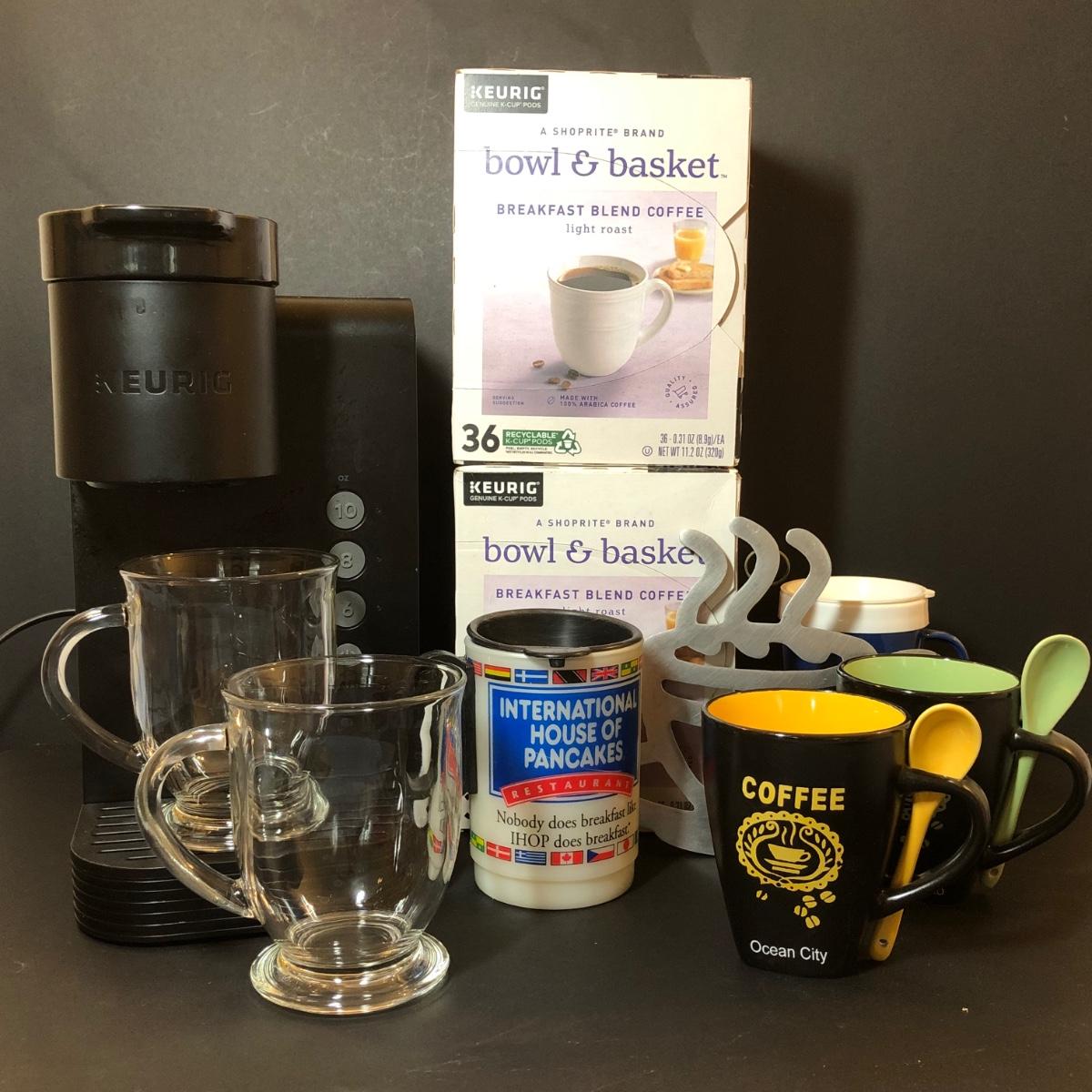 Keurig untested but in good condition. Bowl & Basket k-cups are unopened and still in date. Includes two Ocean City mugs with spoons, a coffee pot stand, and other mugs.