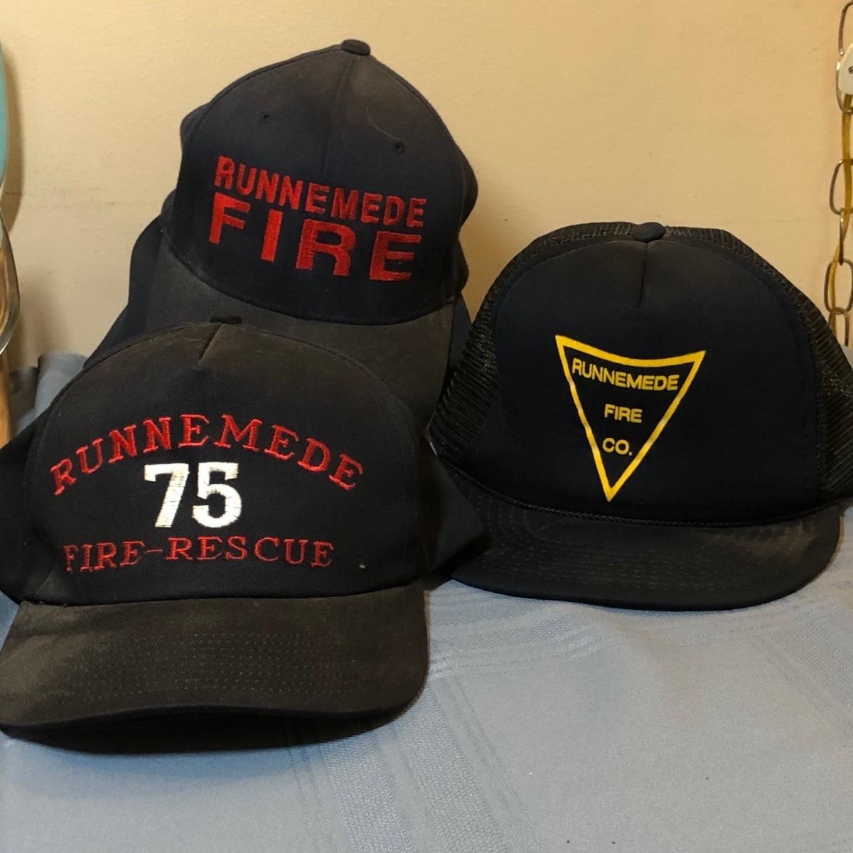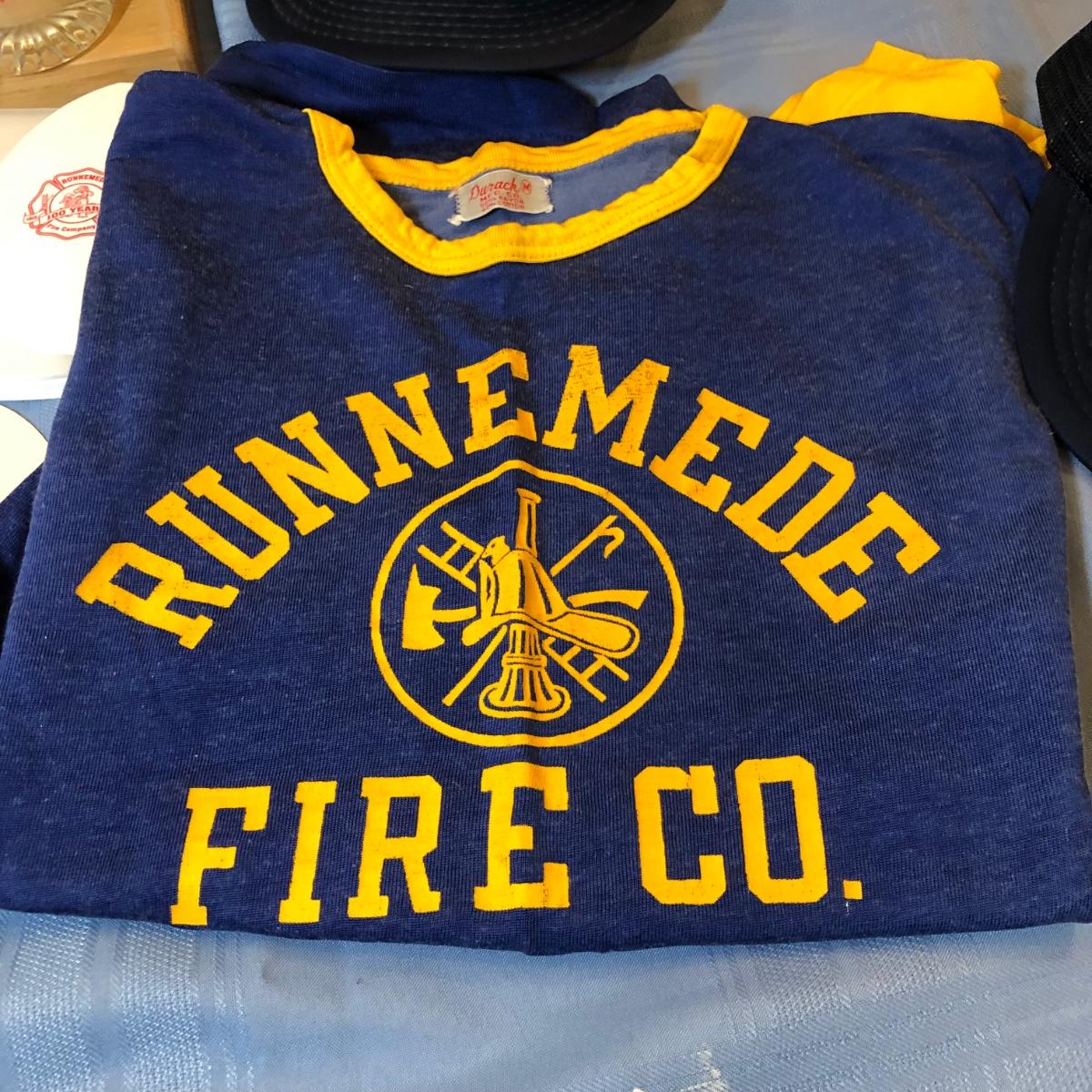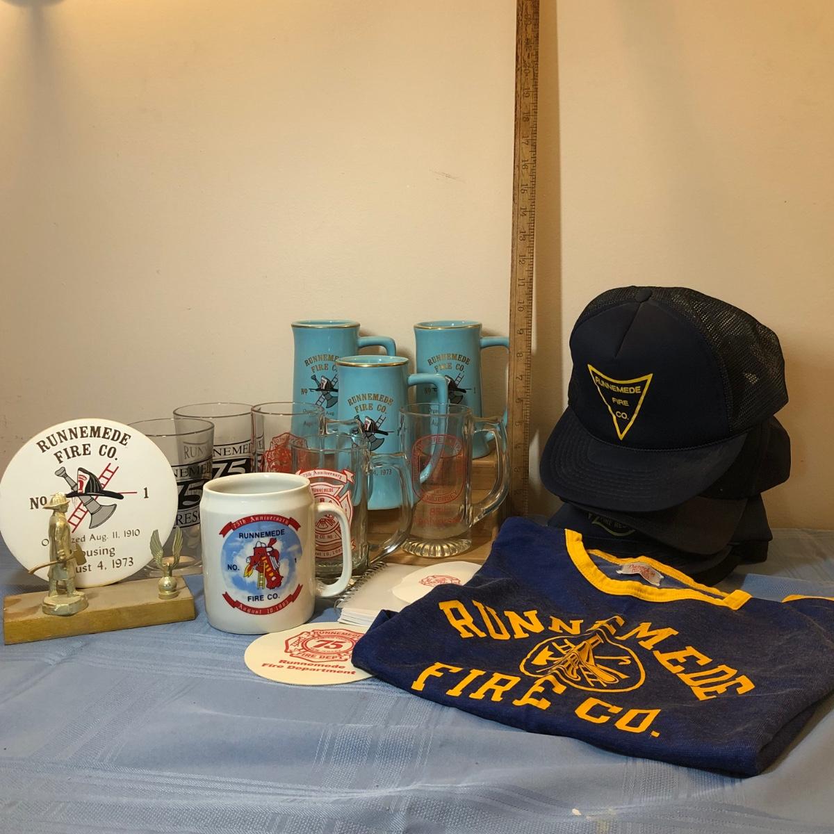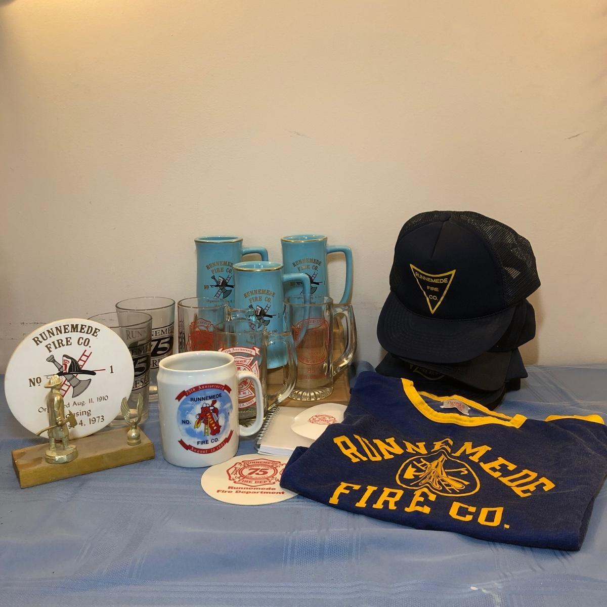 Includes several commemorative mugs from Runnemede Fire Company, a few hats, and a baseball shirt sized medium.
