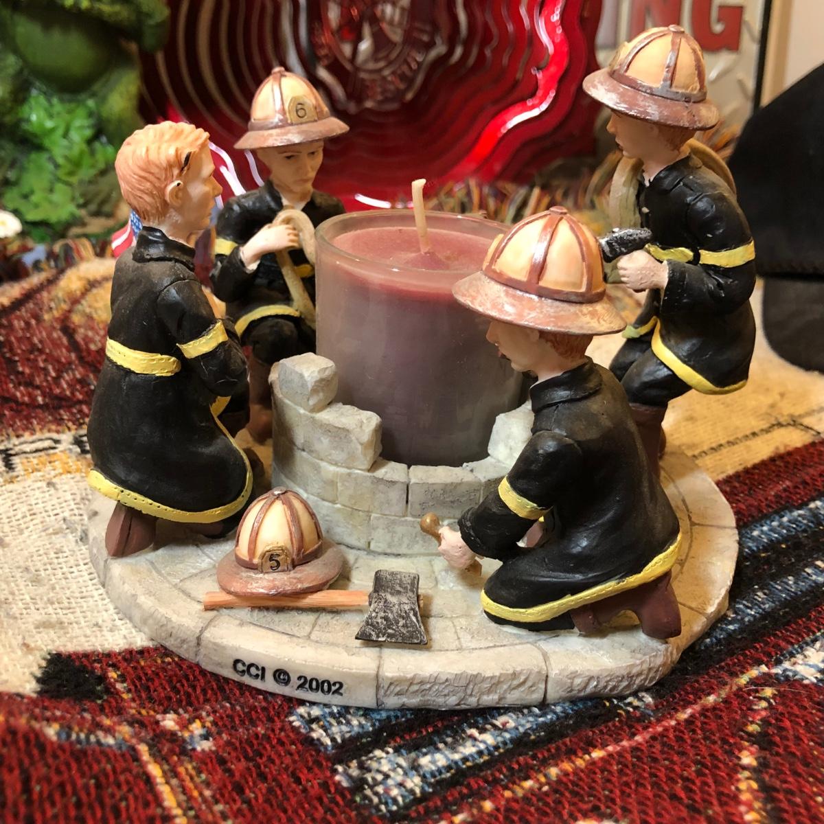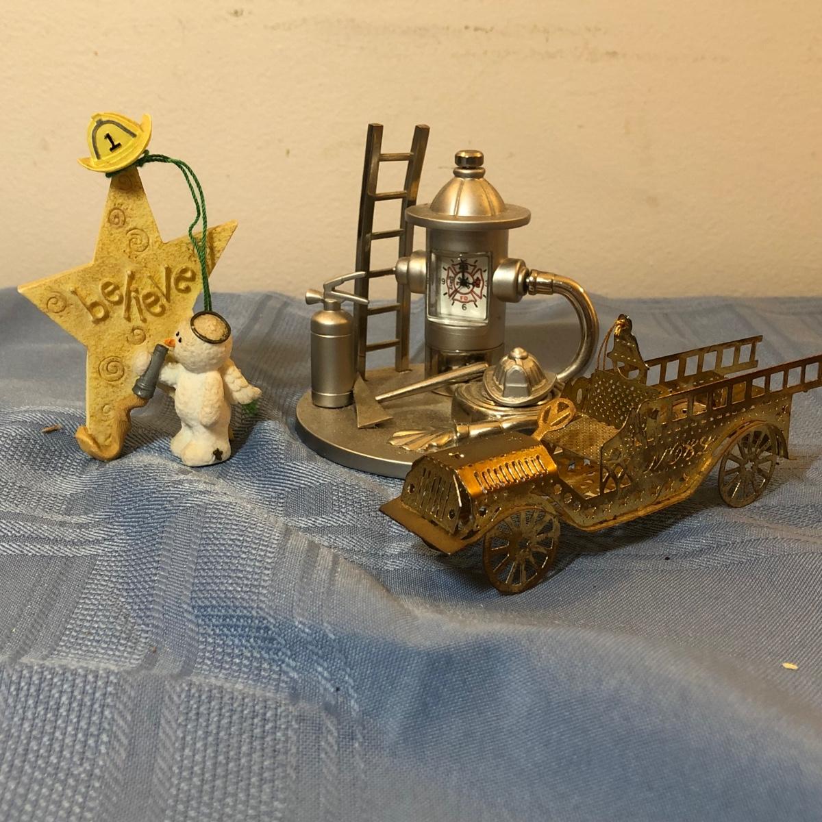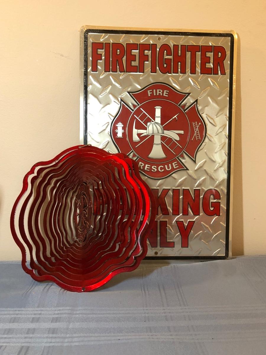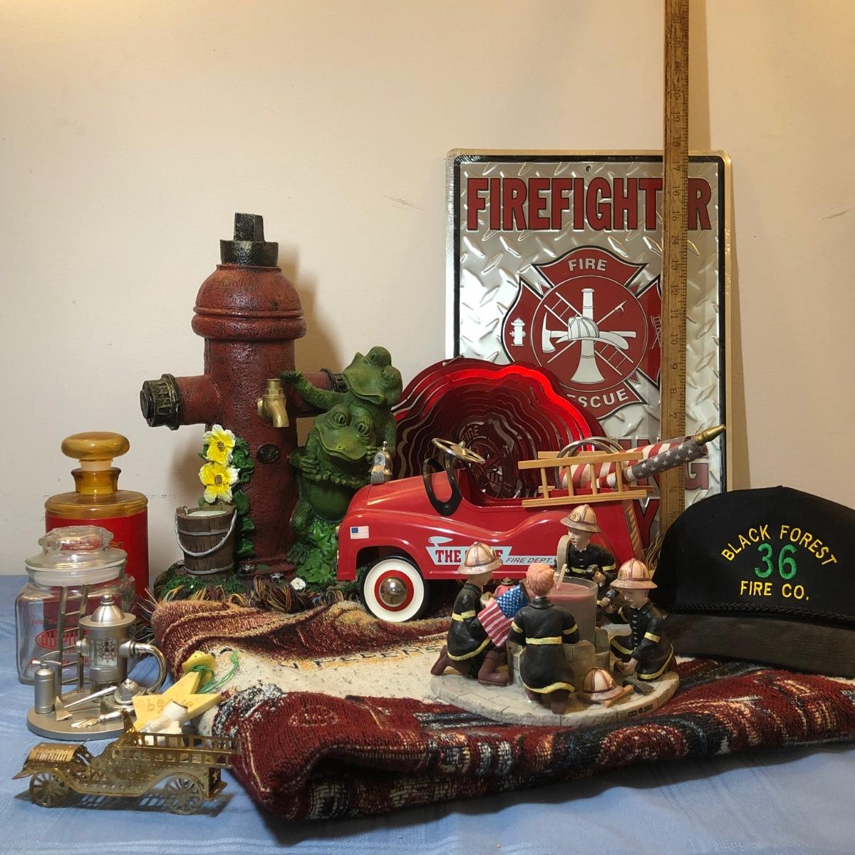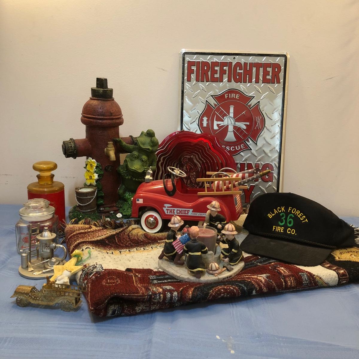 LOT 25M: Firefighter Decor Collection: Throw Blanket, Candle Holder, Sign, Frog w/ Hydrant & More