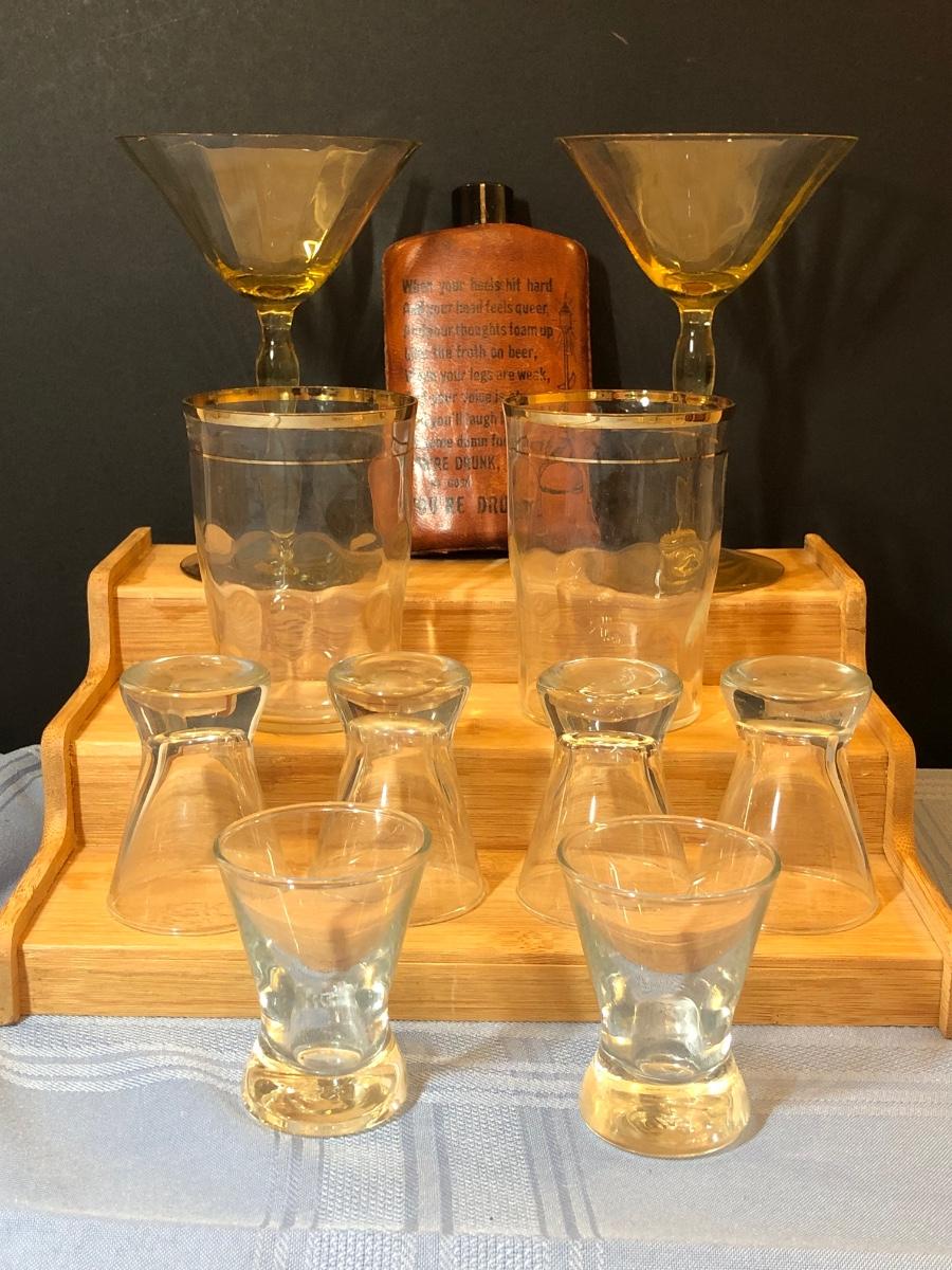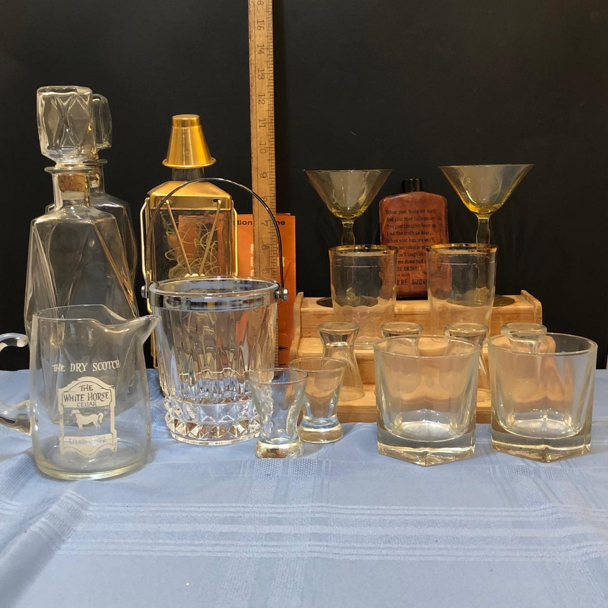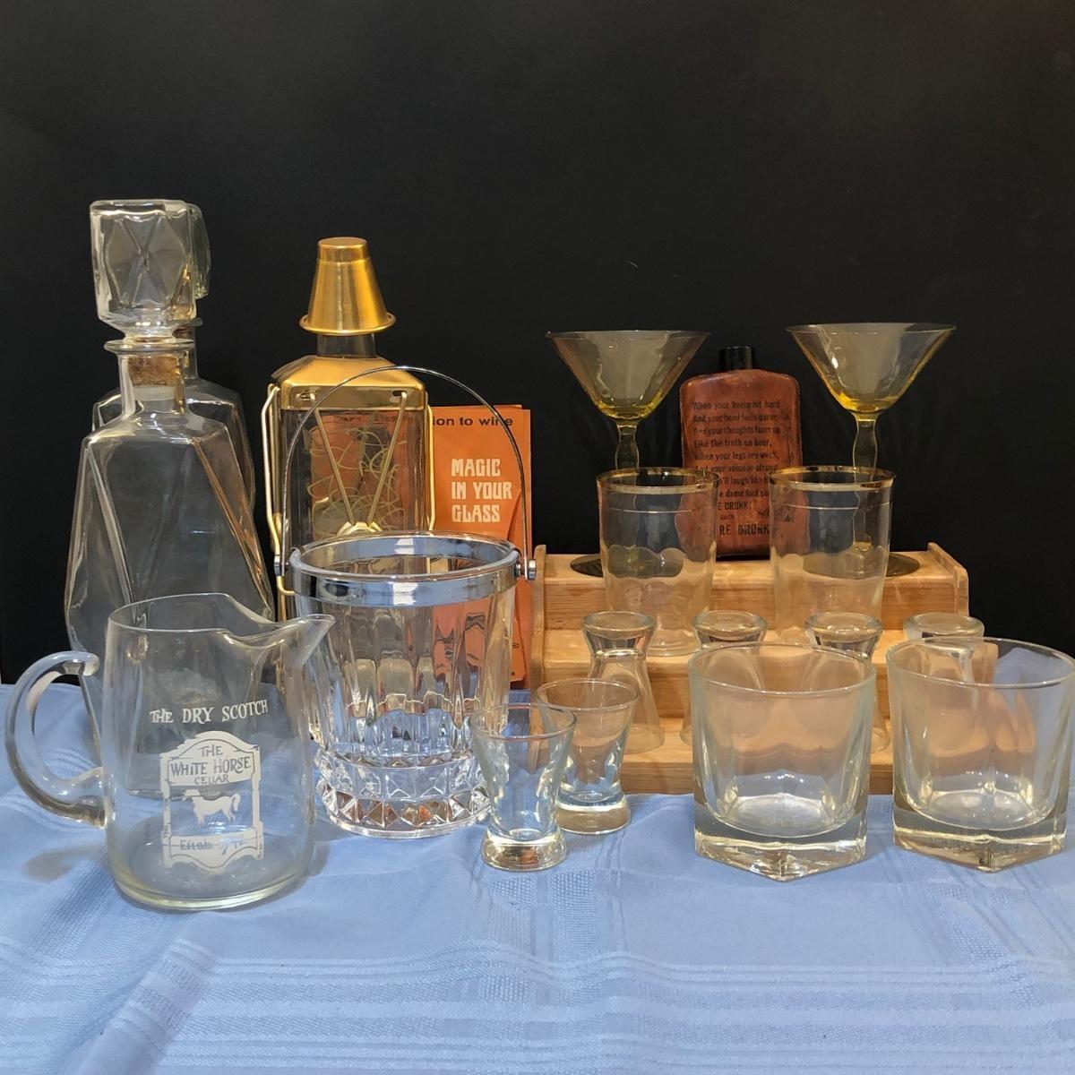 Includes two decanters, one which looks like a lantern. Also includes Shot glasses, martini glasses, a flask, and other glassware.