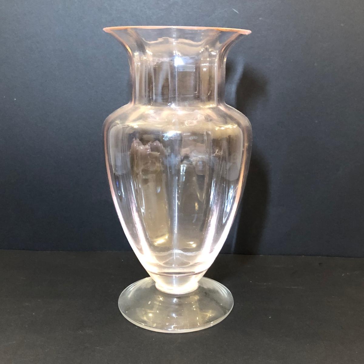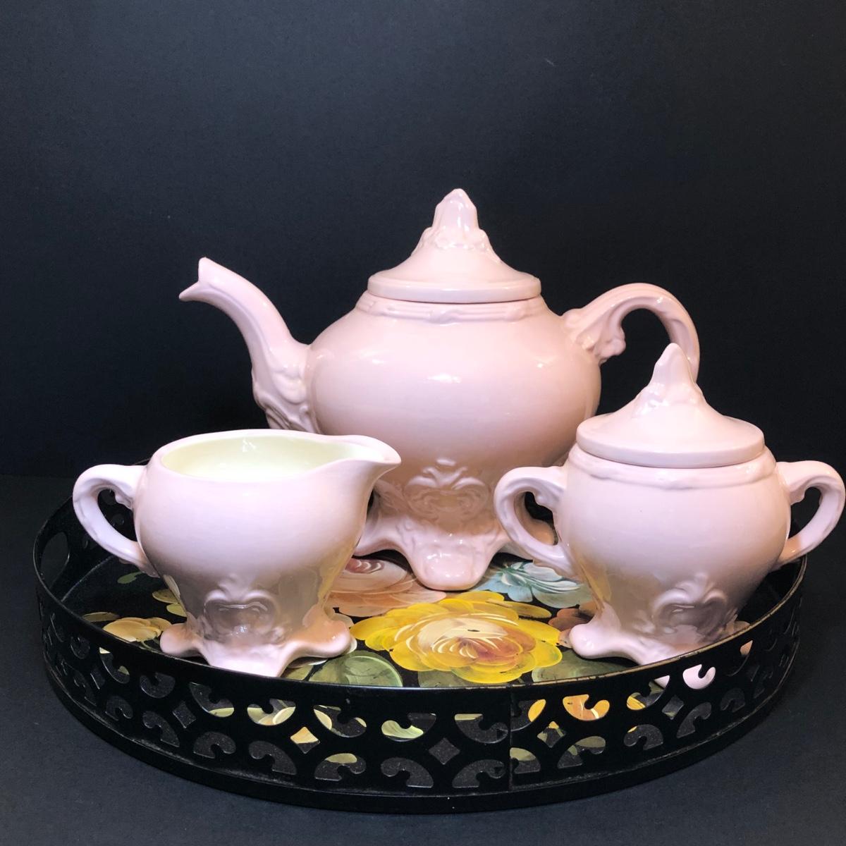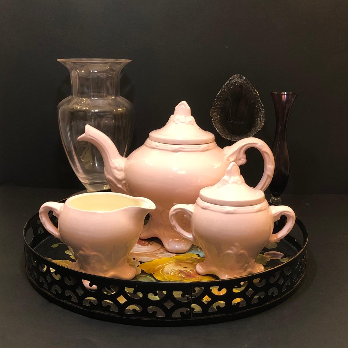 Includes a pink tea pot with matching creamer and sugar bowl signed L. Scott, February 4, 1969. Two pieces of amethyst glass. One clear glass vase and a black tray with a colorful floral design.