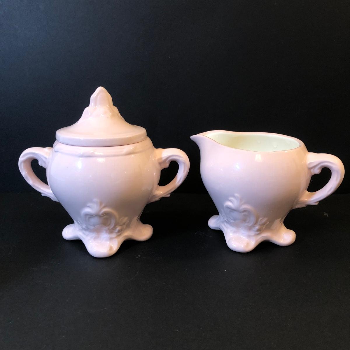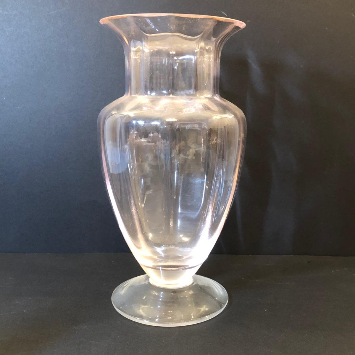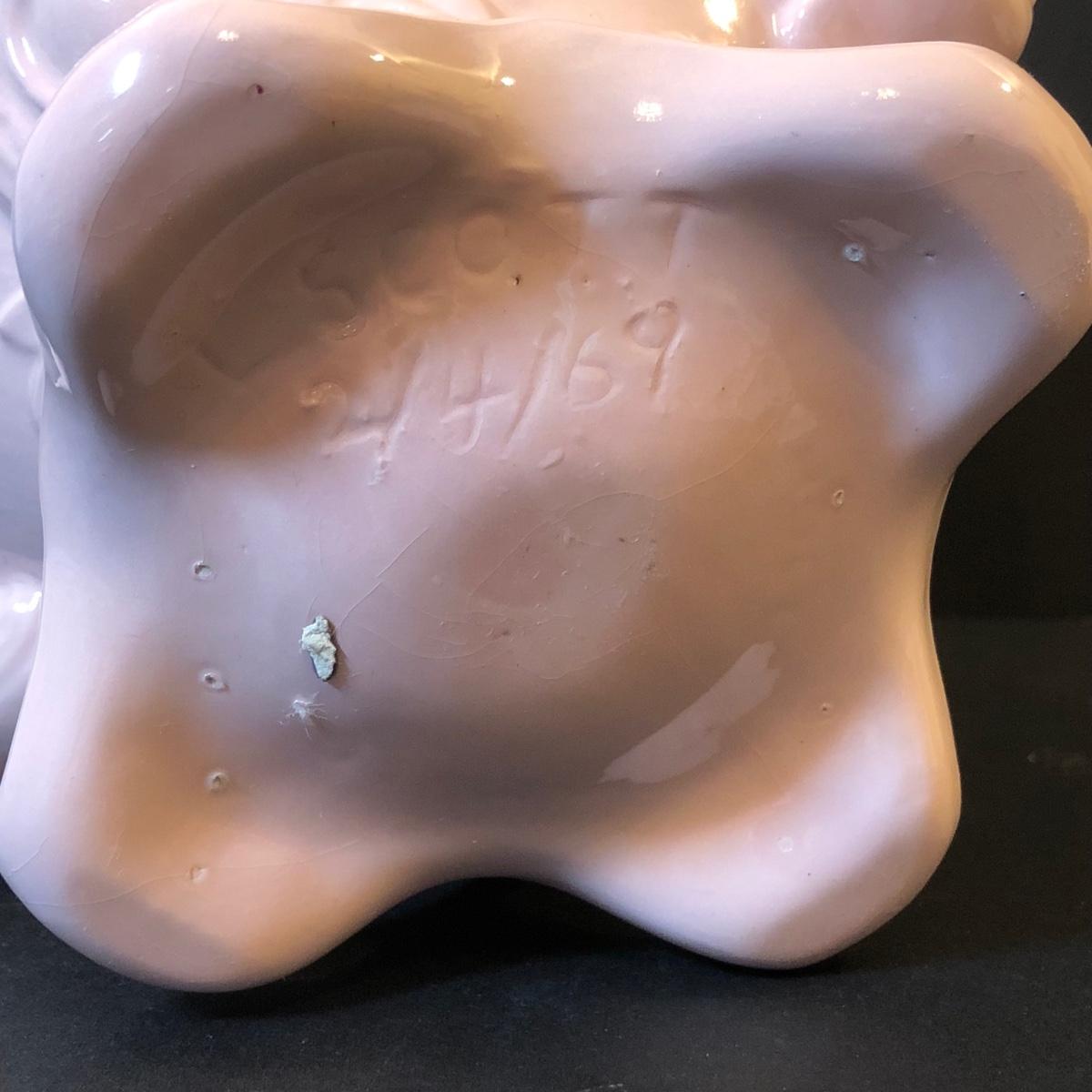 Includes a pink tea pot with matching creamer and sugar bowl signed L. Scott, February 4, 1969. Two pieces of amethyst glass. One clear glass vase and a black tray with a colorful floral design.