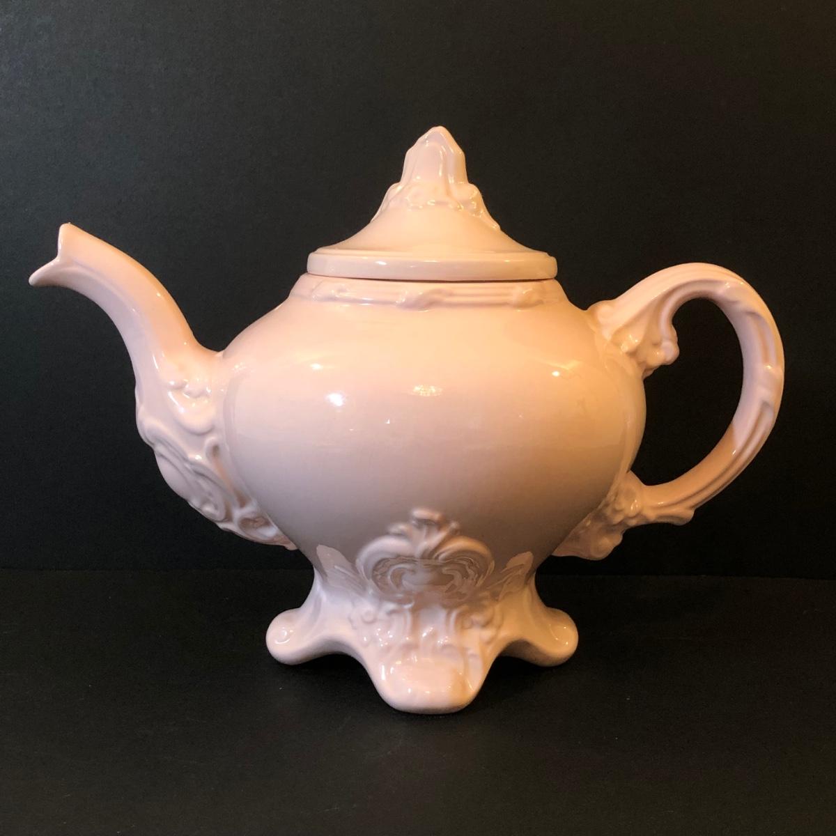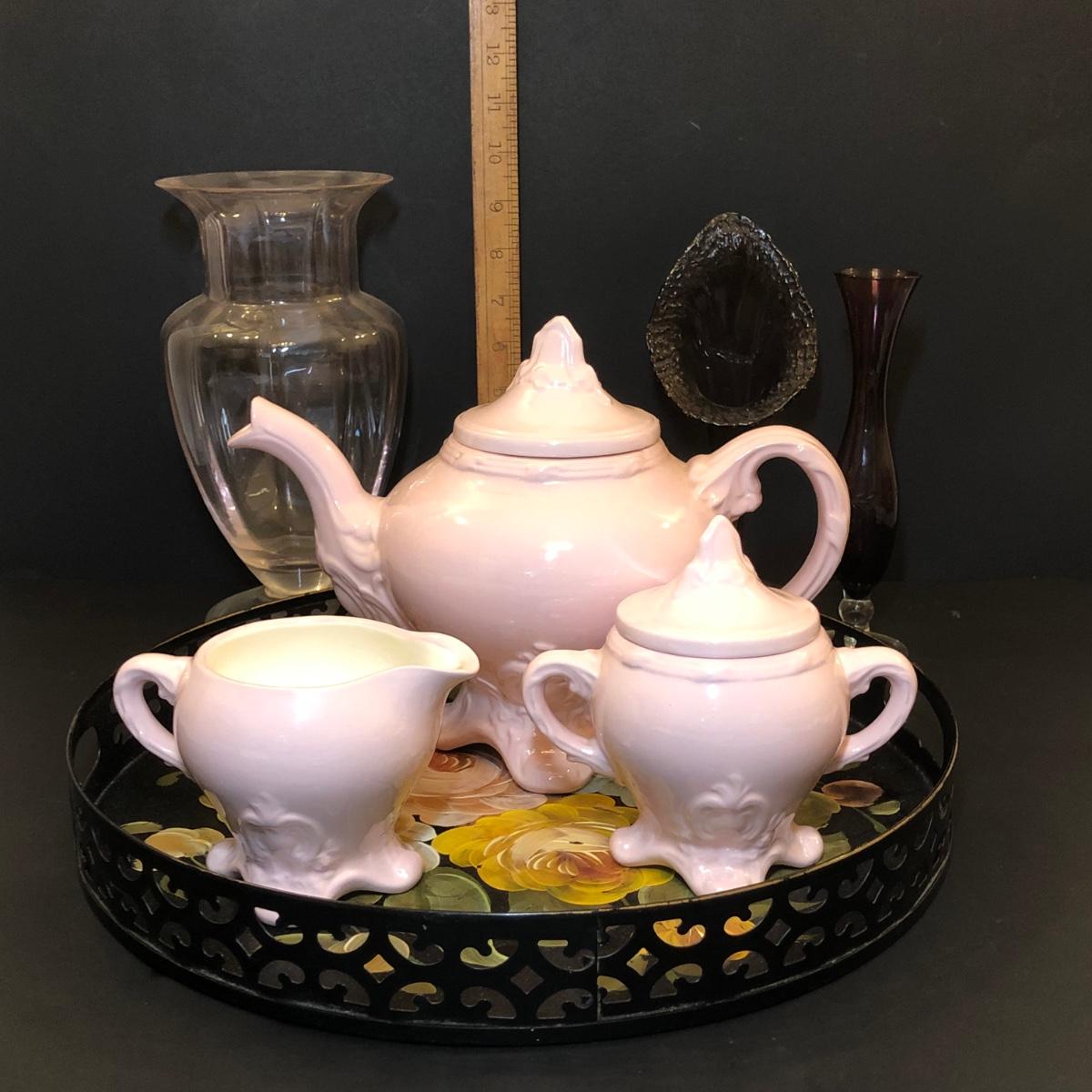 LOT 33M: Signed Pottery Tea Set, Amethyst Glass Pieces, Glass Vase & Floral Tray
