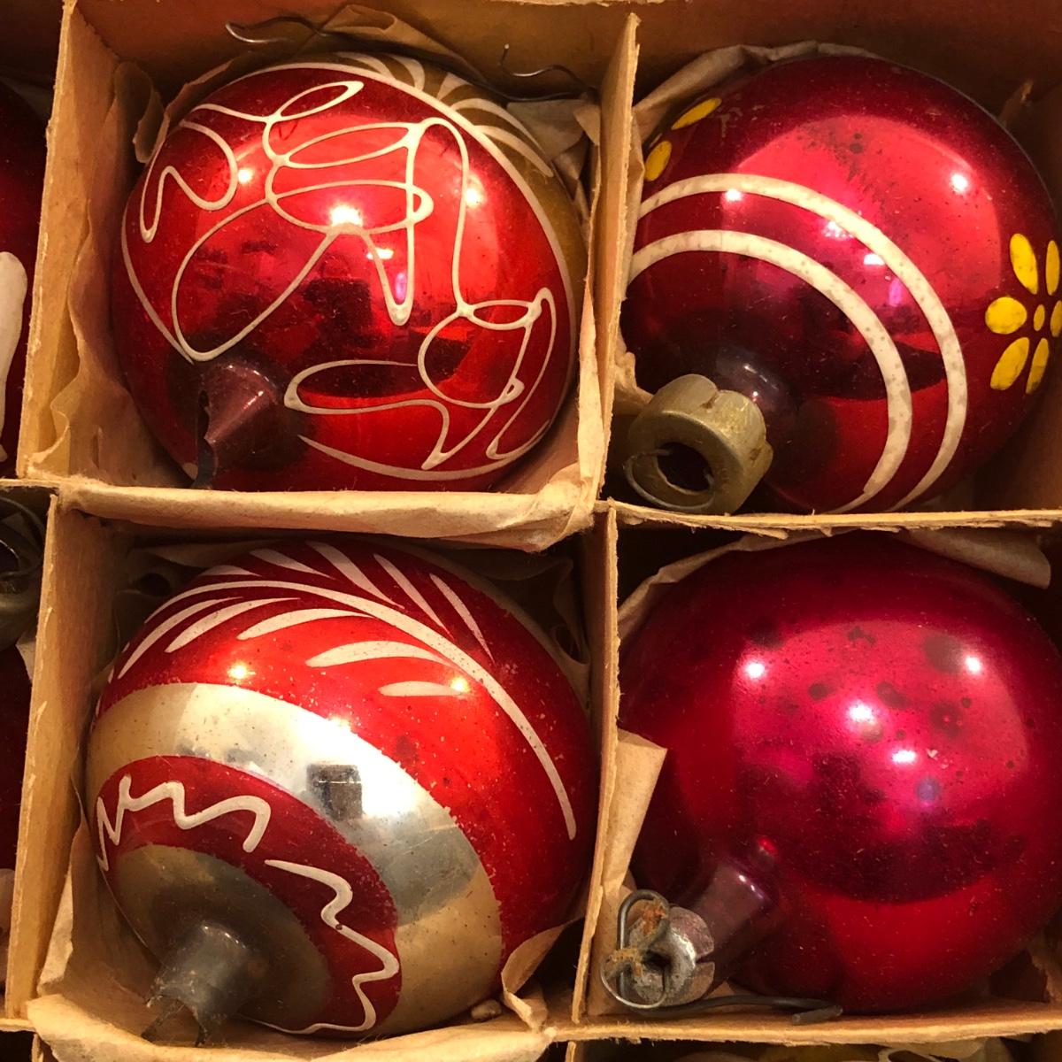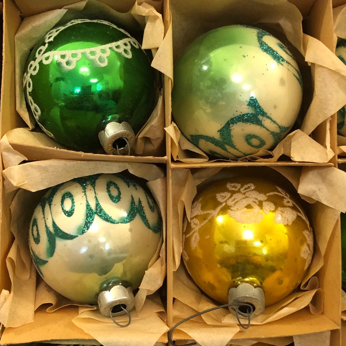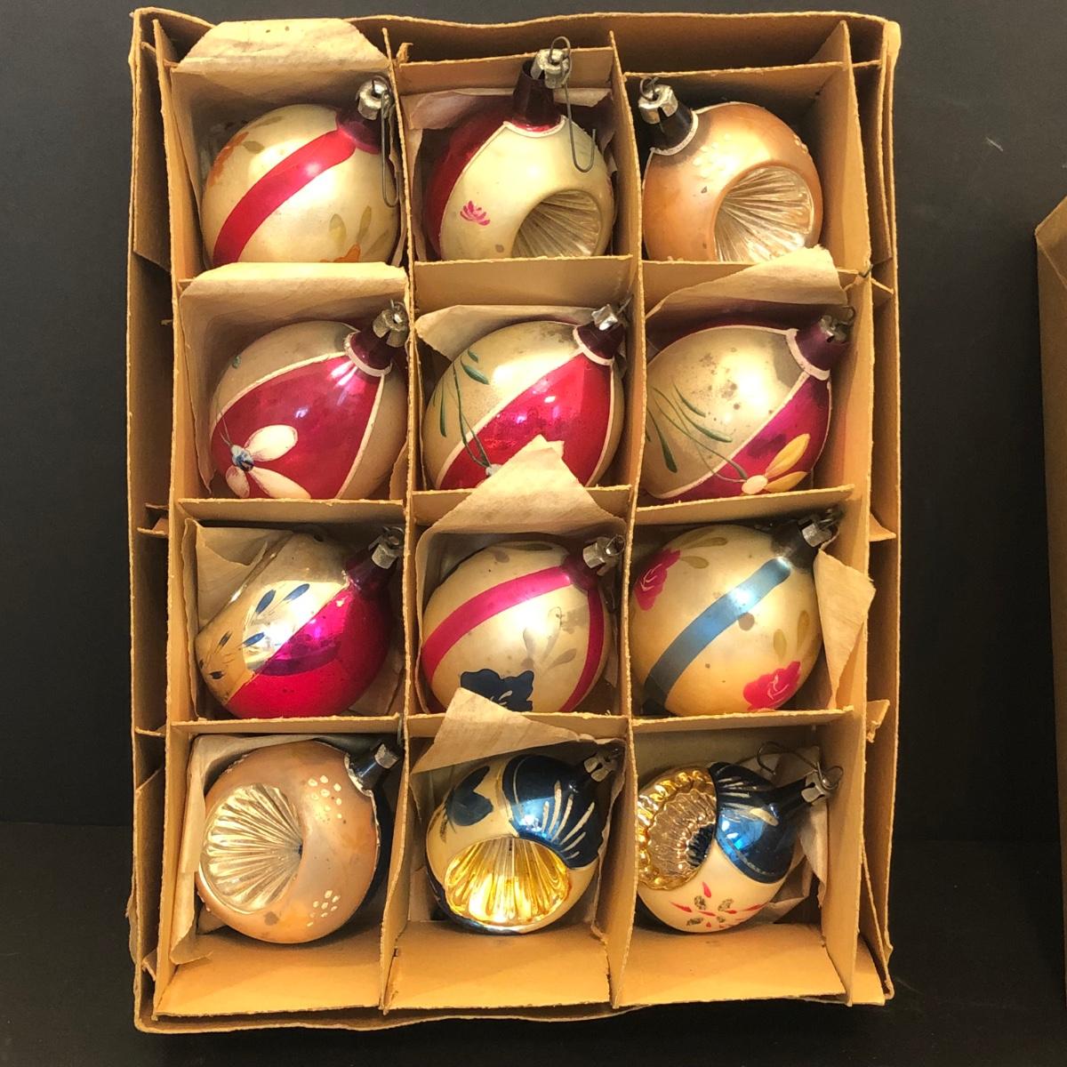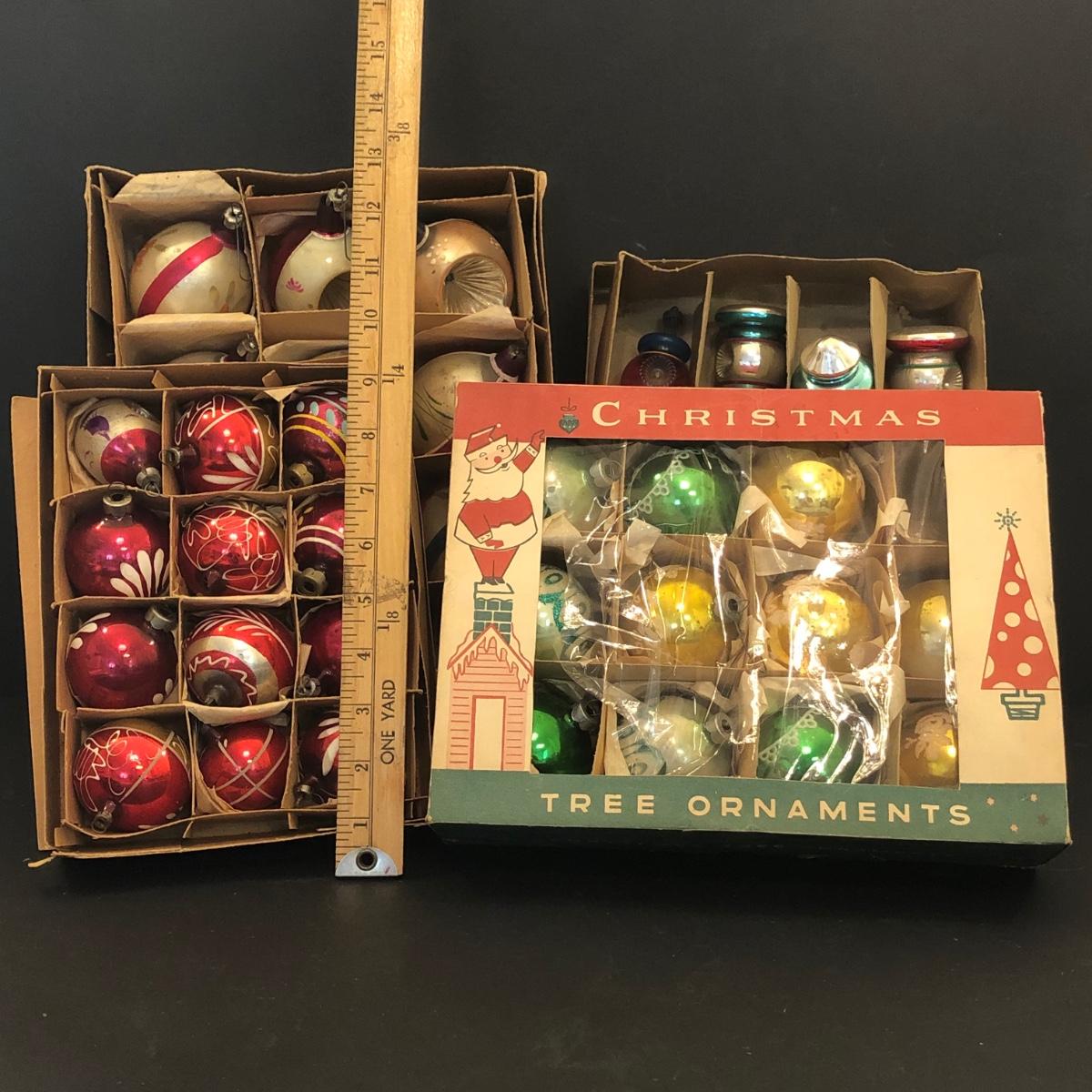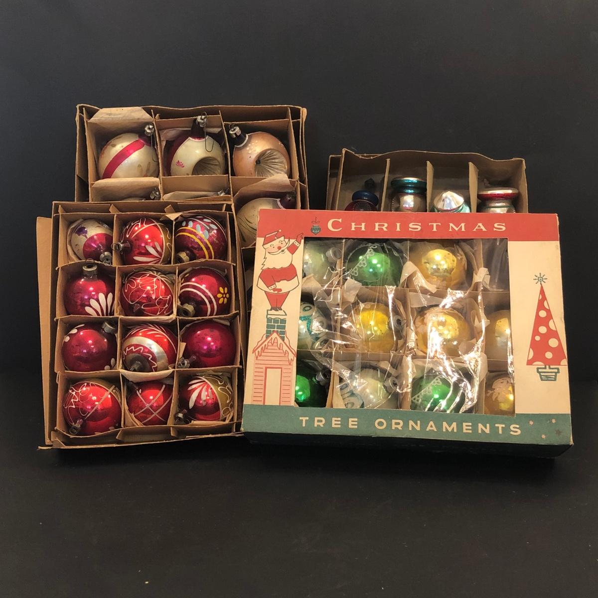 Four boxes of mixed vintage christmas balls and different shaped ornaments.