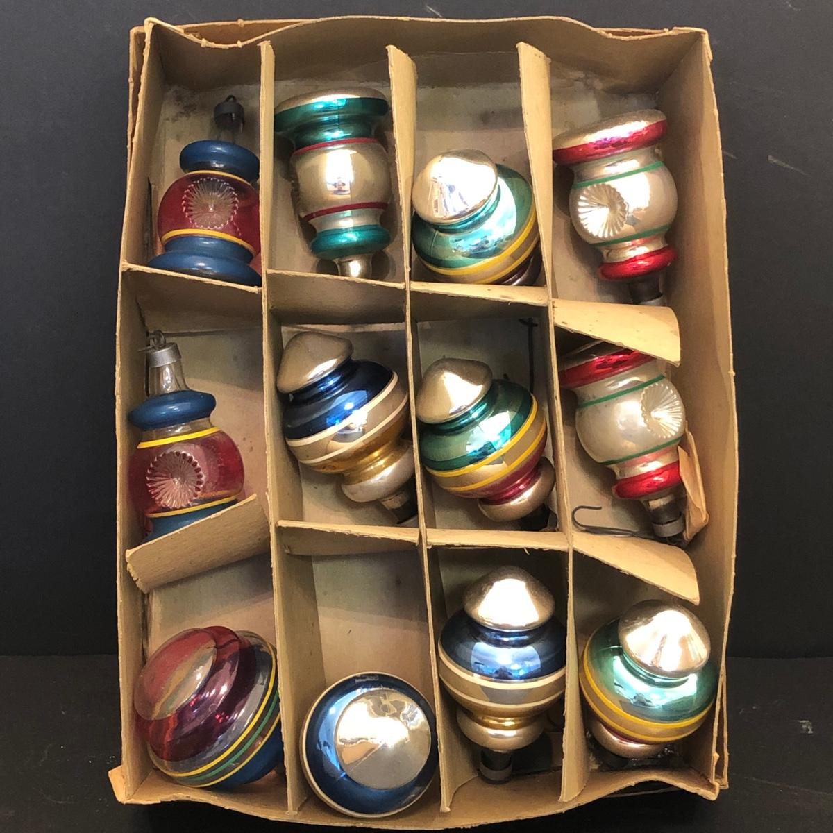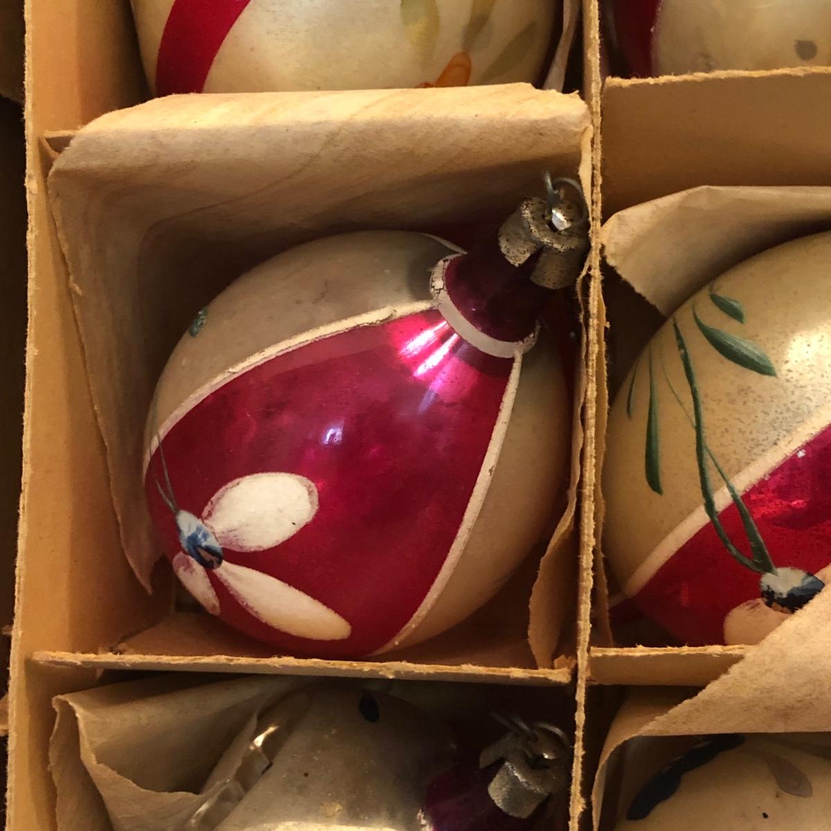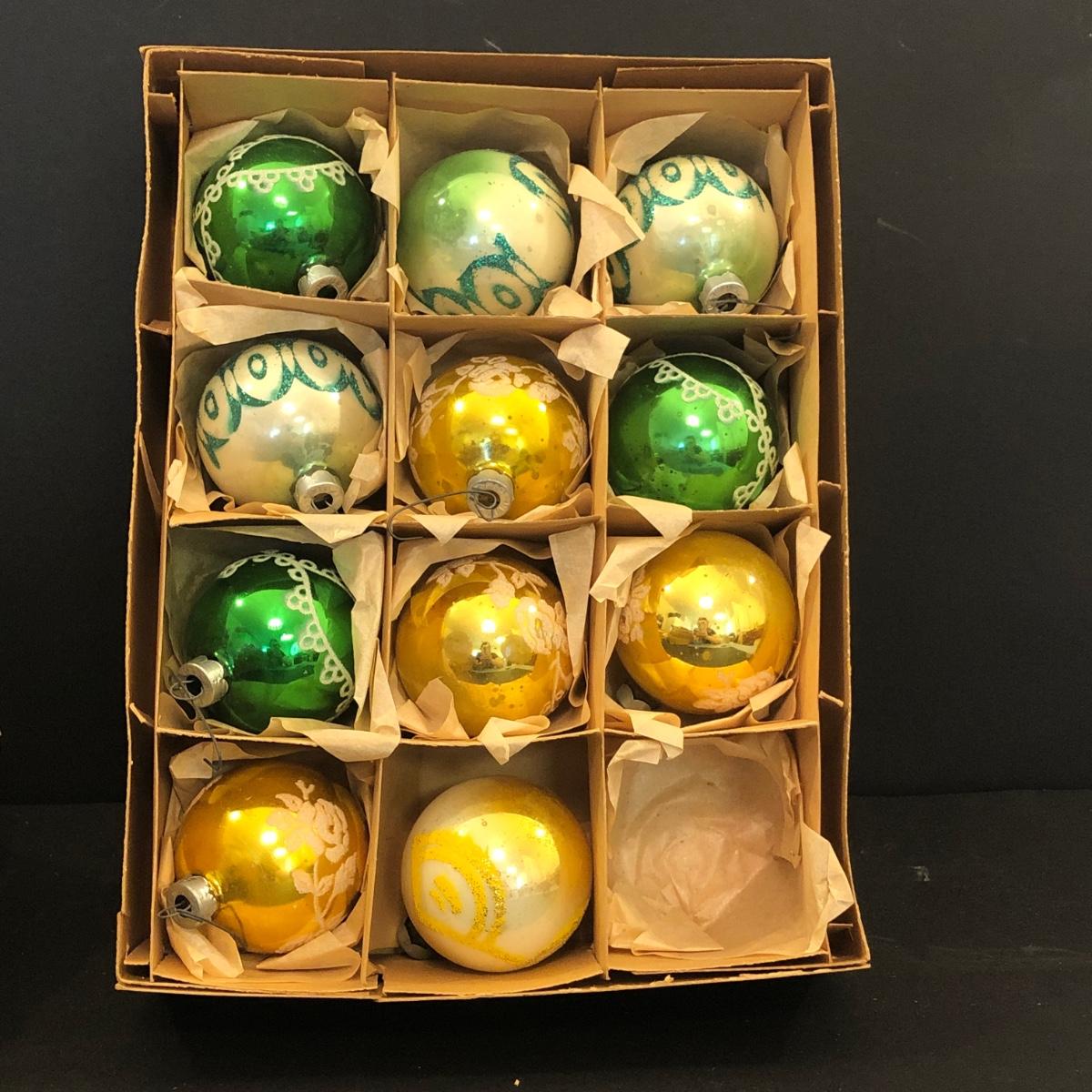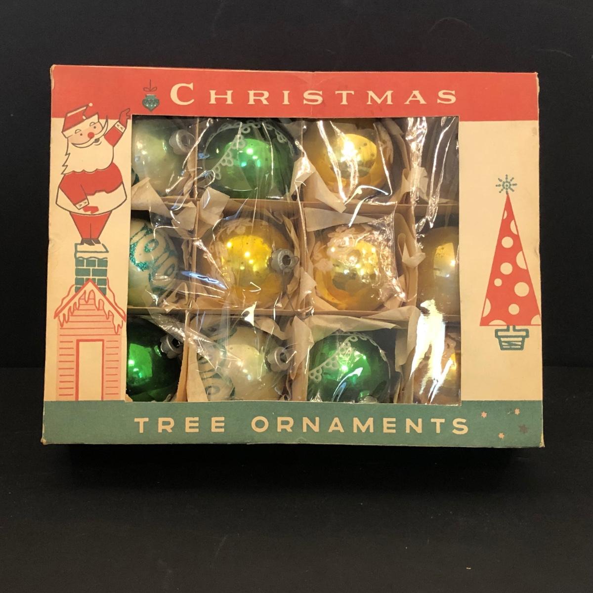 Four boxes of mixed vintage christmas balls and different shaped ornaments.