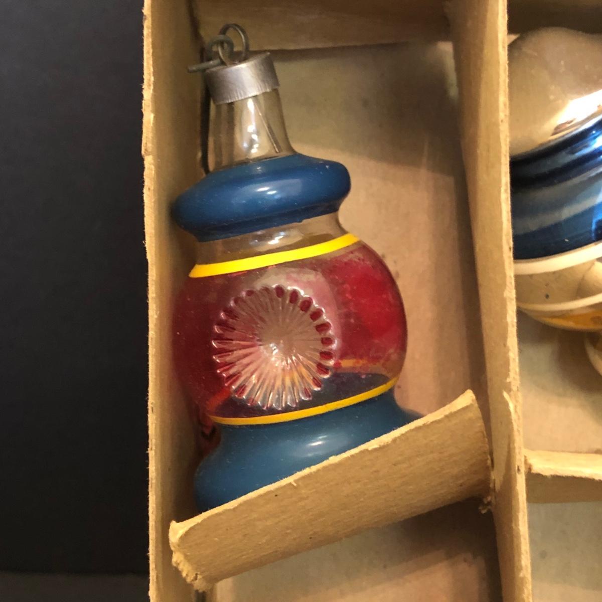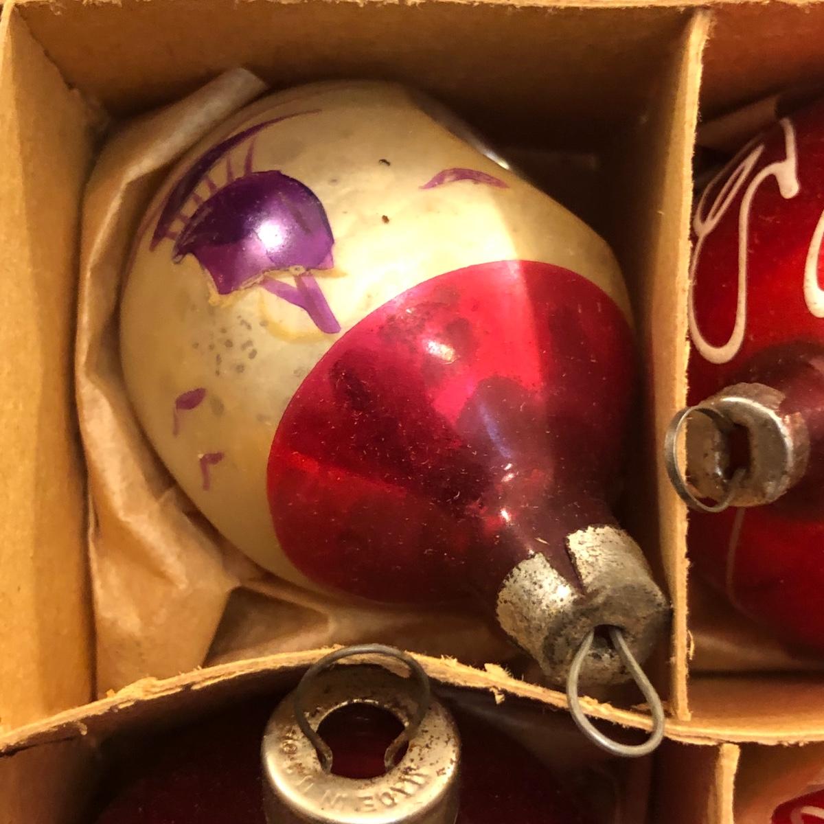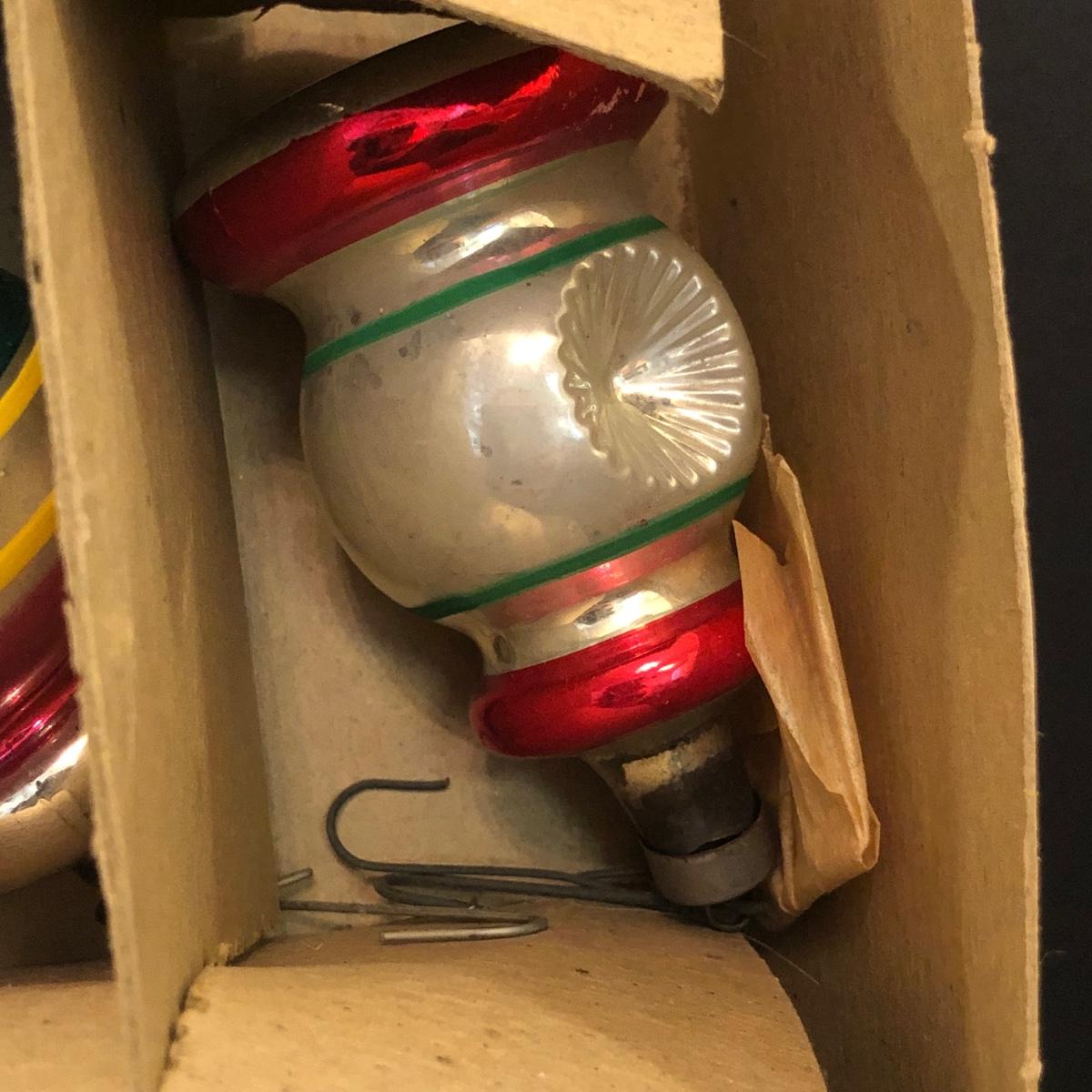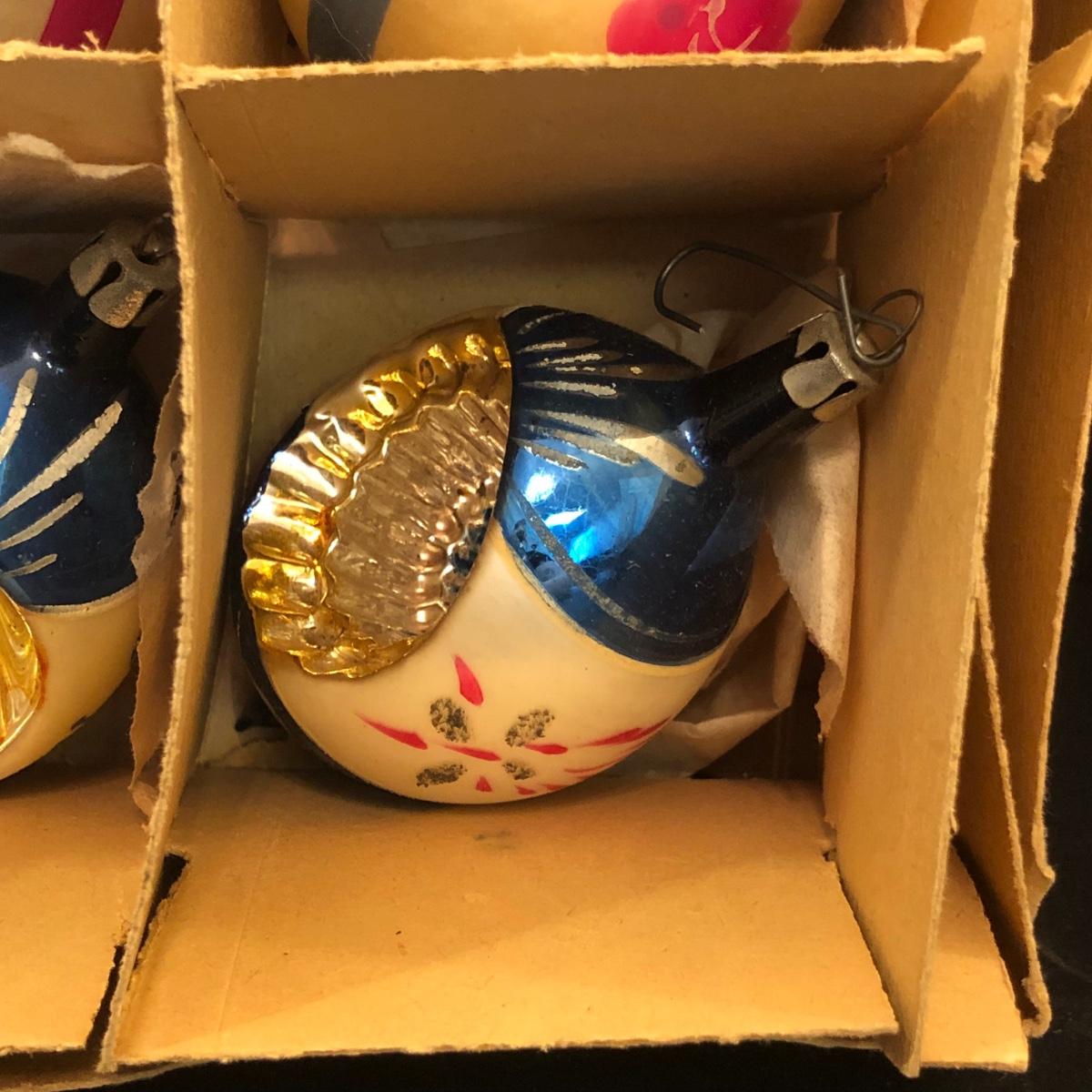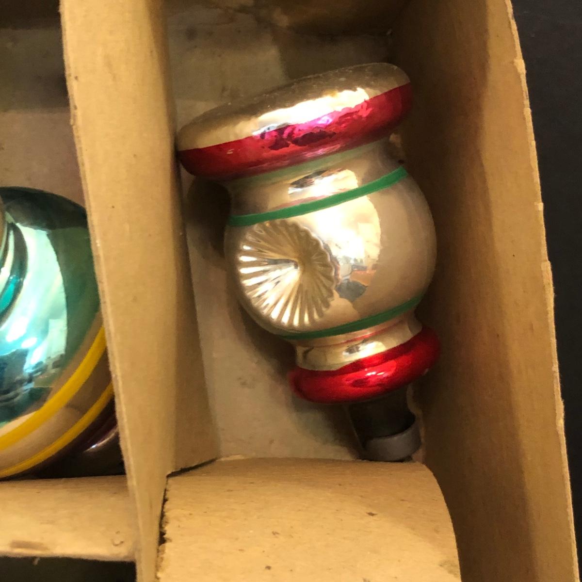 Four boxes of mixed vintage christmas balls and different shaped ornaments.