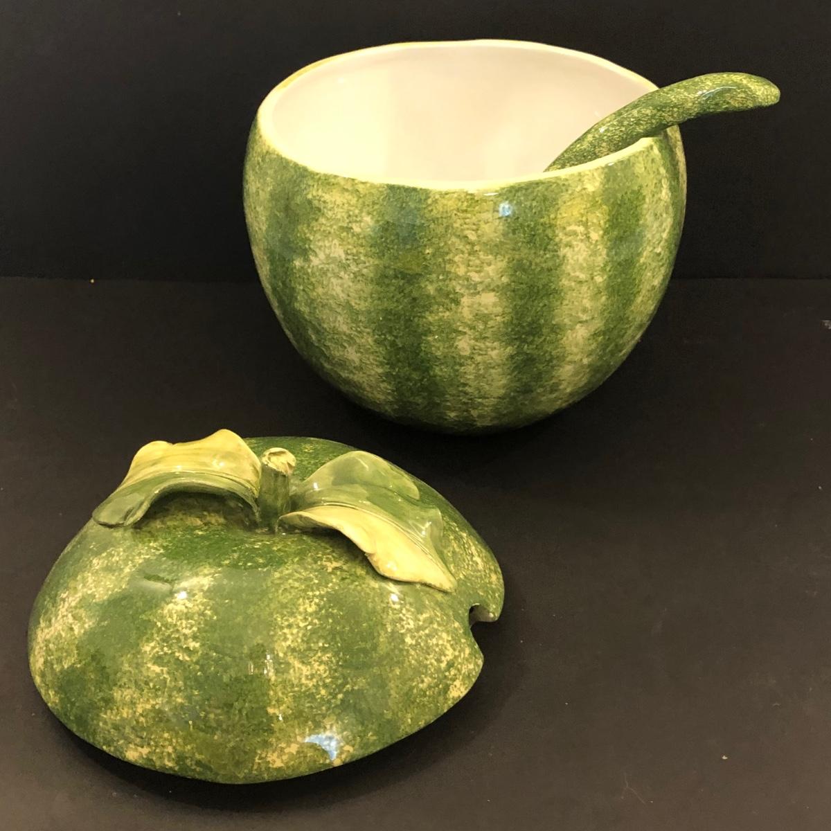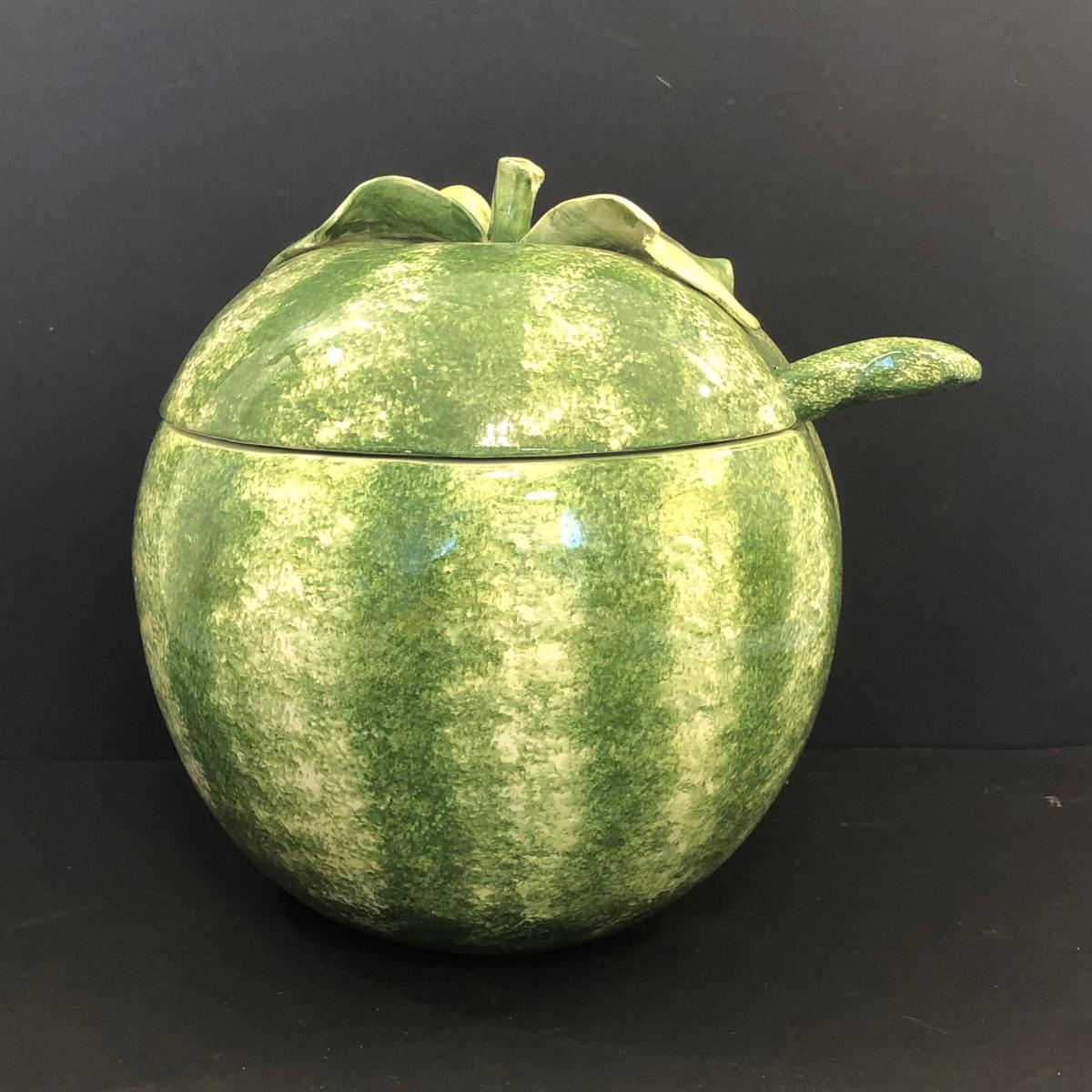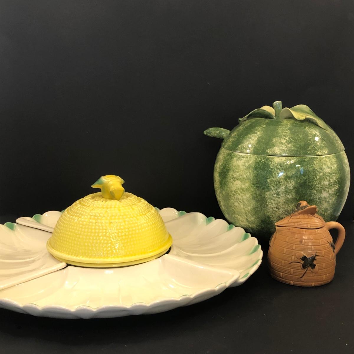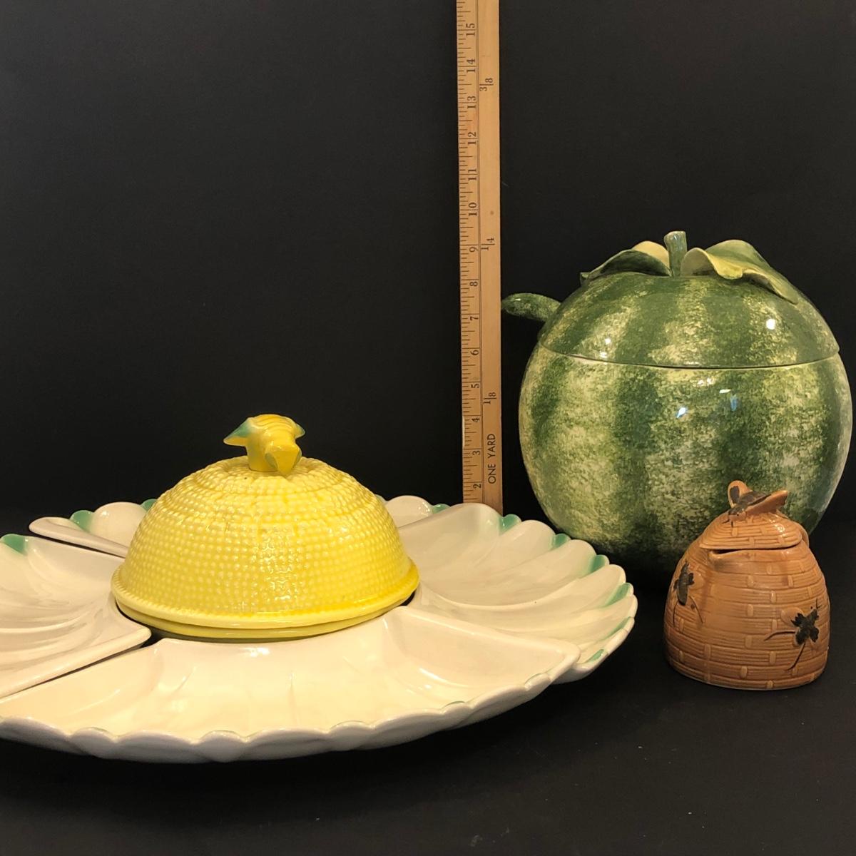 Watermelon punch bowl has a serving spoon and lid. Honey Jar has bees on it. Flower serving set has a center dish with a lid and four petal dishes that surround it.