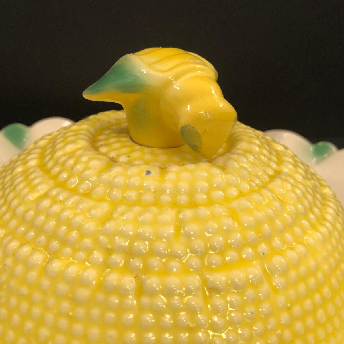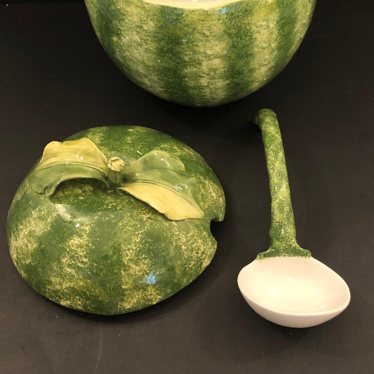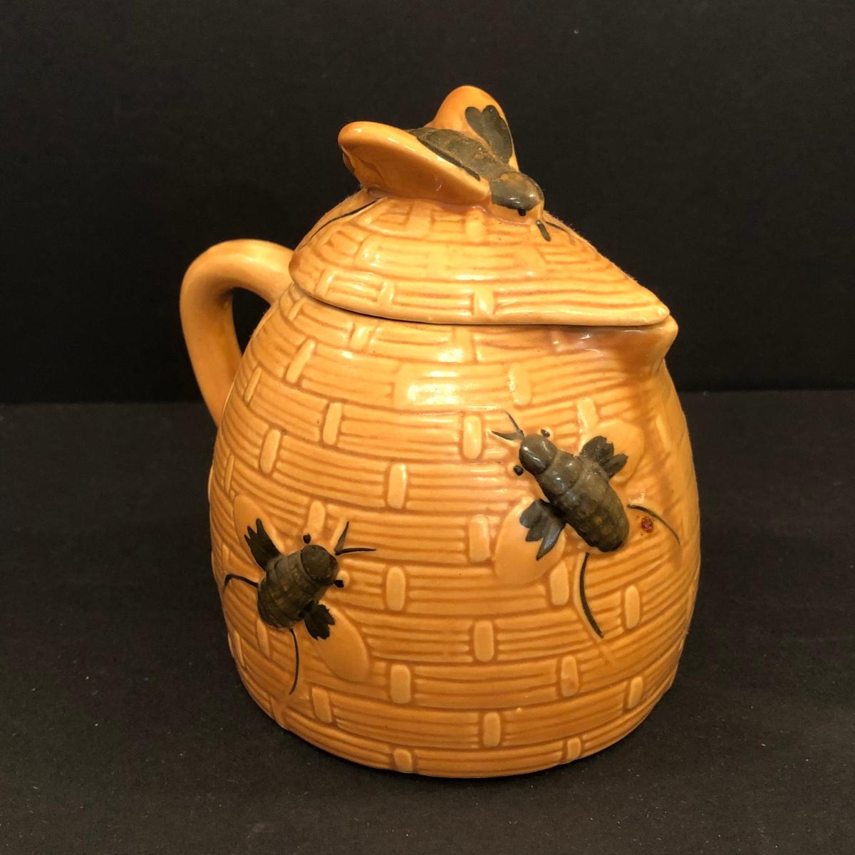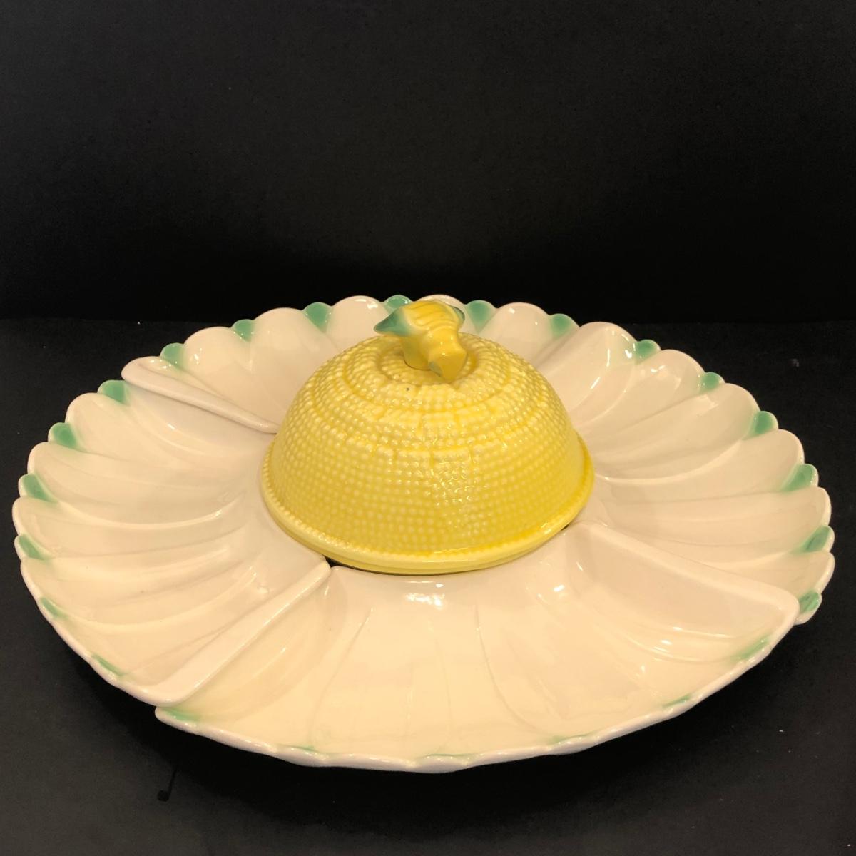 Watermelon punch bowl has a serving spoon and lid. Honey Jar has bees on it. Flower serving set has a center dish with a lid and four petal dishes that surround it.