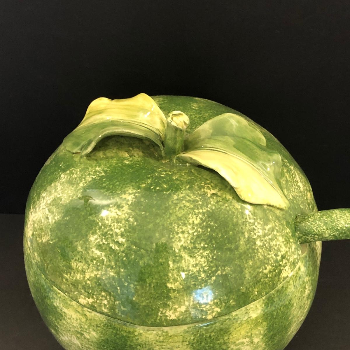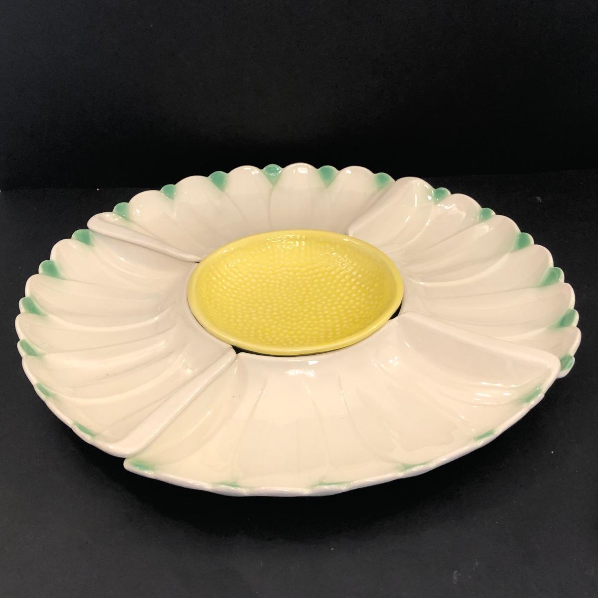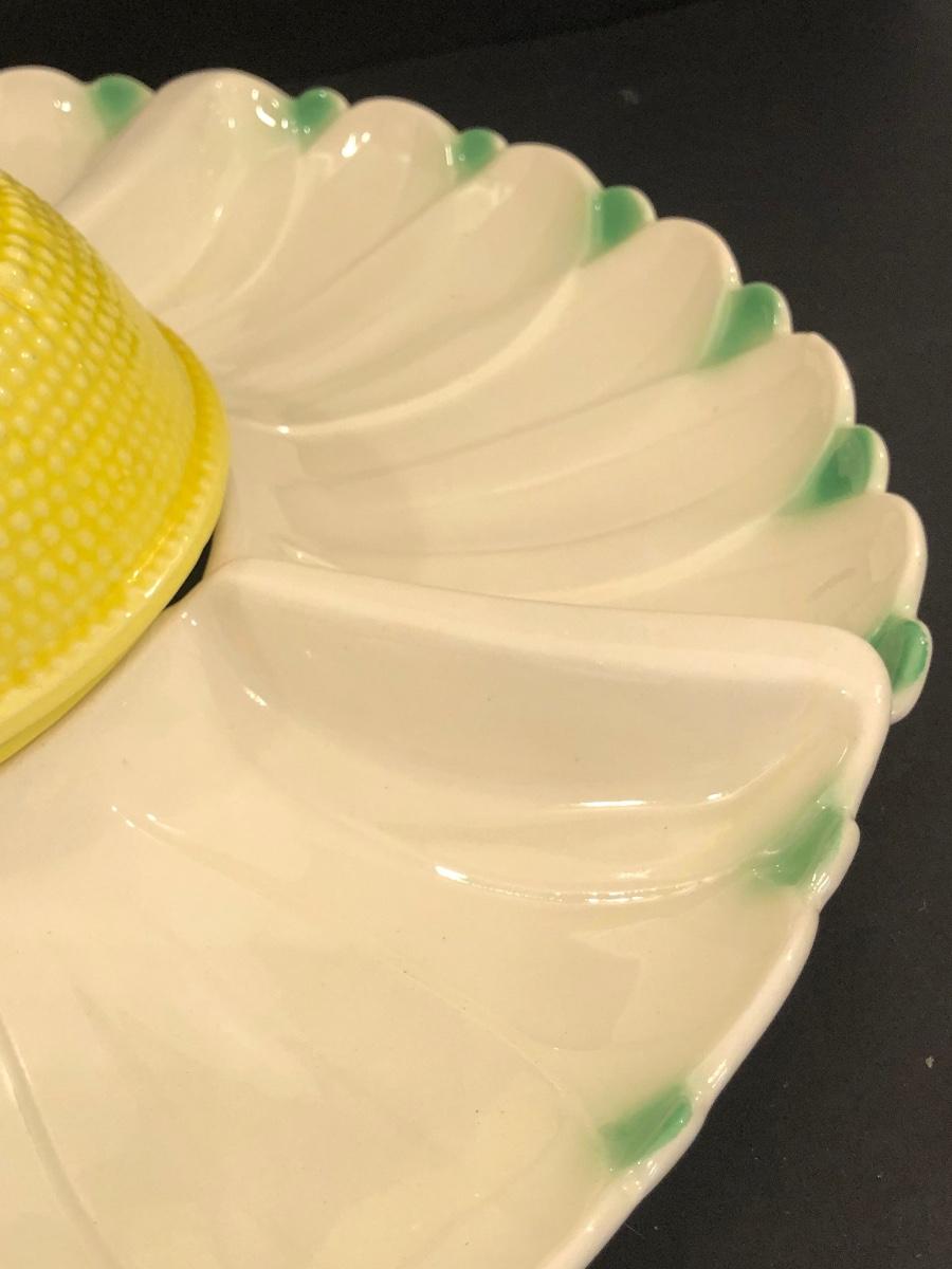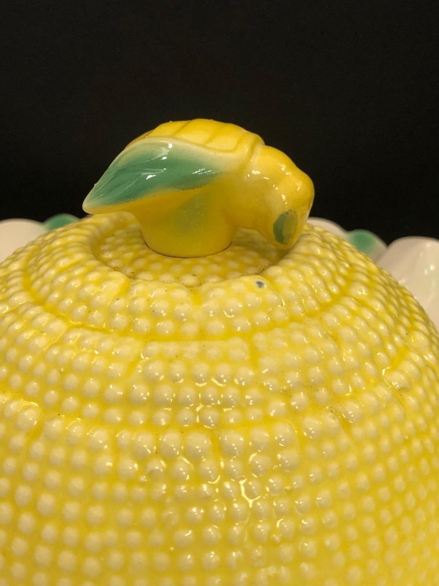 Watermelon punch bowl has a serving spoon and lid. Honey Jar has bees on it. Flower serving set has a center dish with a lid and four petal dishes that surround it.