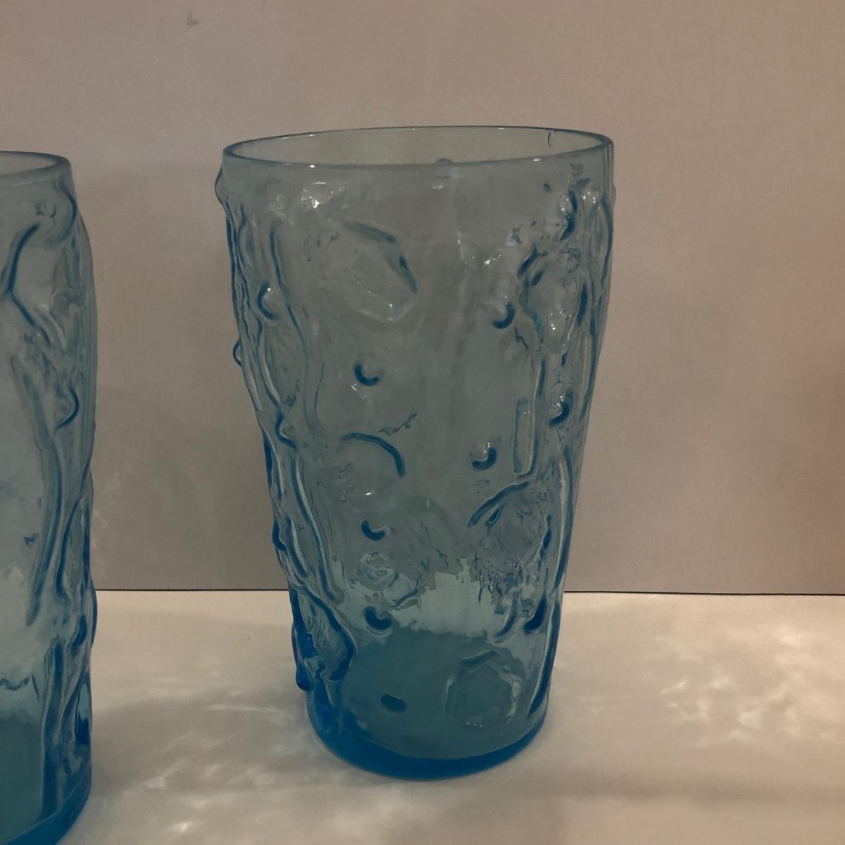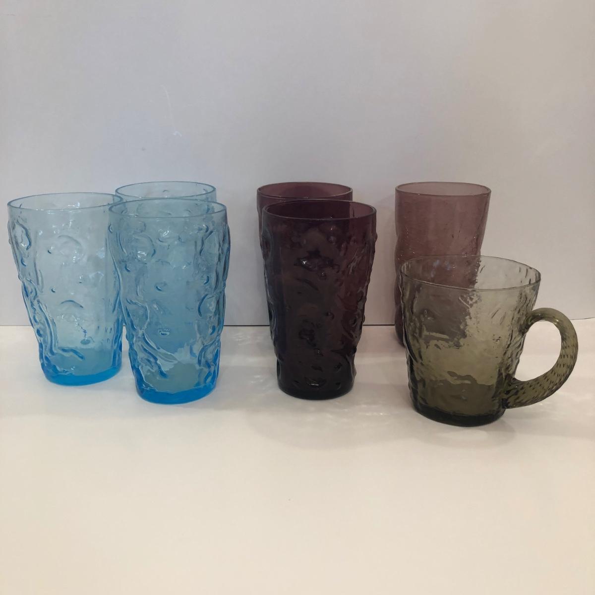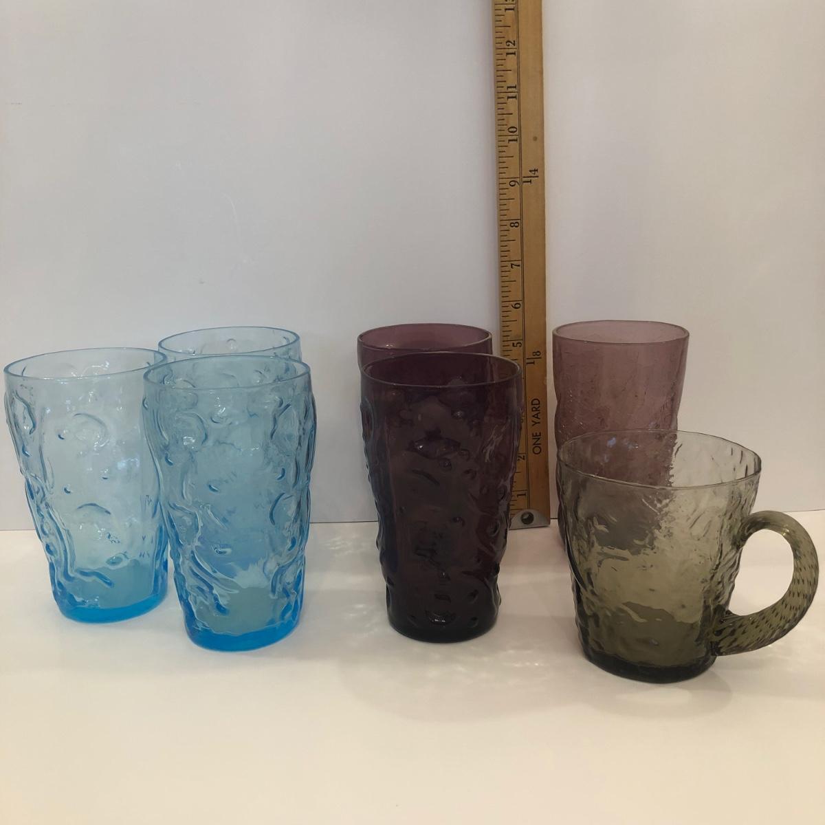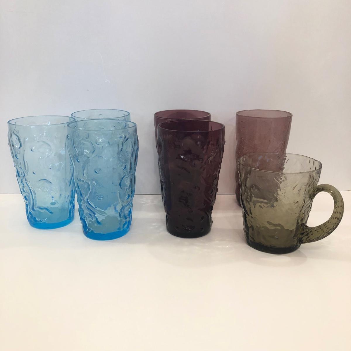 Includes three blue bubble glasses, two amethyst and one lighter purple. The mug is a translucent gray.
