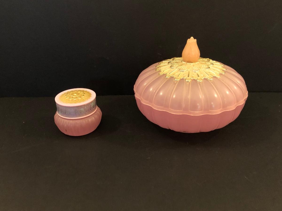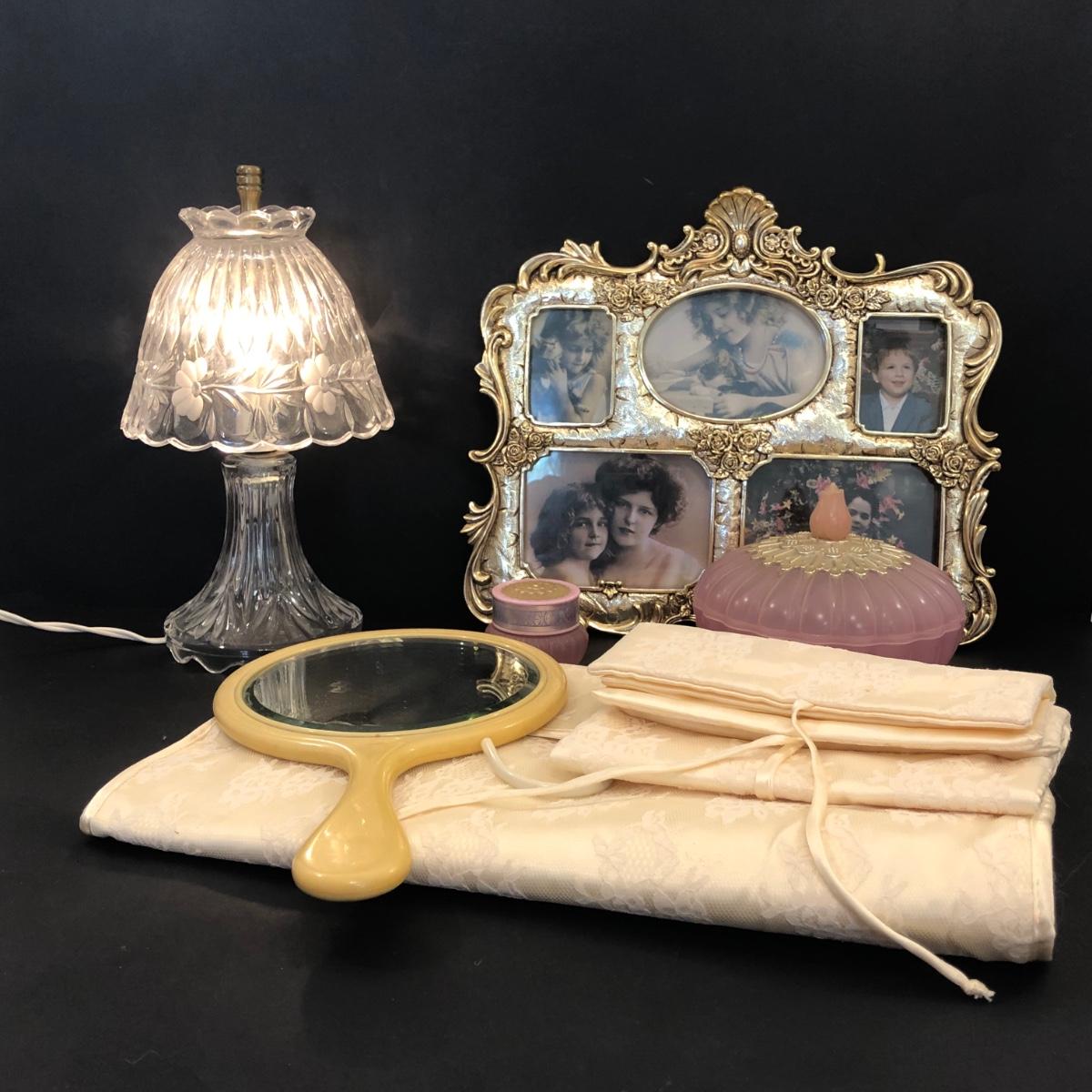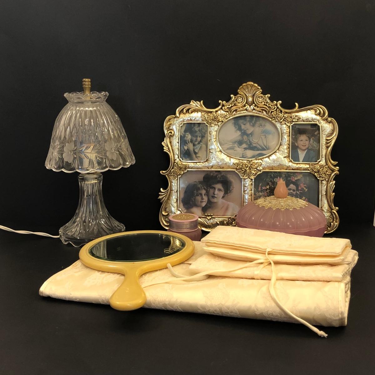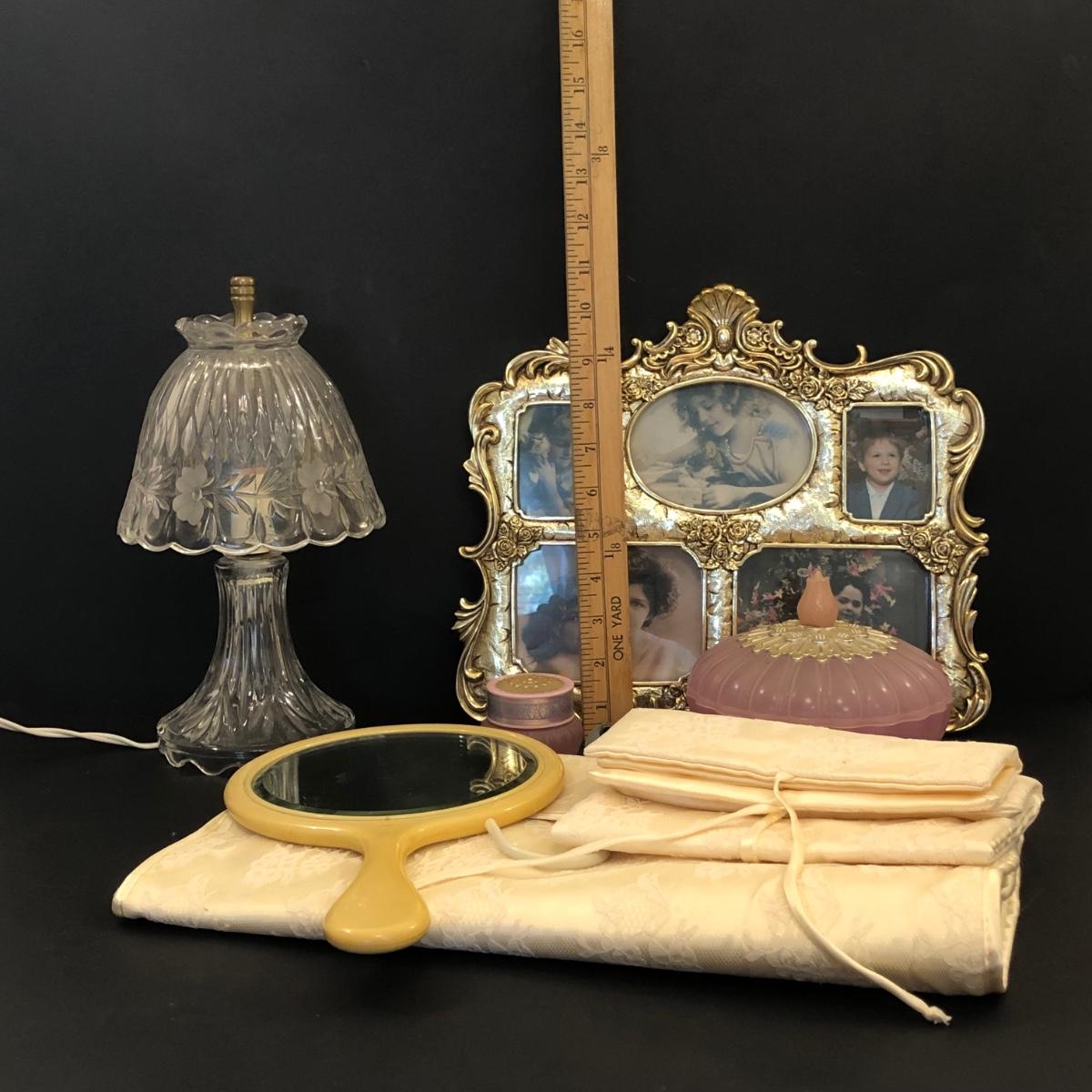 LOT 53M: Vanity Collection: Jewelry Pouches, Crystal Lamp, Ornate Picture Frame, Avon Trinket Box & Hand Mirror