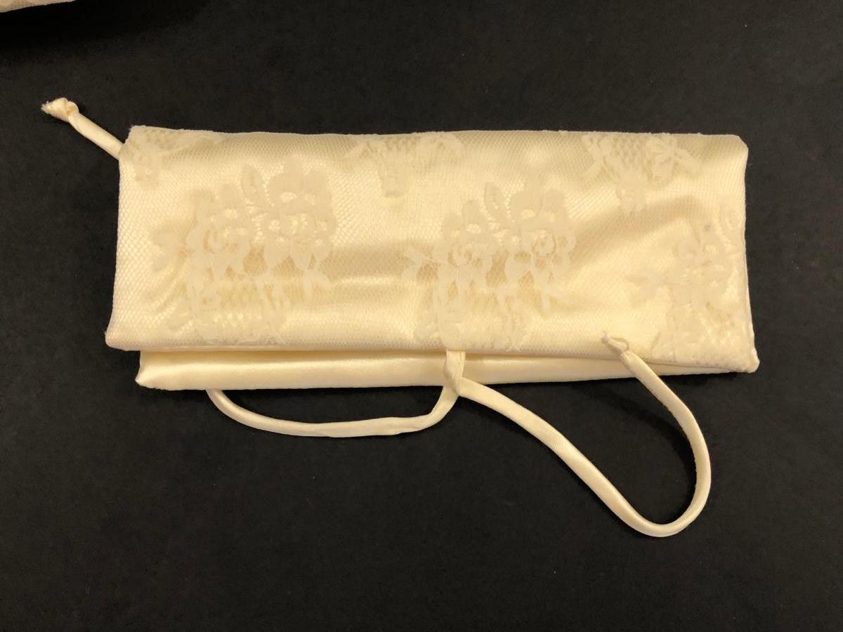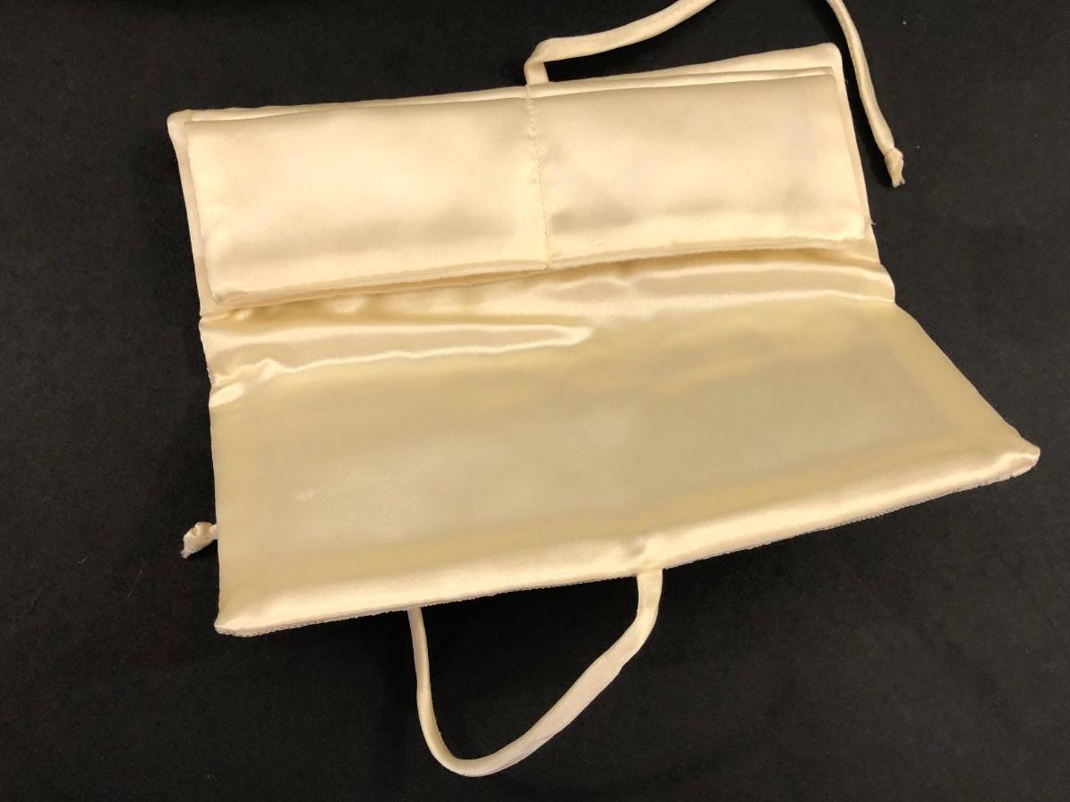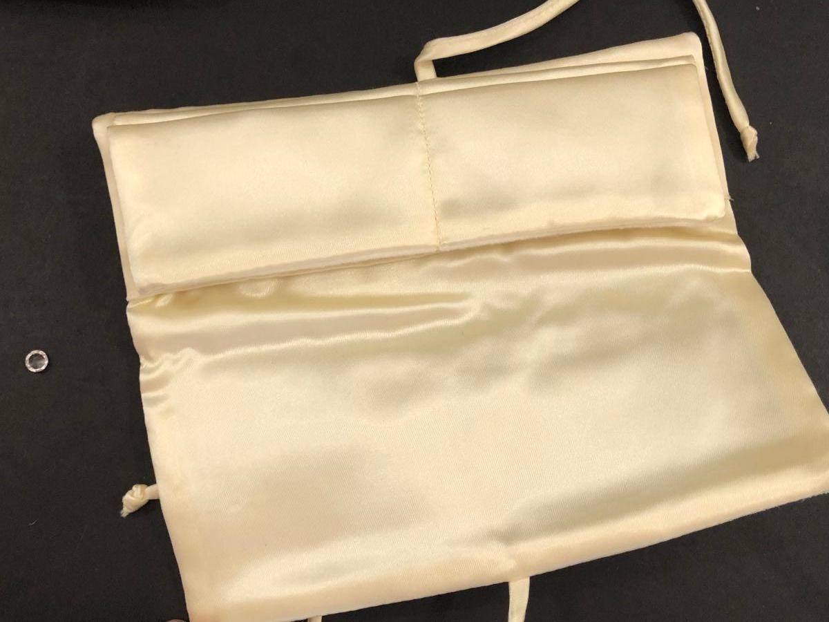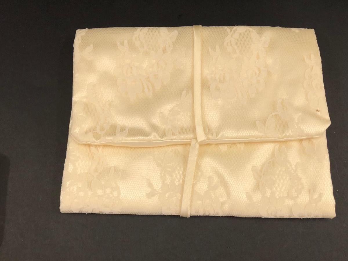 Lamp is in working condition. Jewelry pouches are cream colored with lacy pattern.