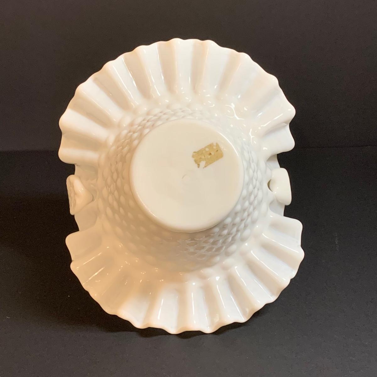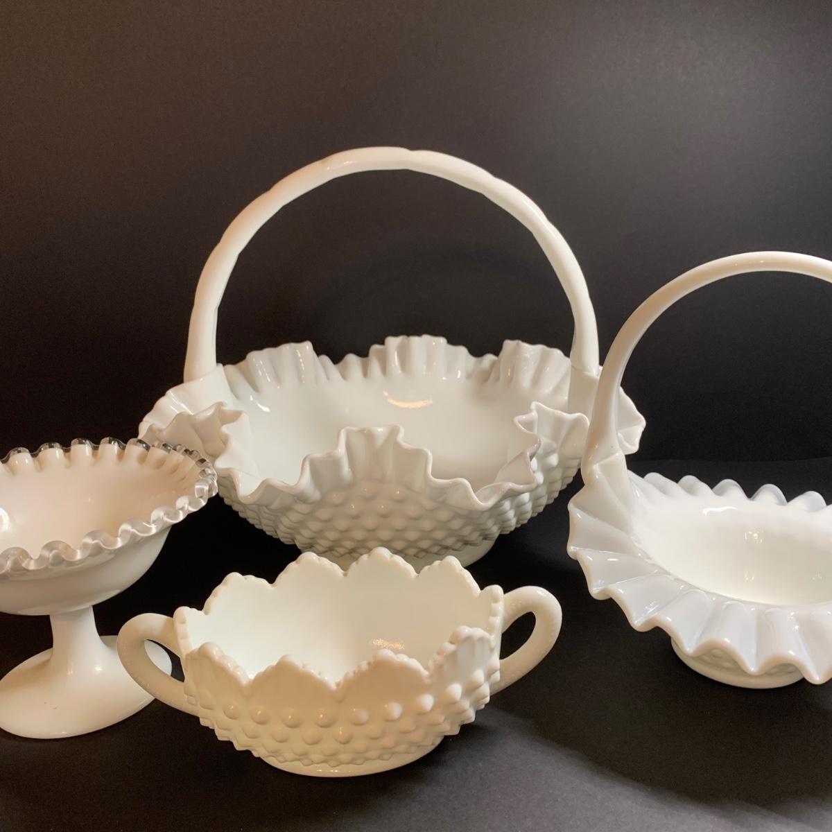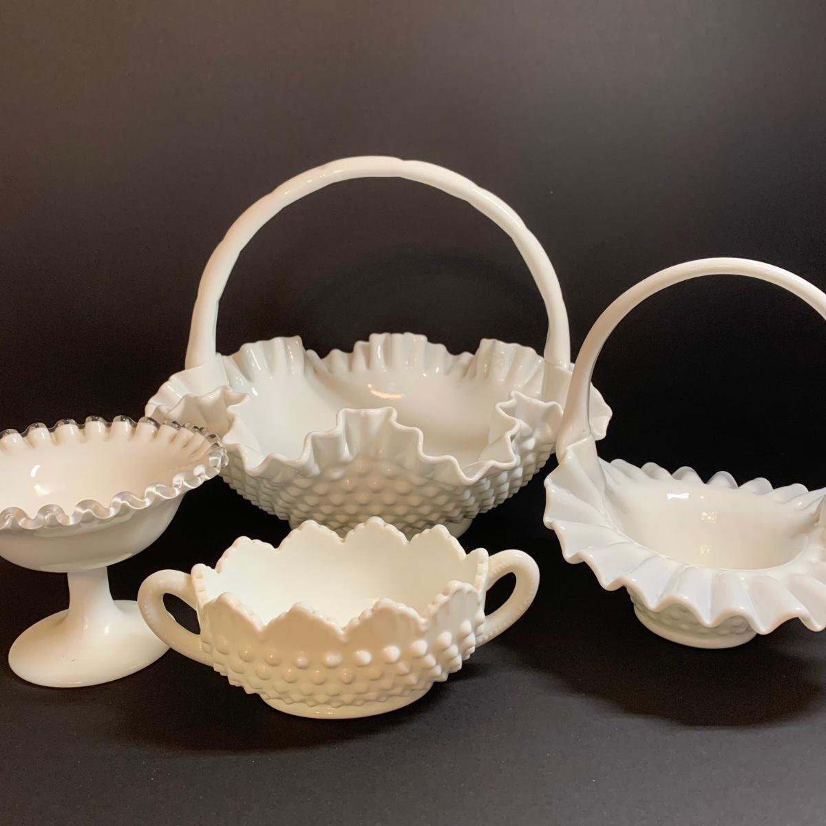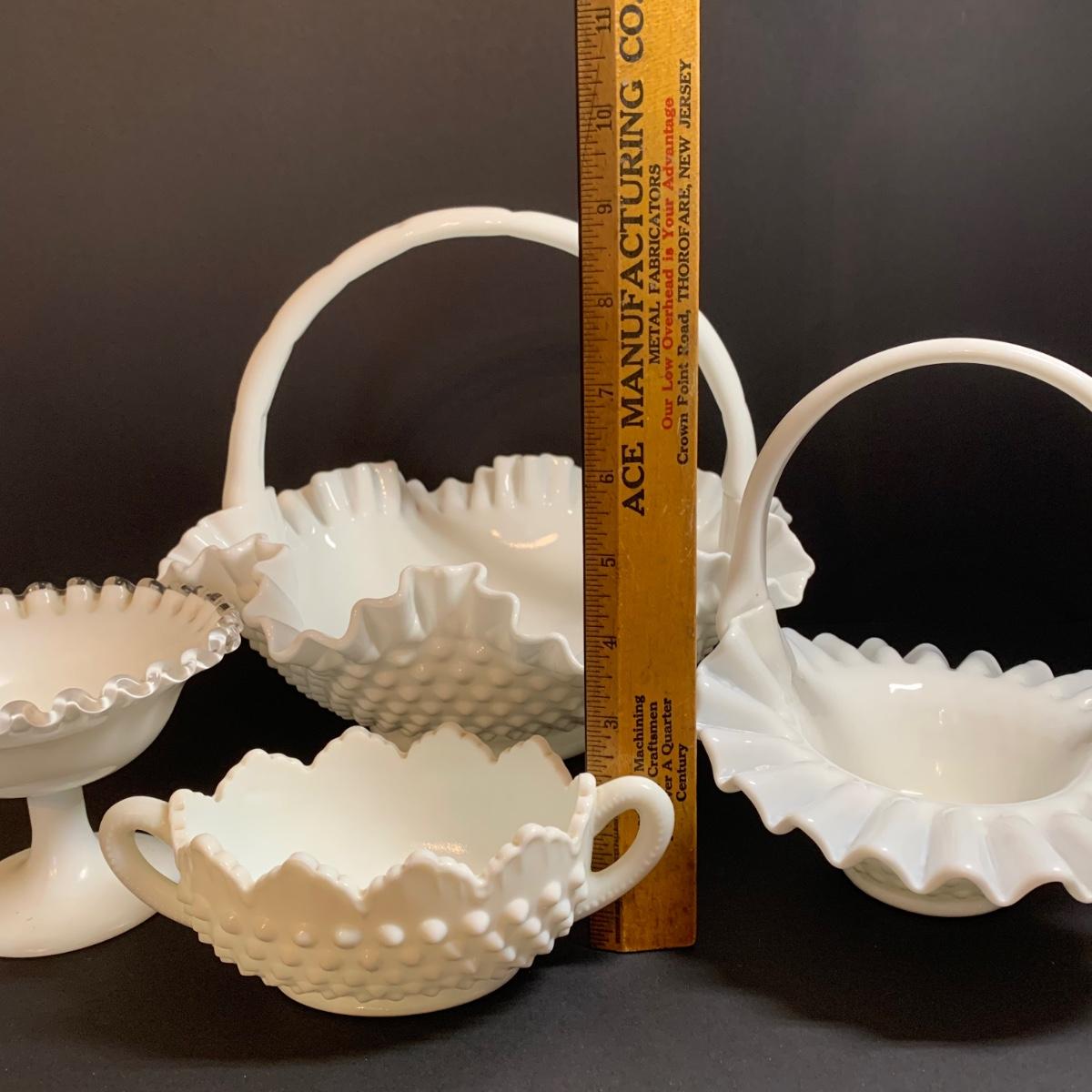 LOT 62R: Milk Glass Baskets, Bowl and Compote Dishes. 2 of the 4 Pieces are Marked Fenton