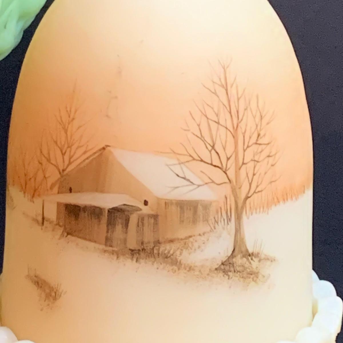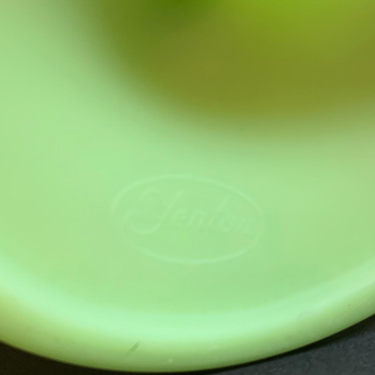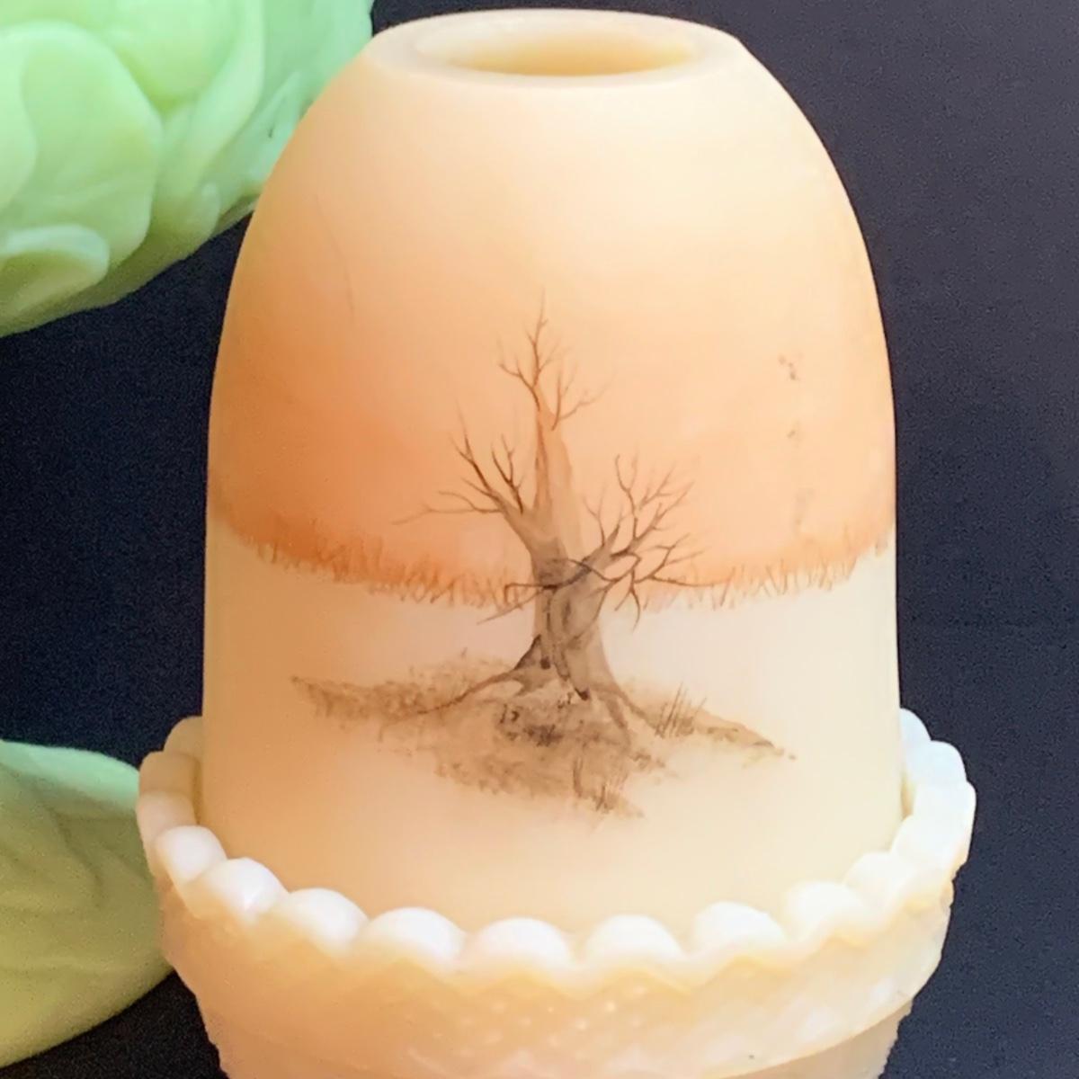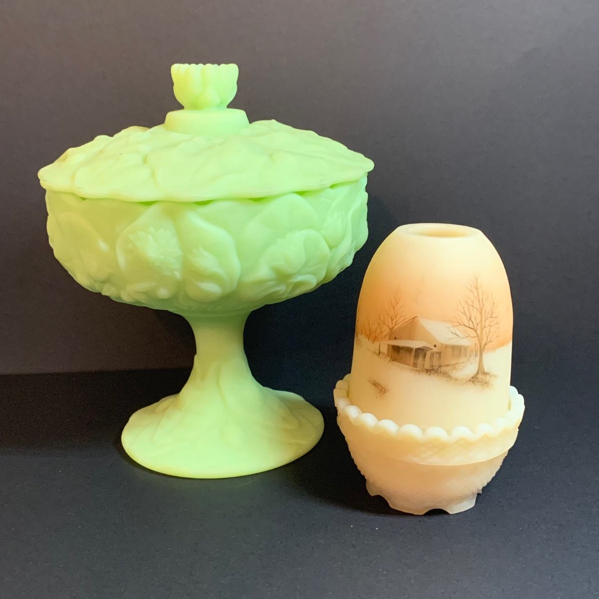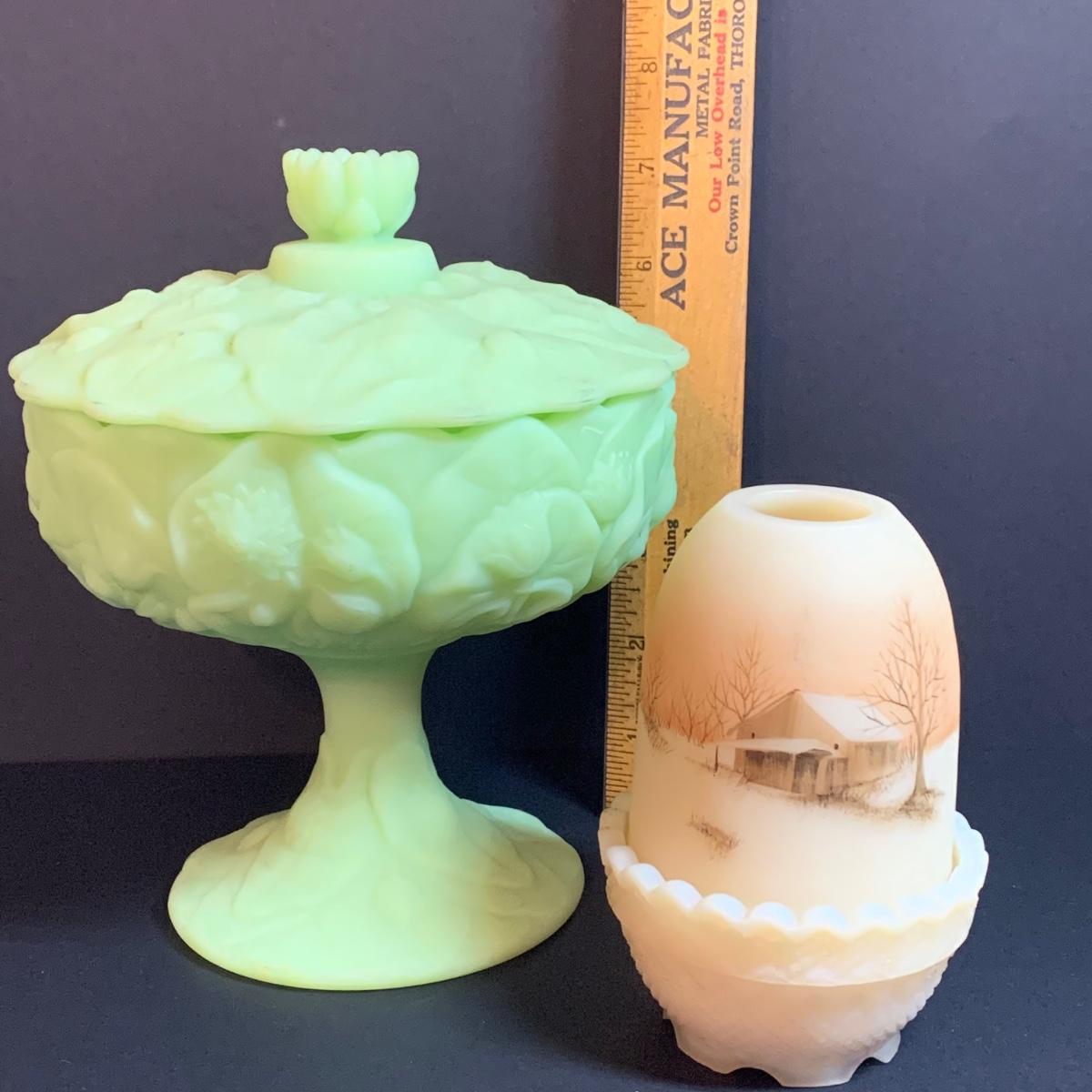 LOT 63R: Fenton Lime Green Custard Satin Glass Water Lily Compote Candy Dish with Lid and Fenton Hand Painted Signed  Fairy Light