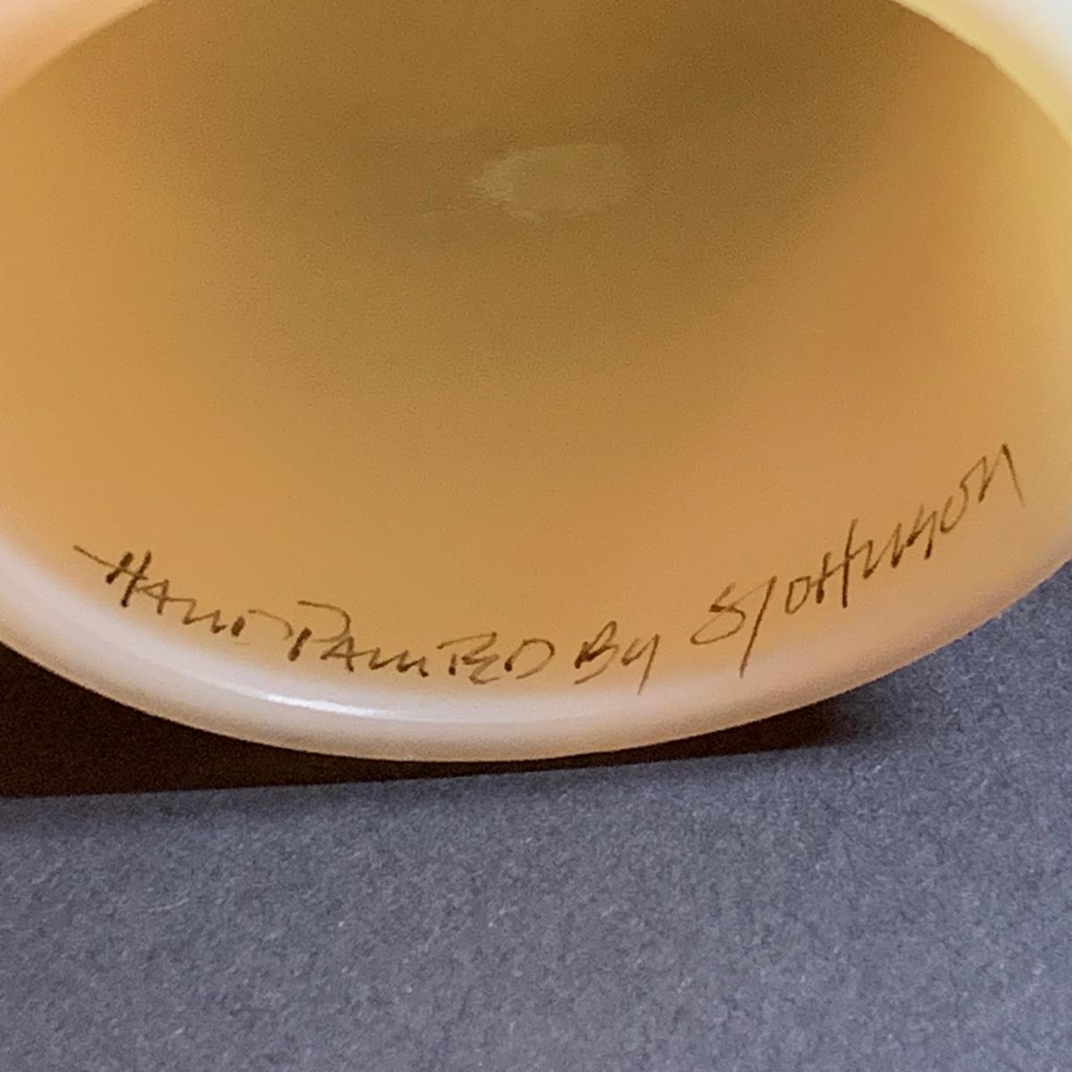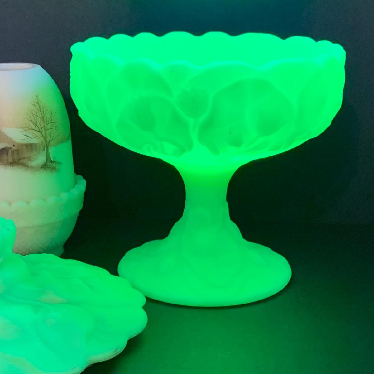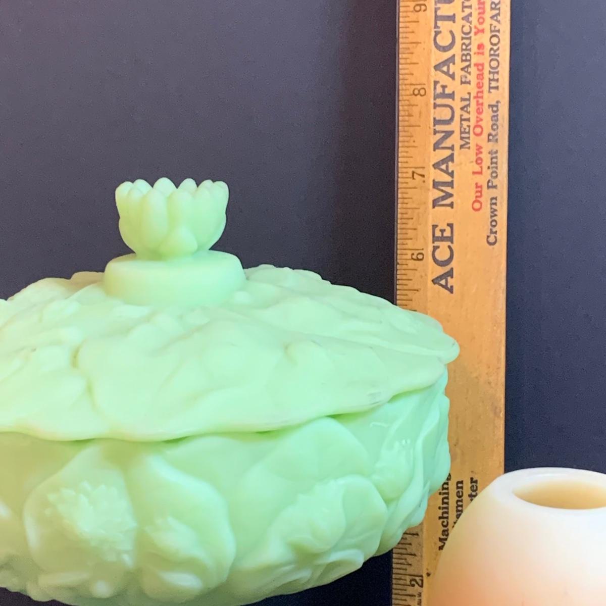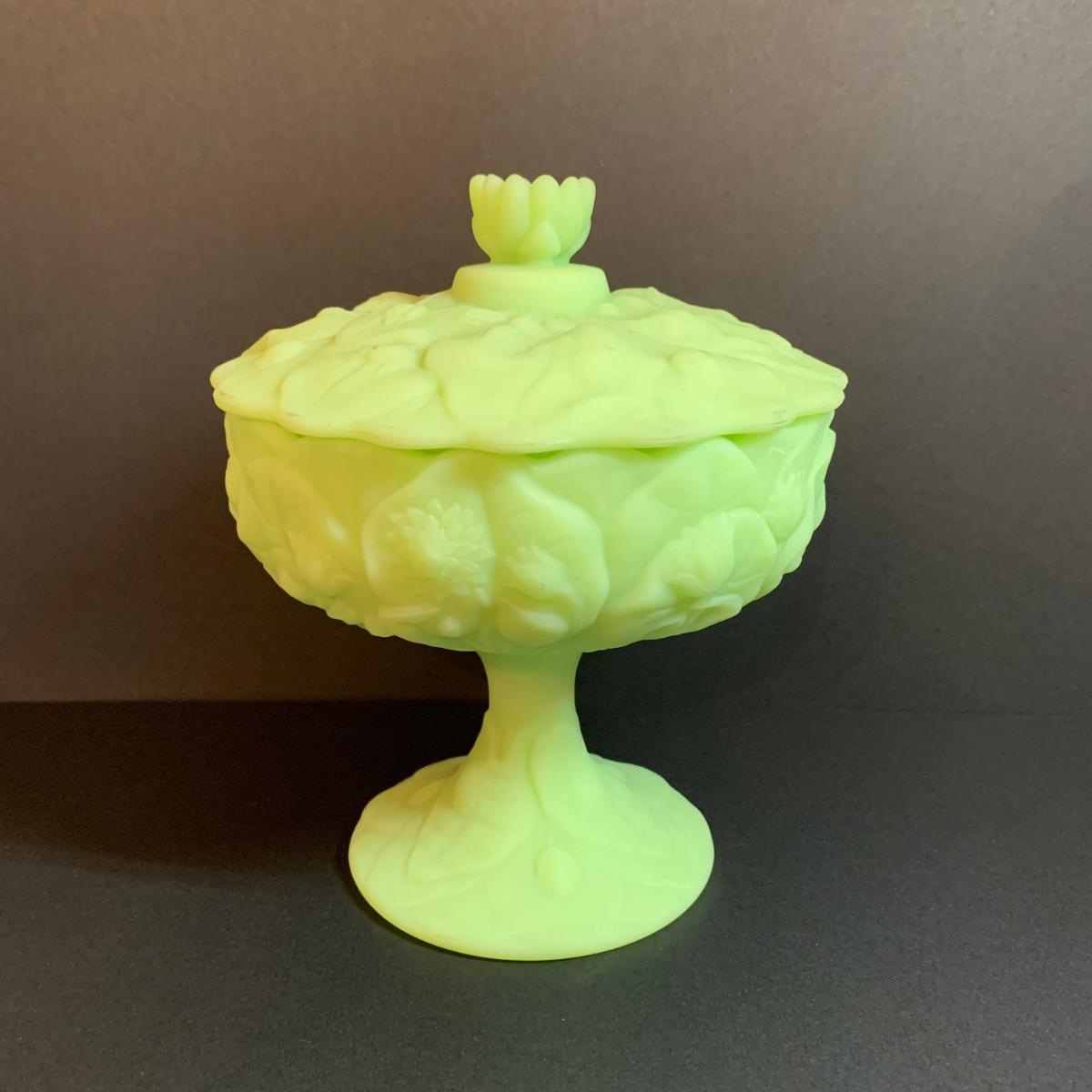 LOT 63R: Fenton Lime Green Custard Satin Glass Water Lily Compote Candy Dish with Lid and Fenton Hand Painted Signed Fairy Light