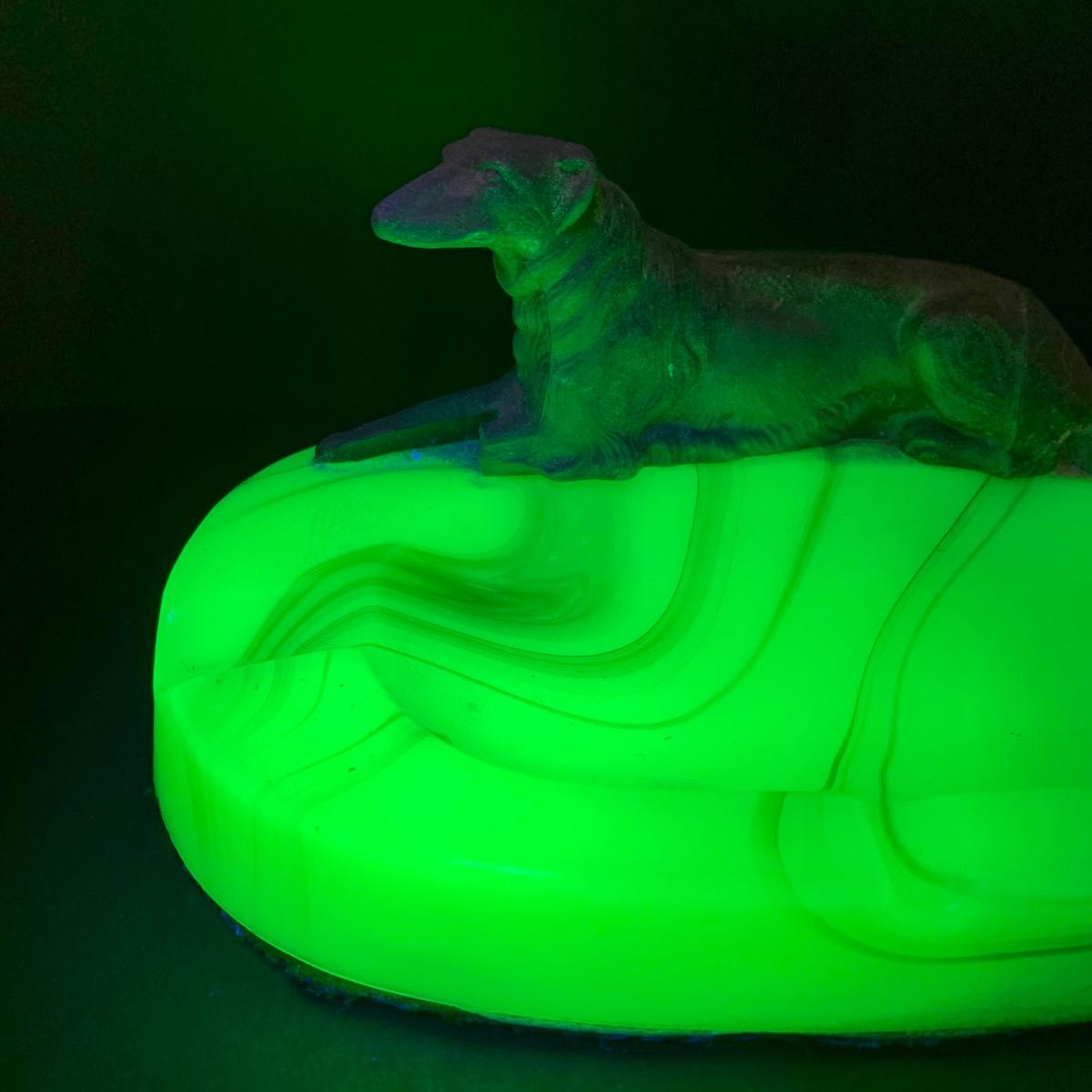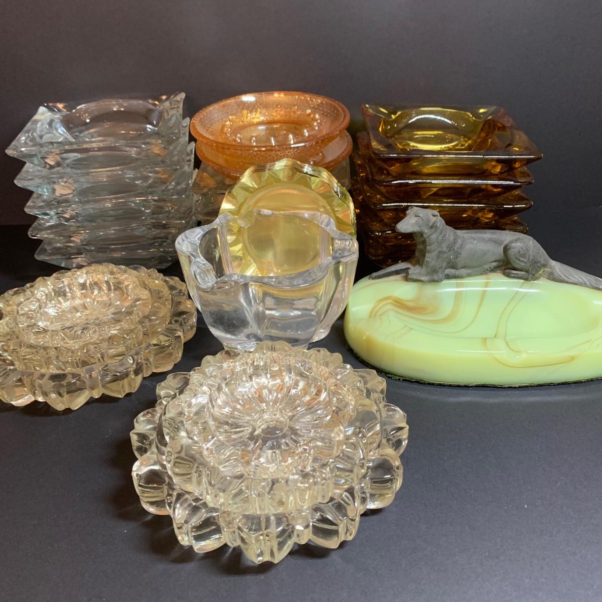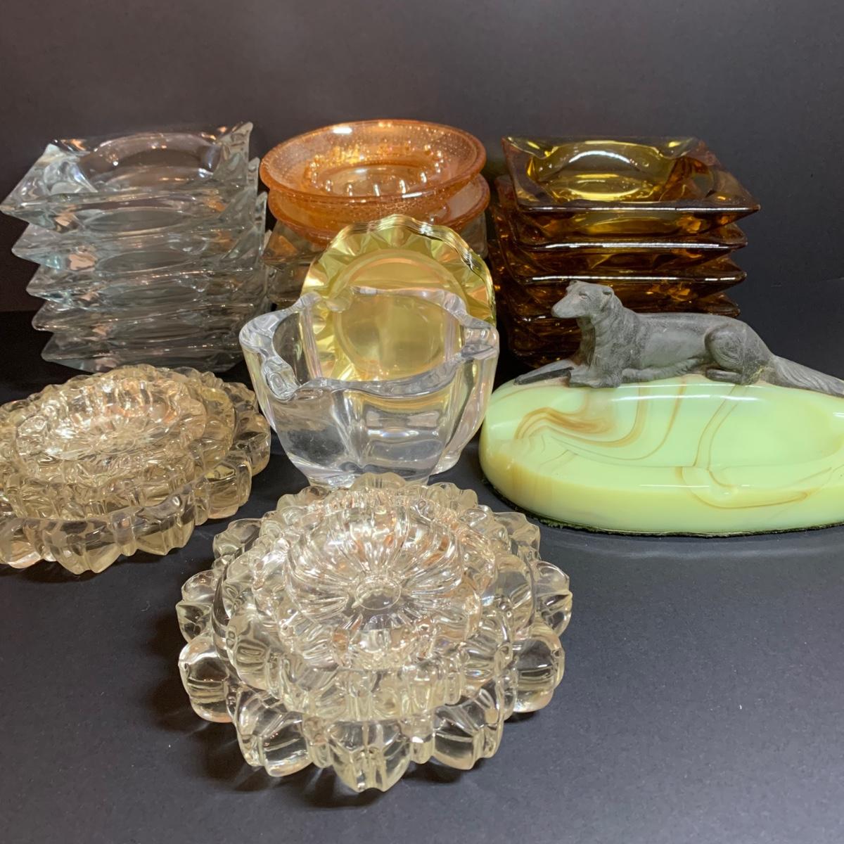 LOT 64R: Large Collection of Ashtrays Featuring a Metal Dog on Uranium Glass
