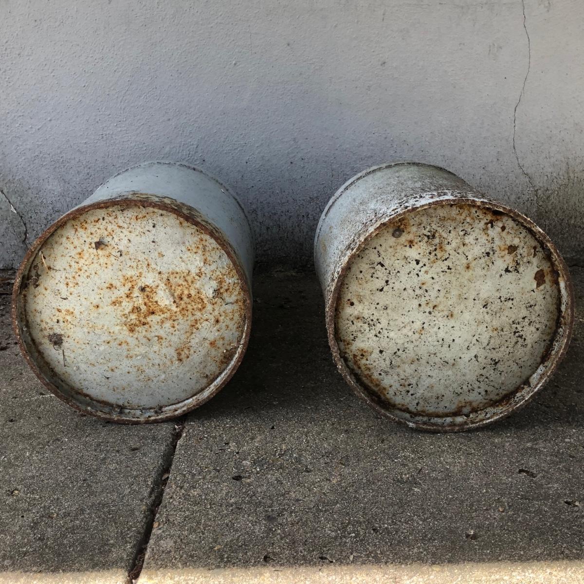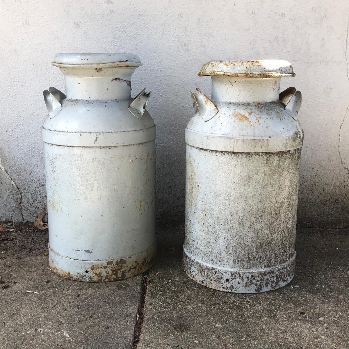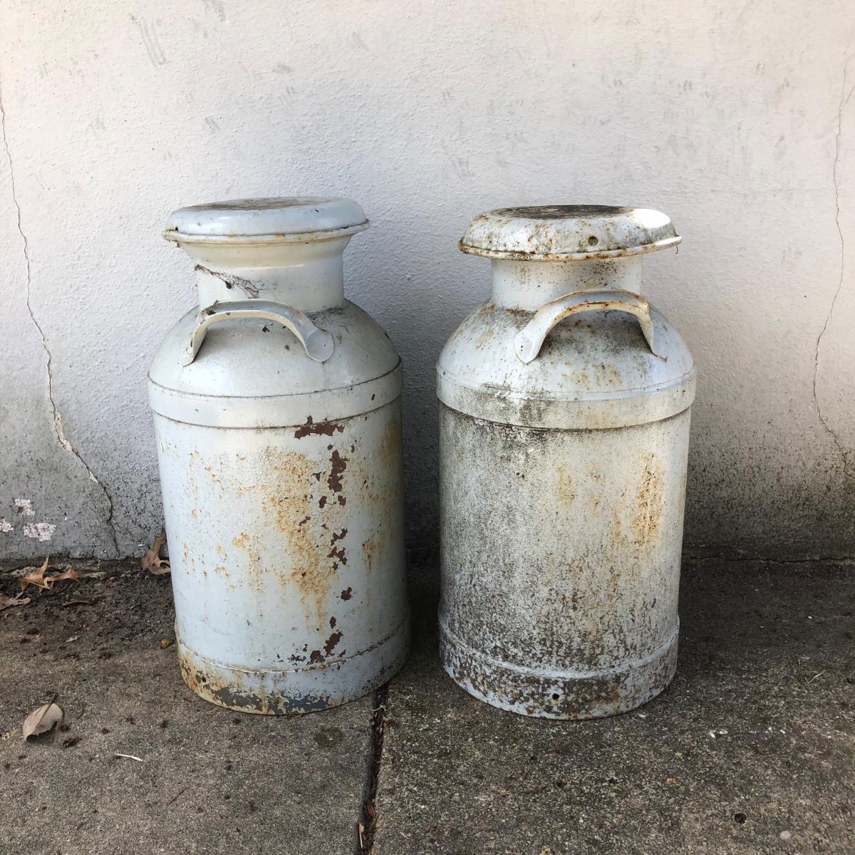 Two vintage milk cans. Both are rusted but bottom is in tact.