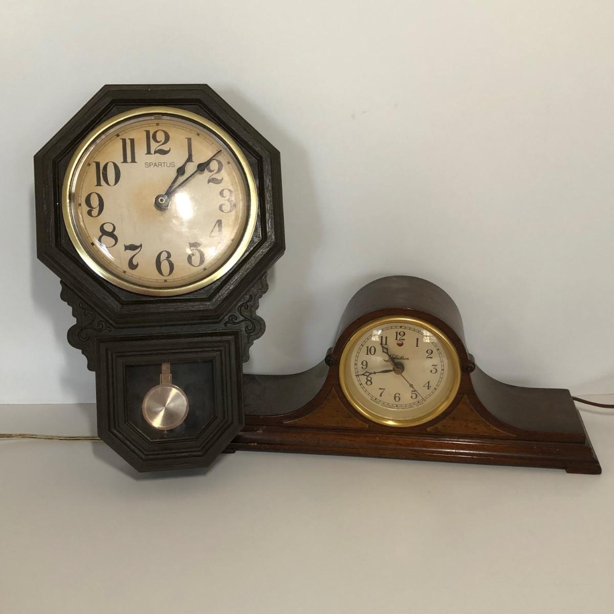 Includes two electric clocks, one wall hanging with a pendulum and one a table clock. Untested.