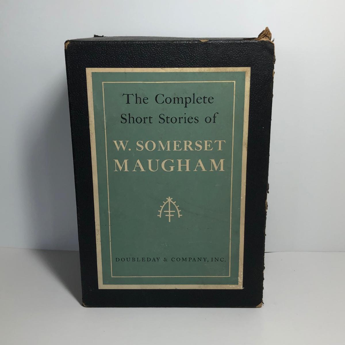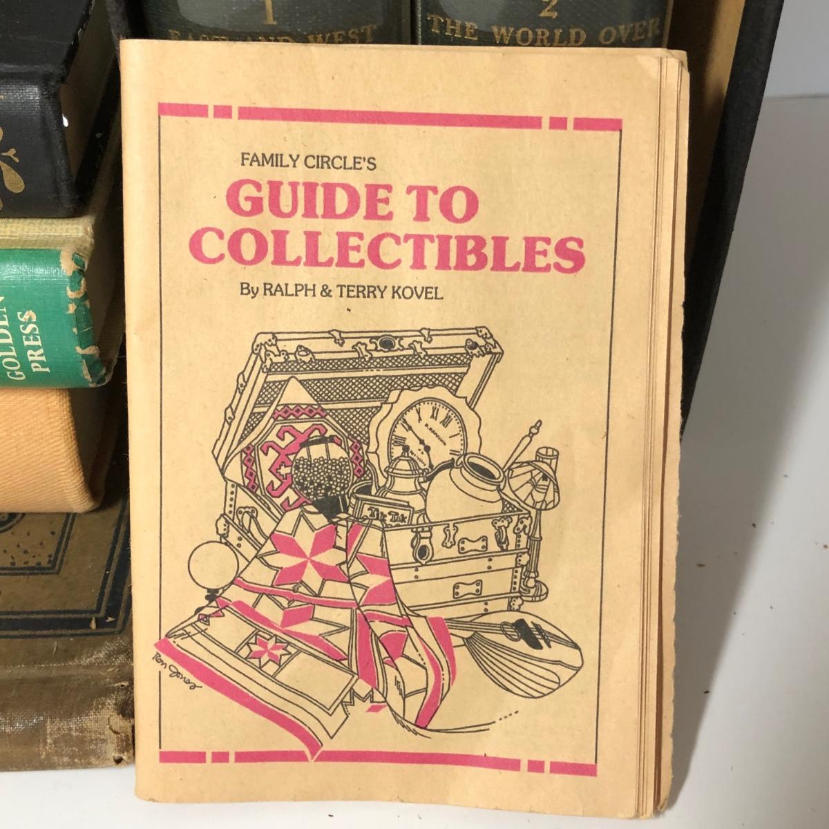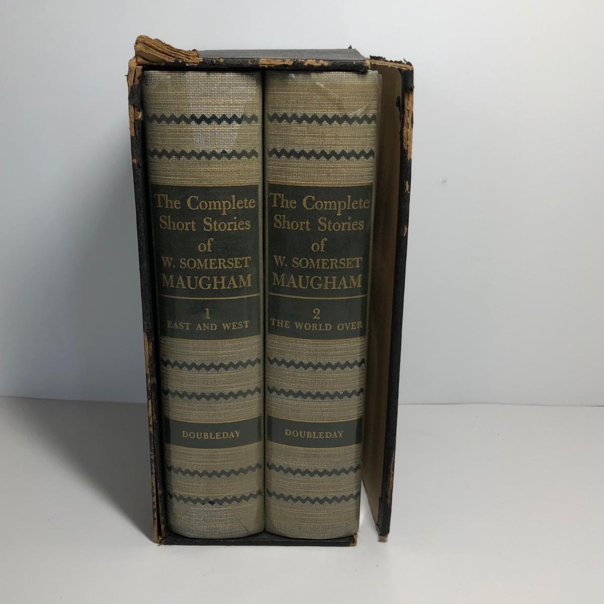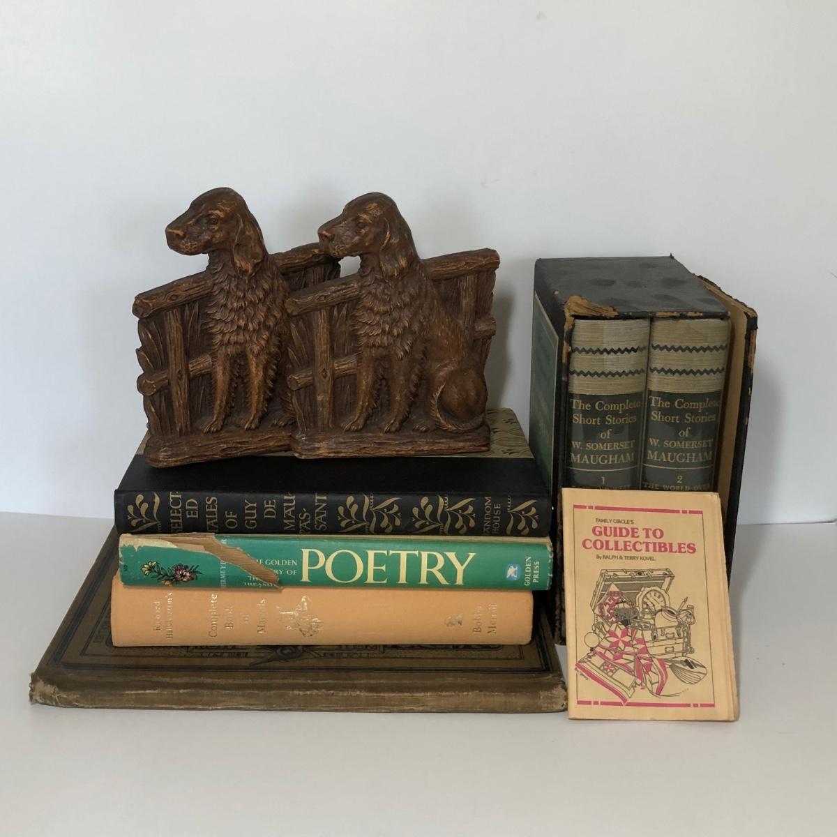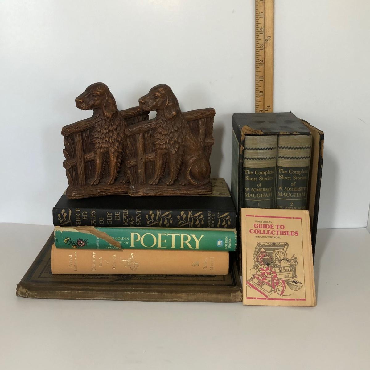 Includes Richard Halliburton's Complete Book of Marvels, Barnes's Complete Geography, The Golden Treasury of Poetry, The Complete Short Stories of W. Somerset Maugham, Selected Tales of Guy de Maupassant, the Family Circle's Guide to Collectibles, and two bookends with dogs on them.