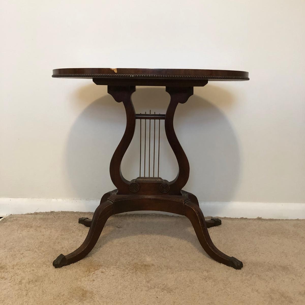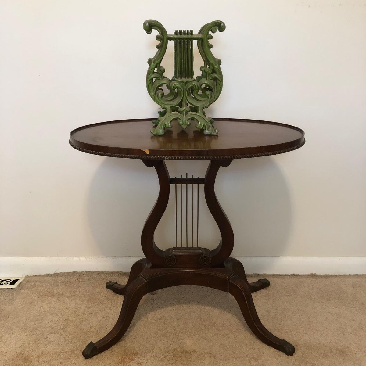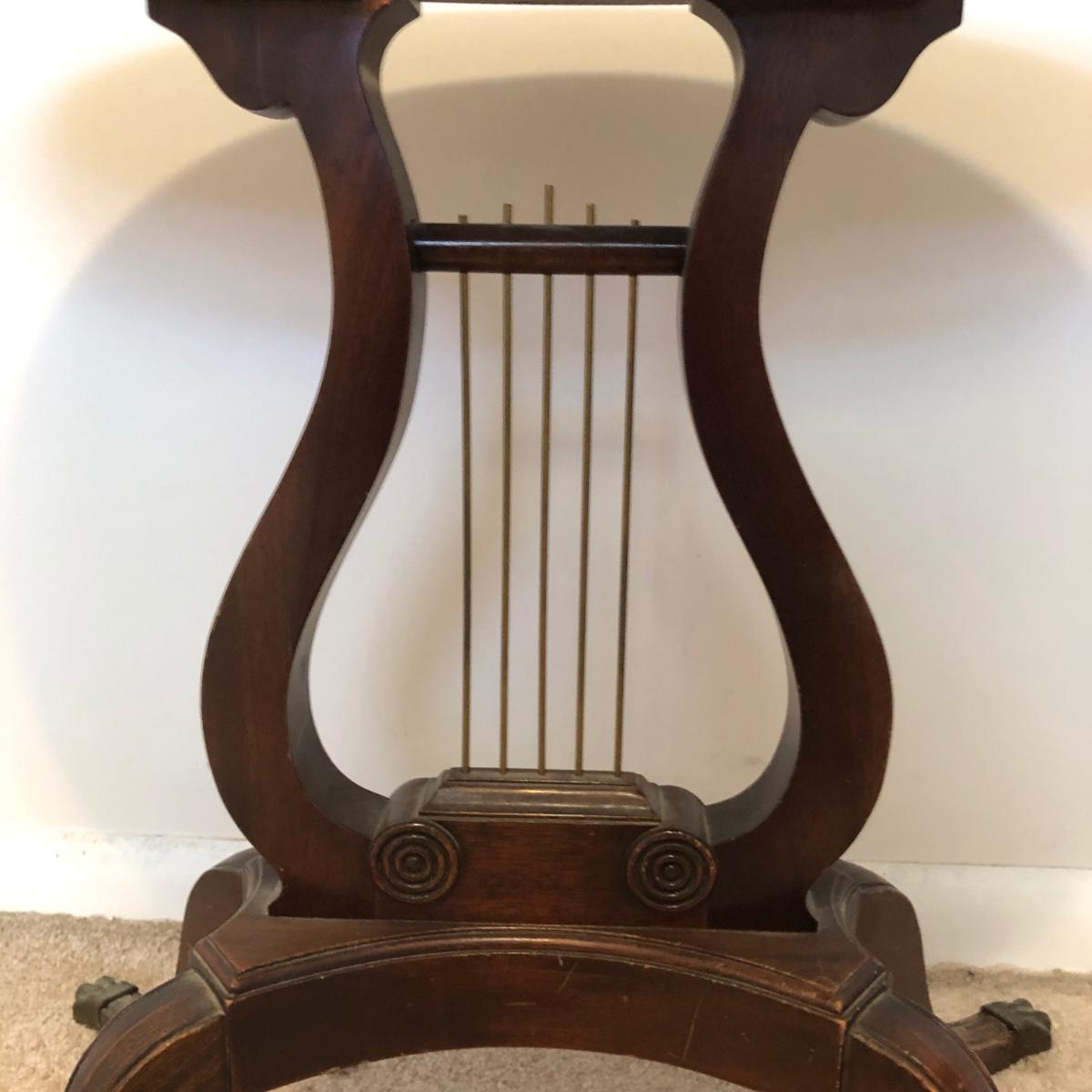 Table has two small chips on the edges, see photos. Table measures 25W x 17D x 24H. Includes green lyre statue.