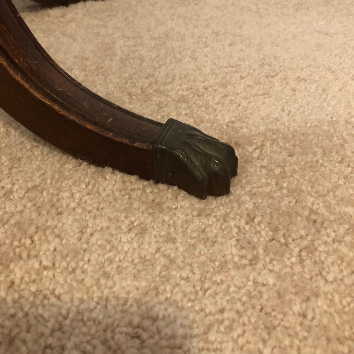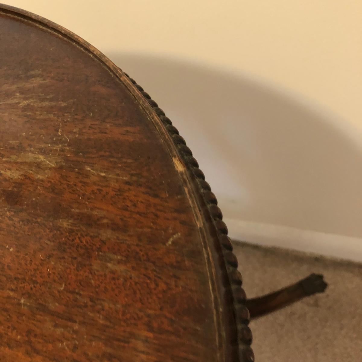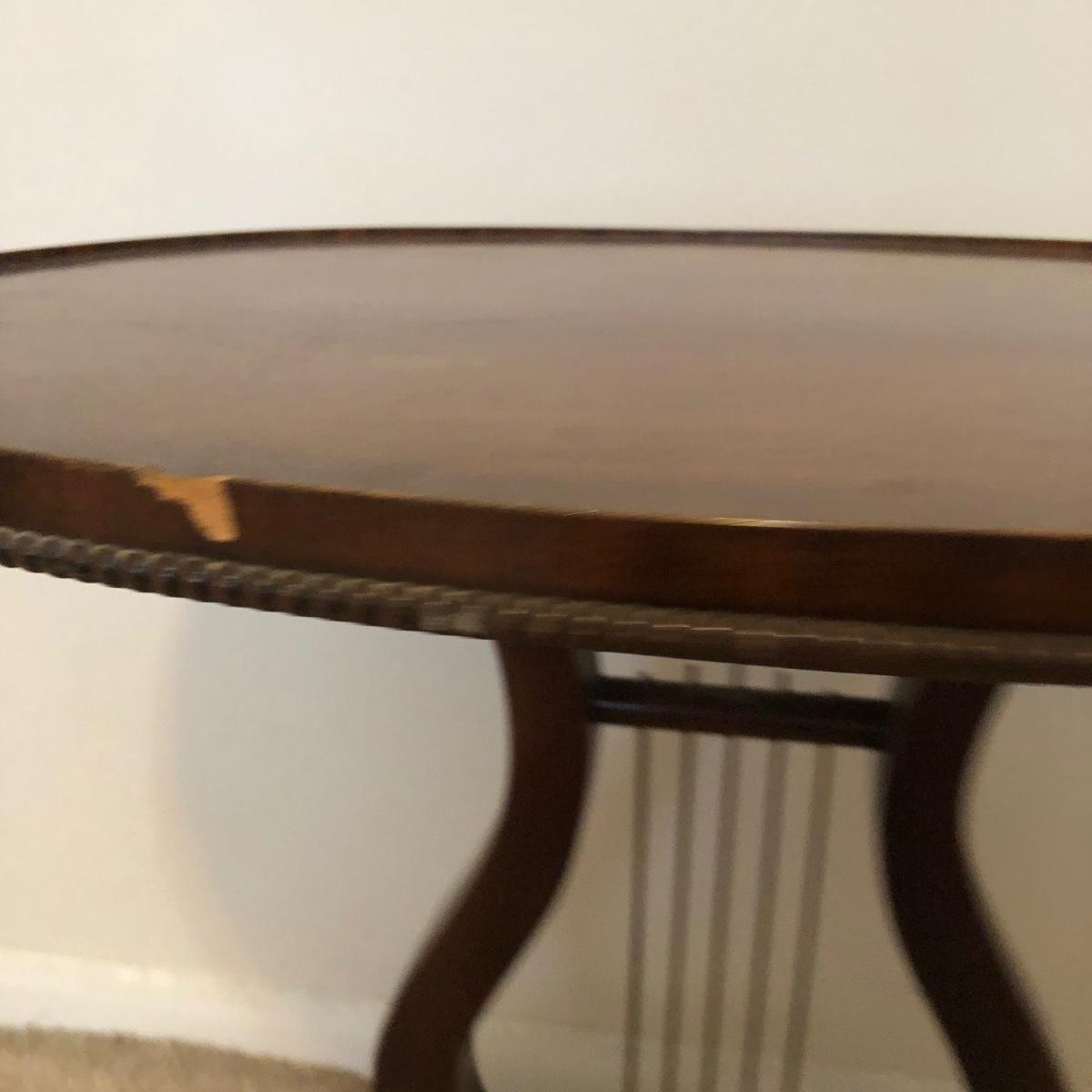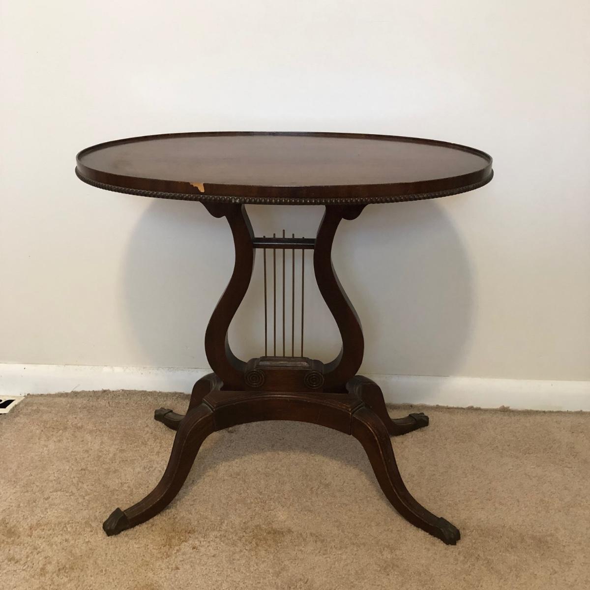 Table has two small chips on the edges, see photos. Table measures 25W x 17D x 24H. Includes green lyre statue.