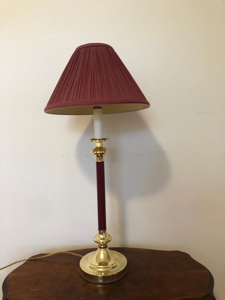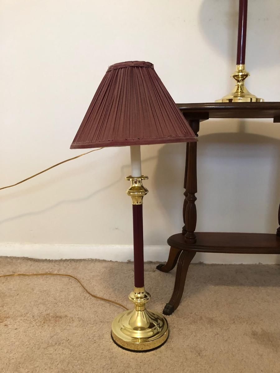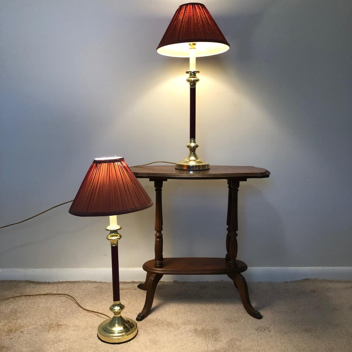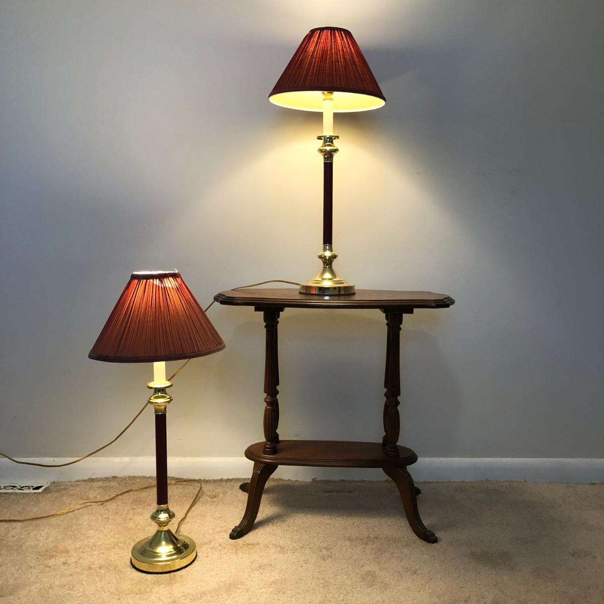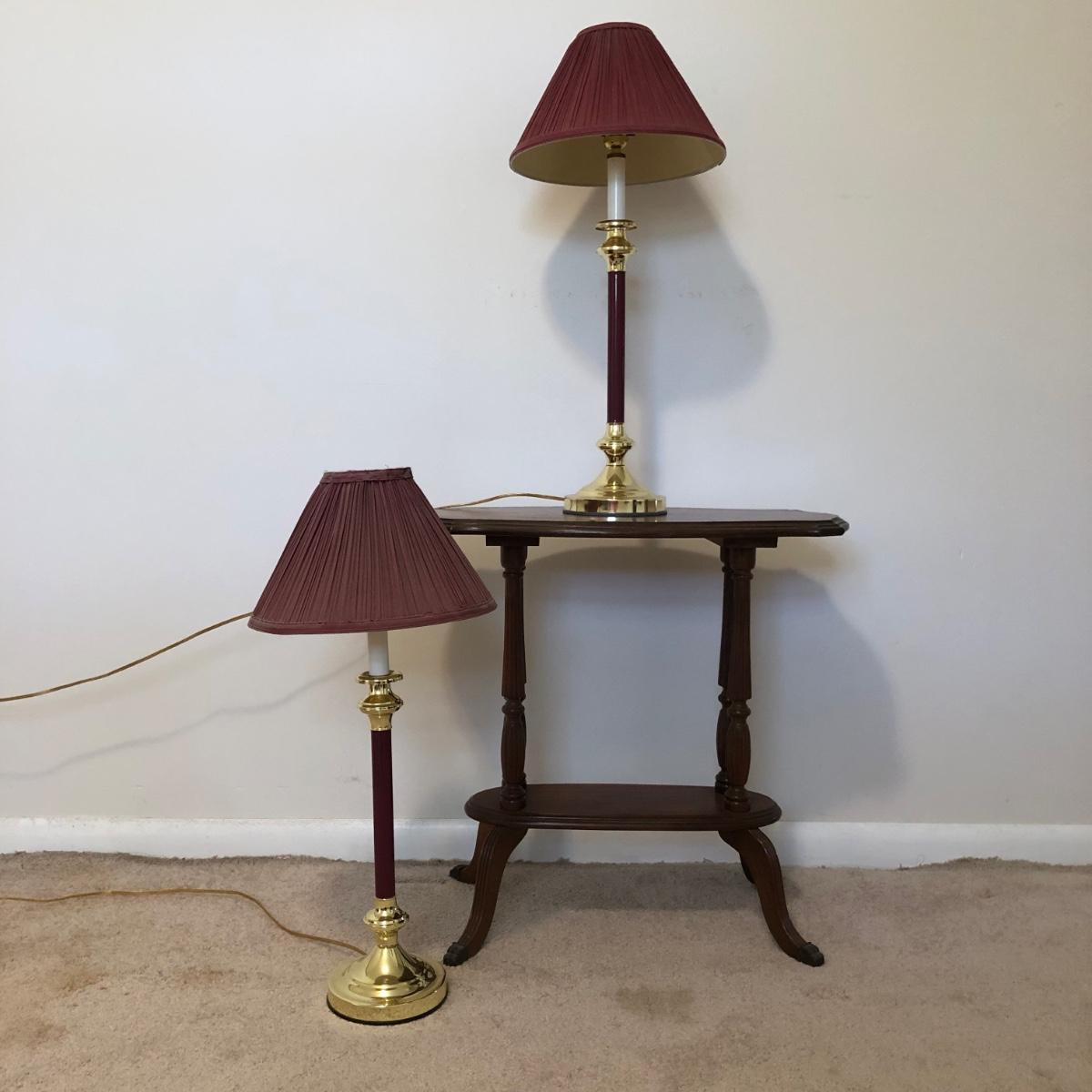Table has a few scratches on the surface and measures 25W x 13D x 24H. Lamps are both in working order and measure 27 inches tall.
