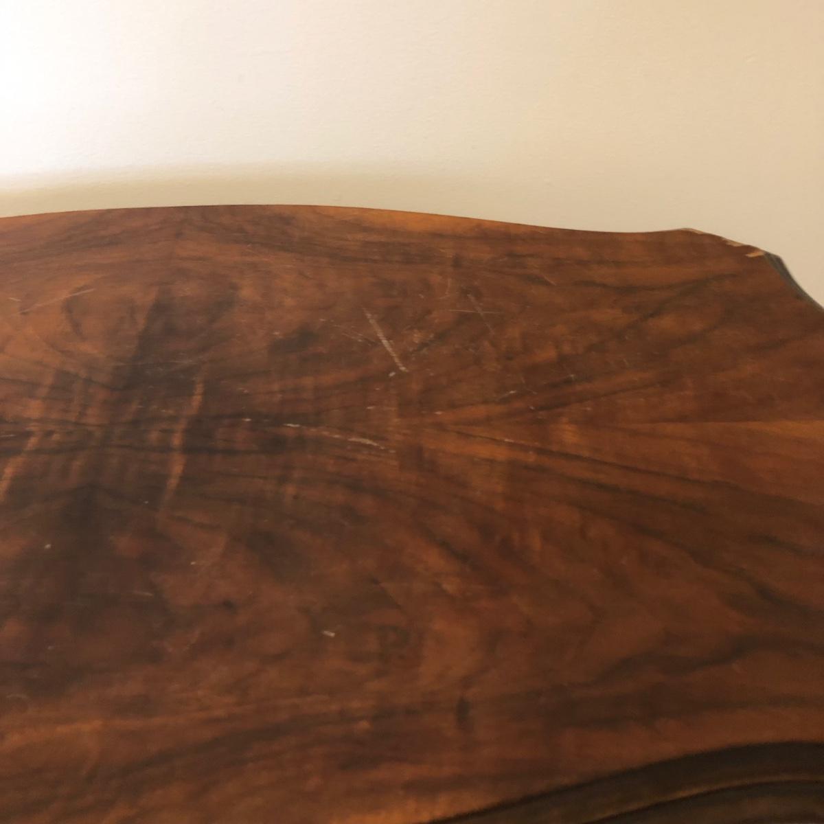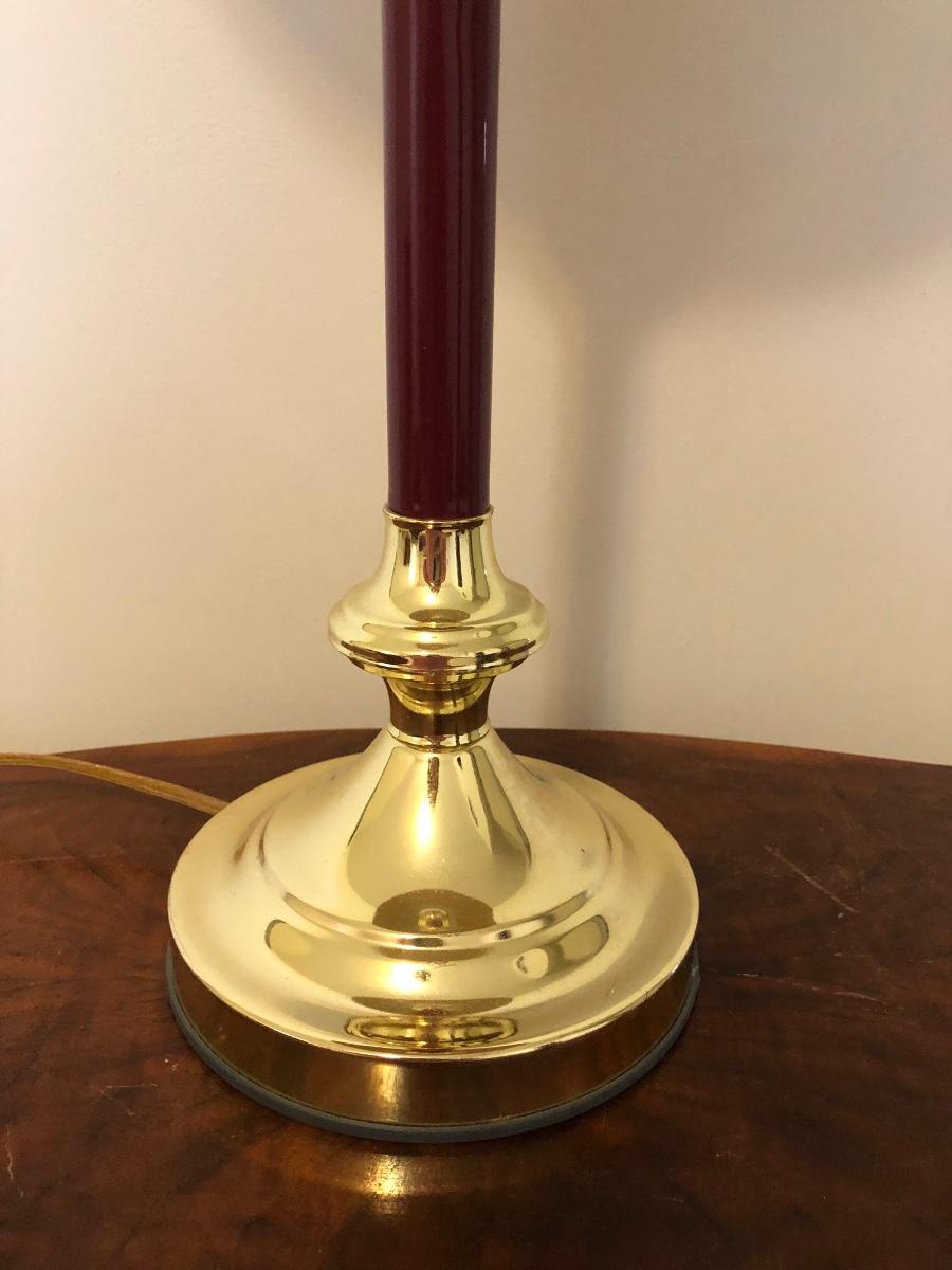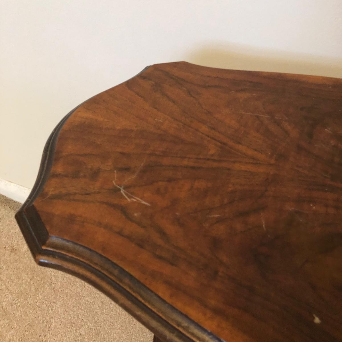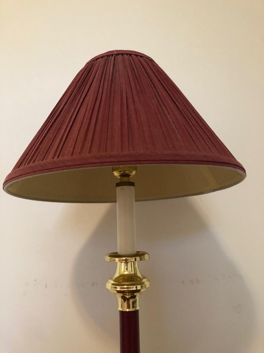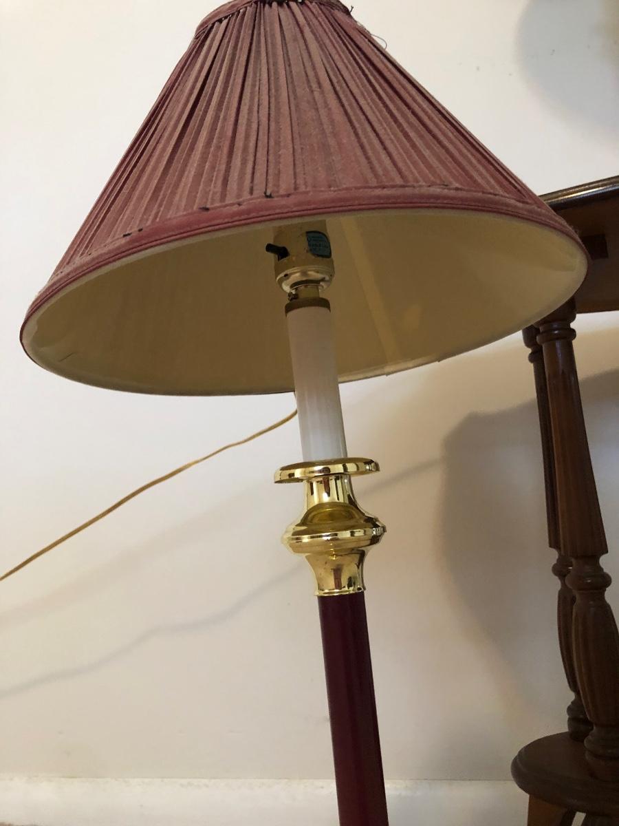 Table has a few scratches on the surface and measures 25W x 13D x 24H. Lamps are both in working order and measure 27 inches tall.