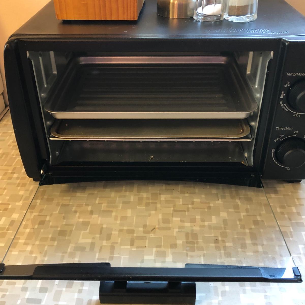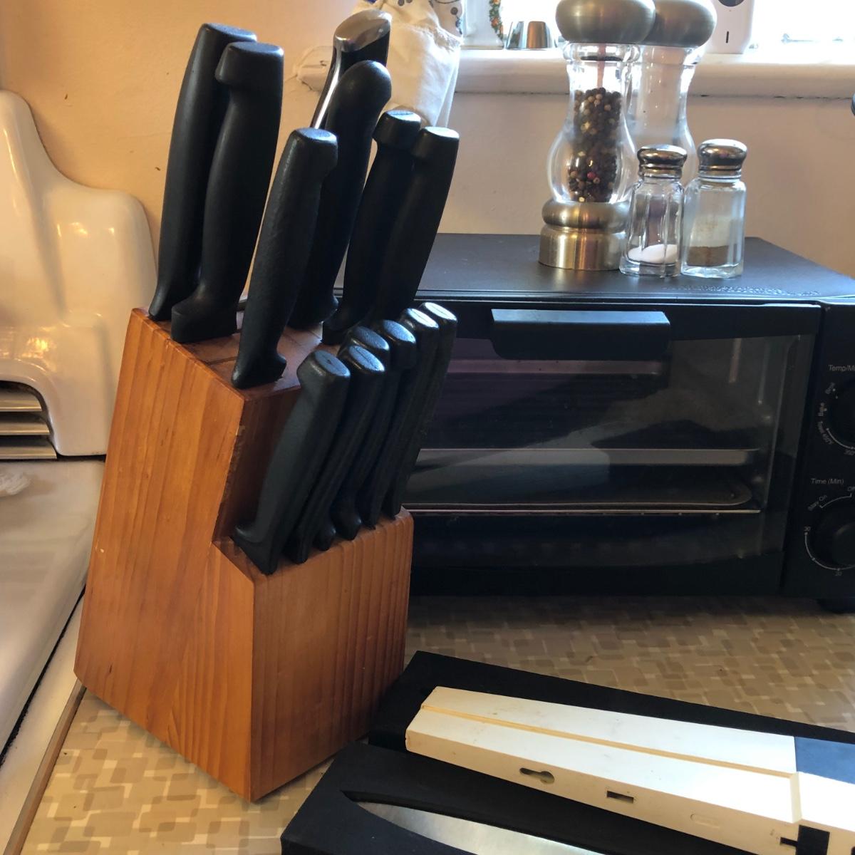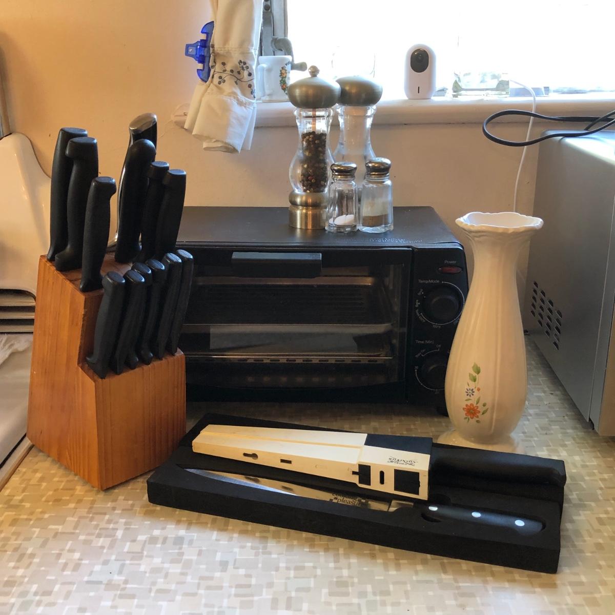 Includes toaster oven, knife block with mixed knives, two other knives, a small vase, and two sets of salt & pepper shakers.
