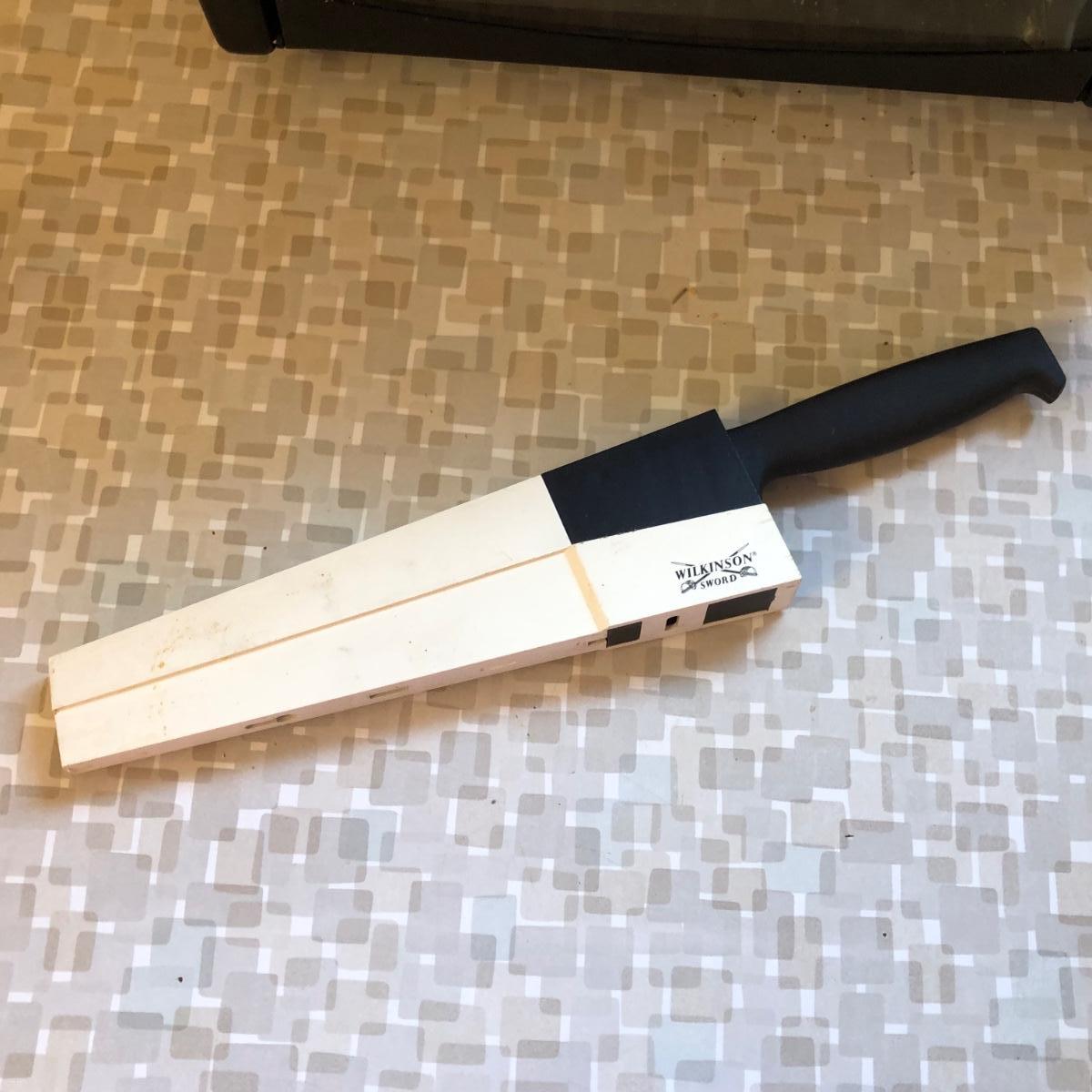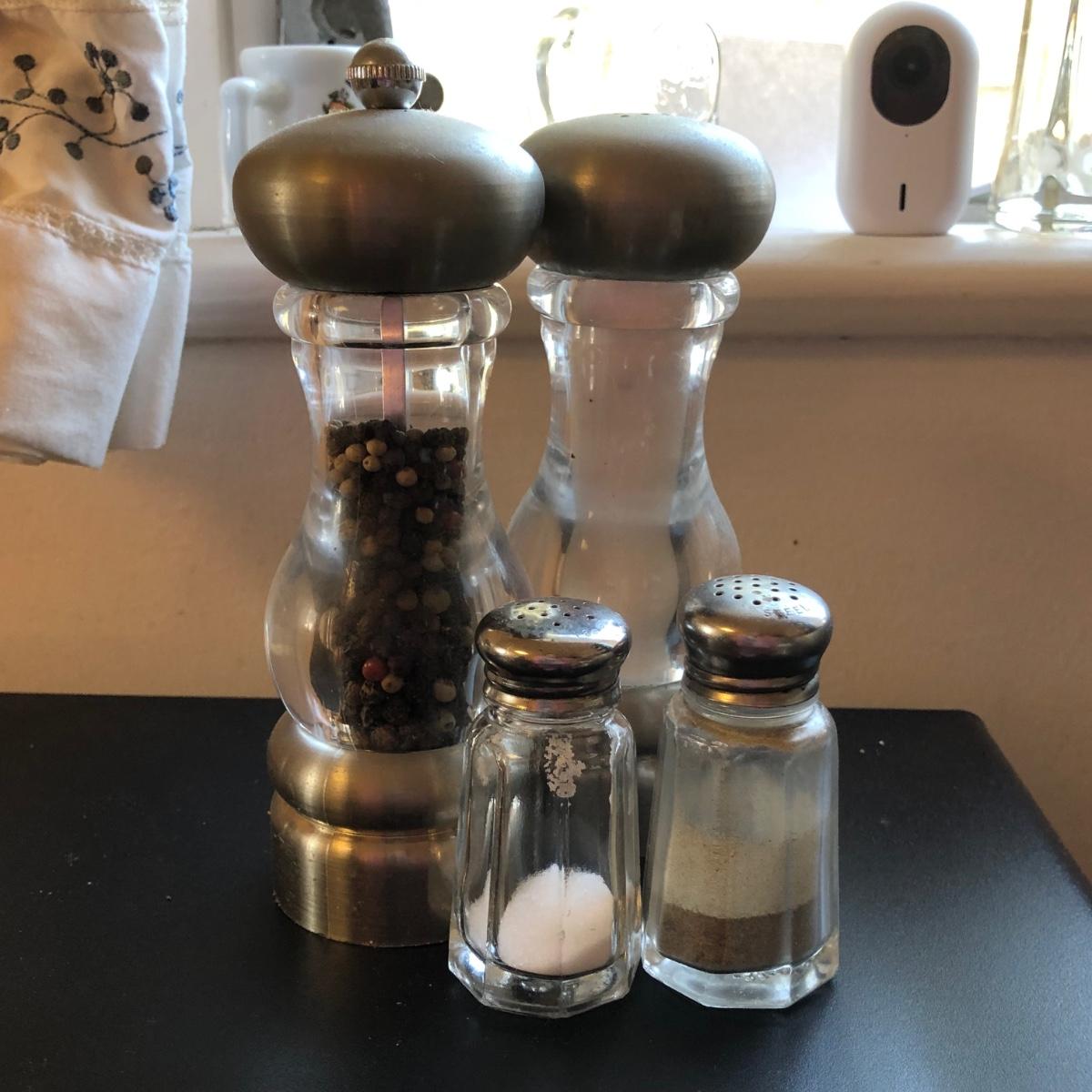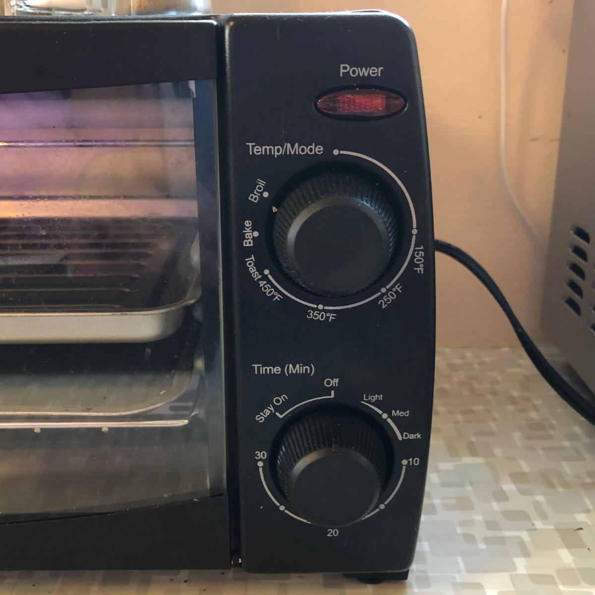 Includes toaster oven, knife block with mixed knives, two other knives, a small vase, and two sets of salt & pepper shakers.