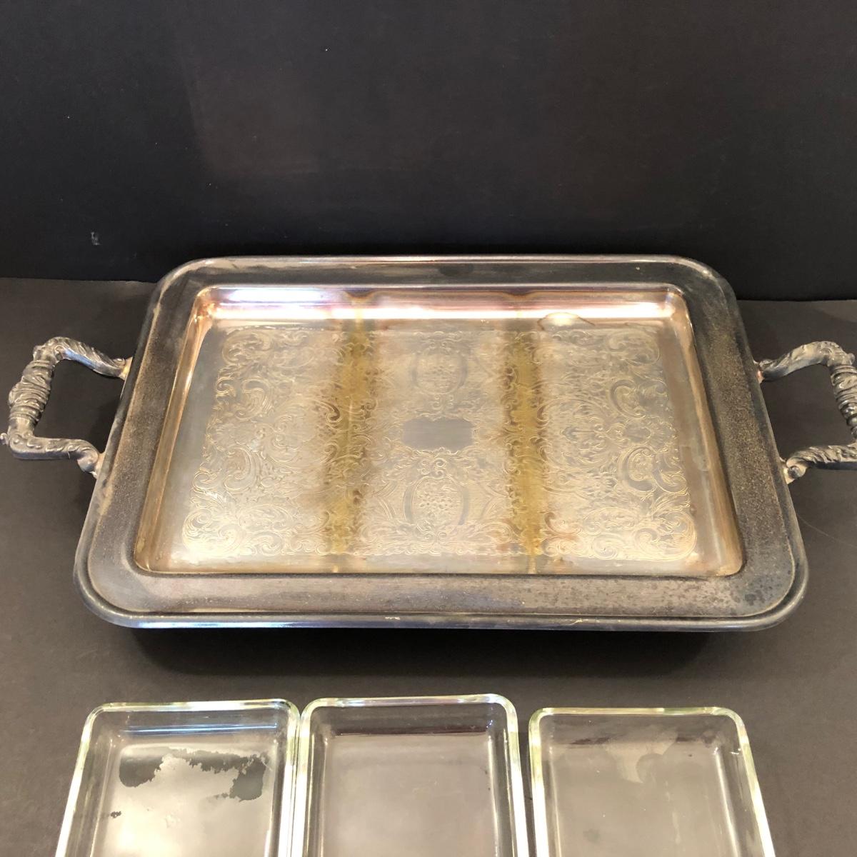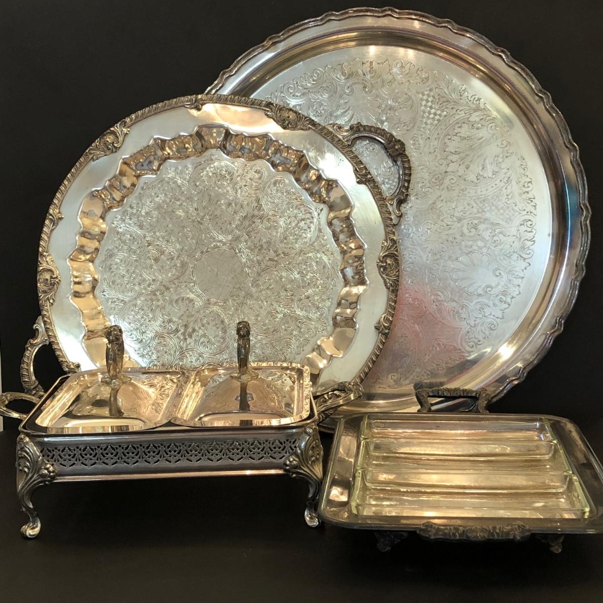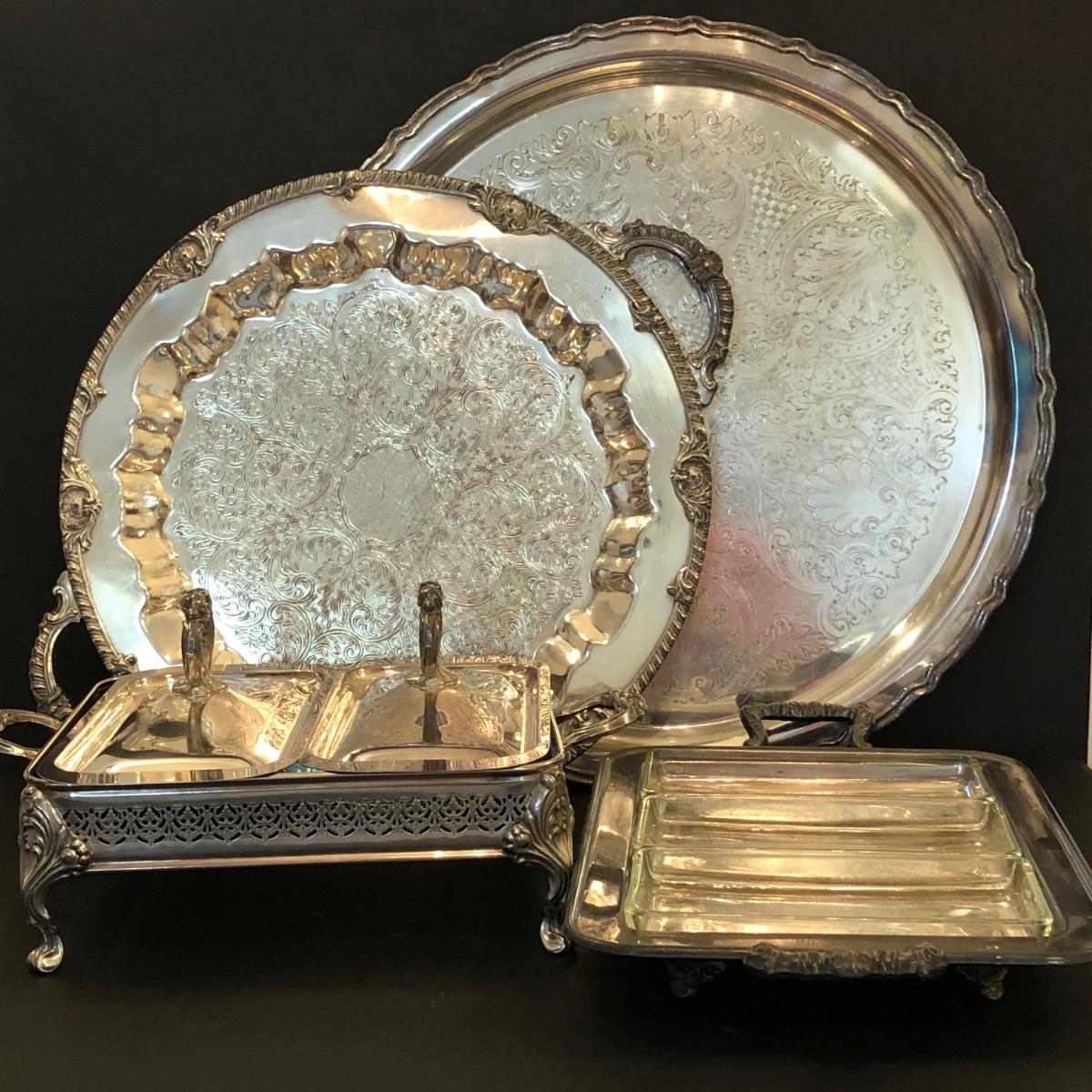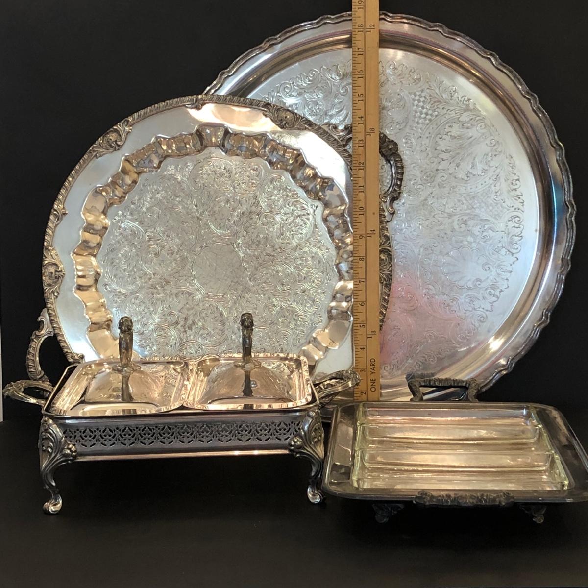 Includes two large trays, a chafing dish holder with lids (missing the inside compartment) and another silver plated serving dish with 3 glass compartments.