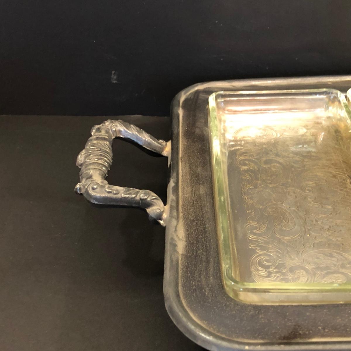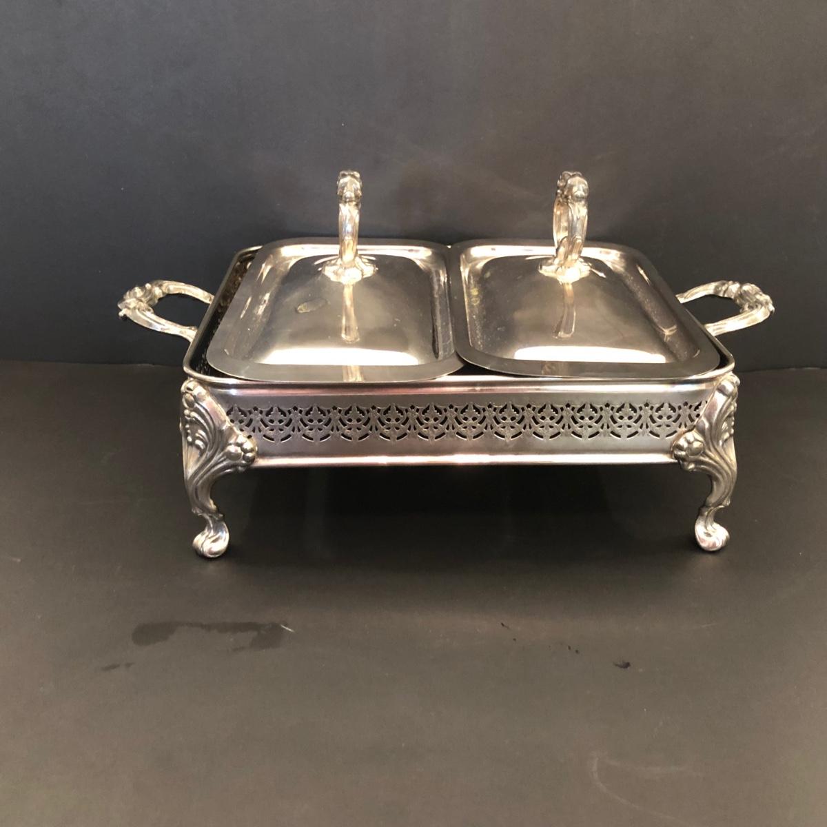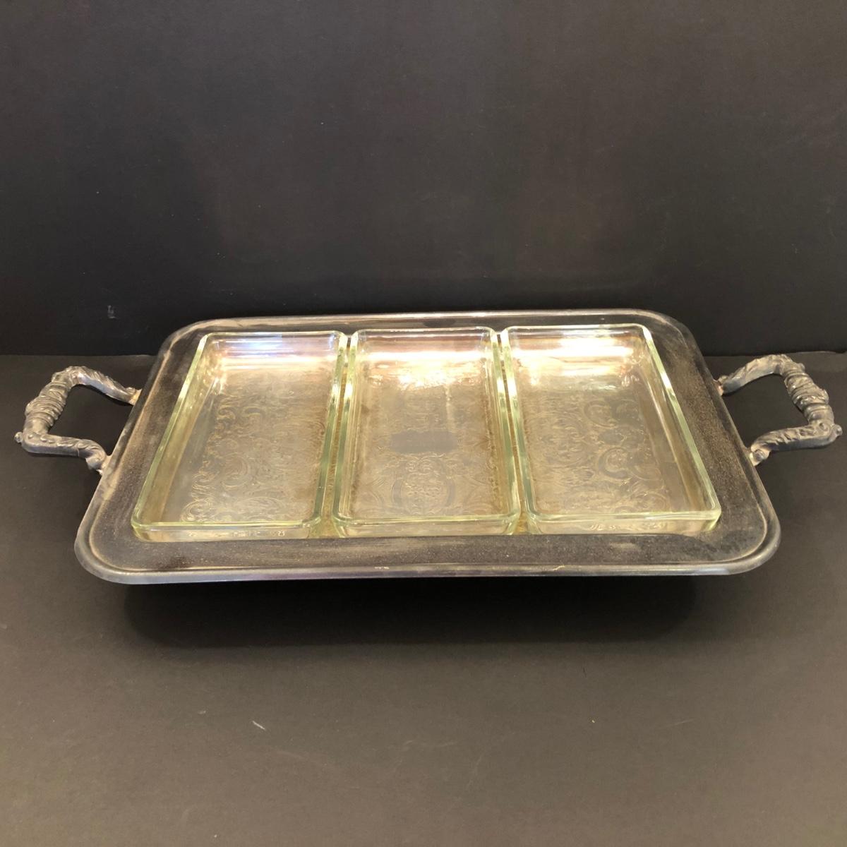 Includes two large trays, a chafing dish holder with lids (missing the inside compartment) and another silver plated serving dish with 3 glass compartments.