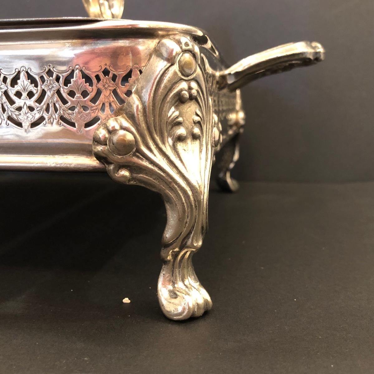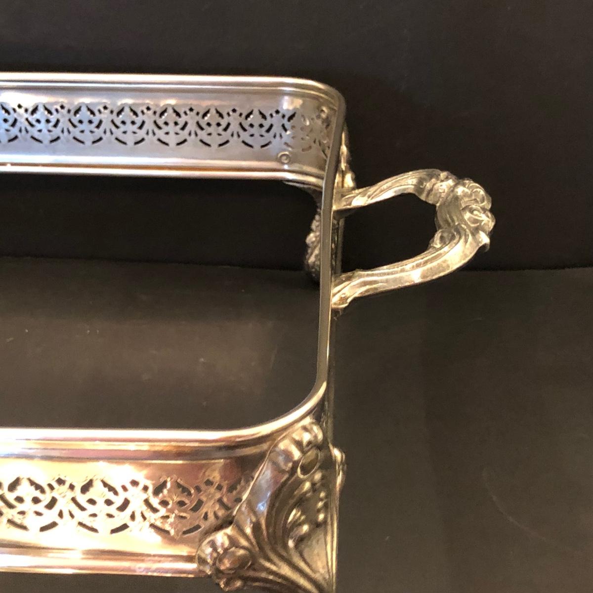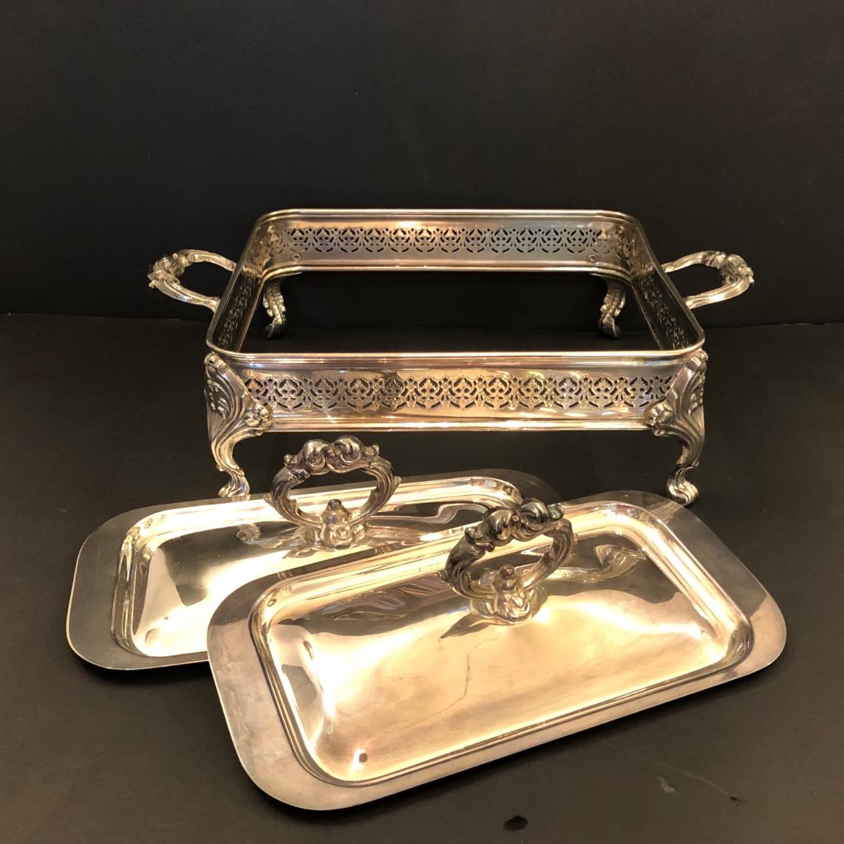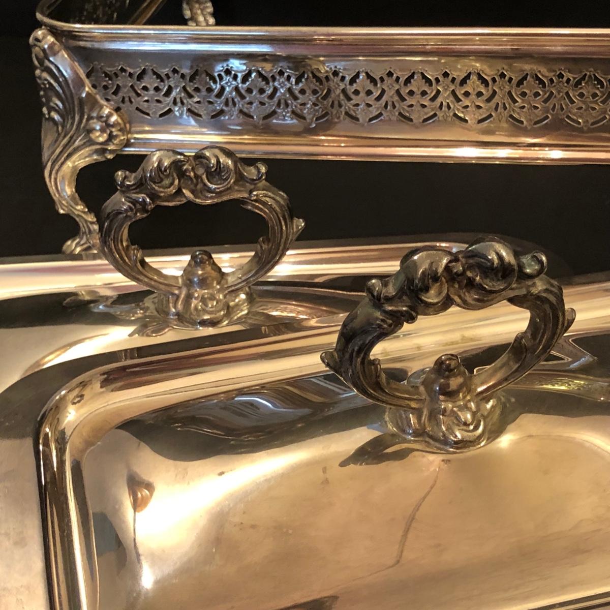 Includes two large trays, a chafing dish holder with lids (missing the inside compartment) and another silver plated serving dish with 3 glass compartments.