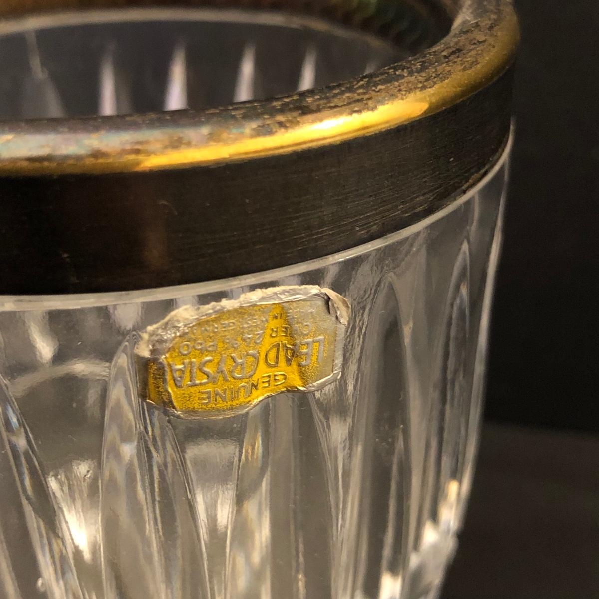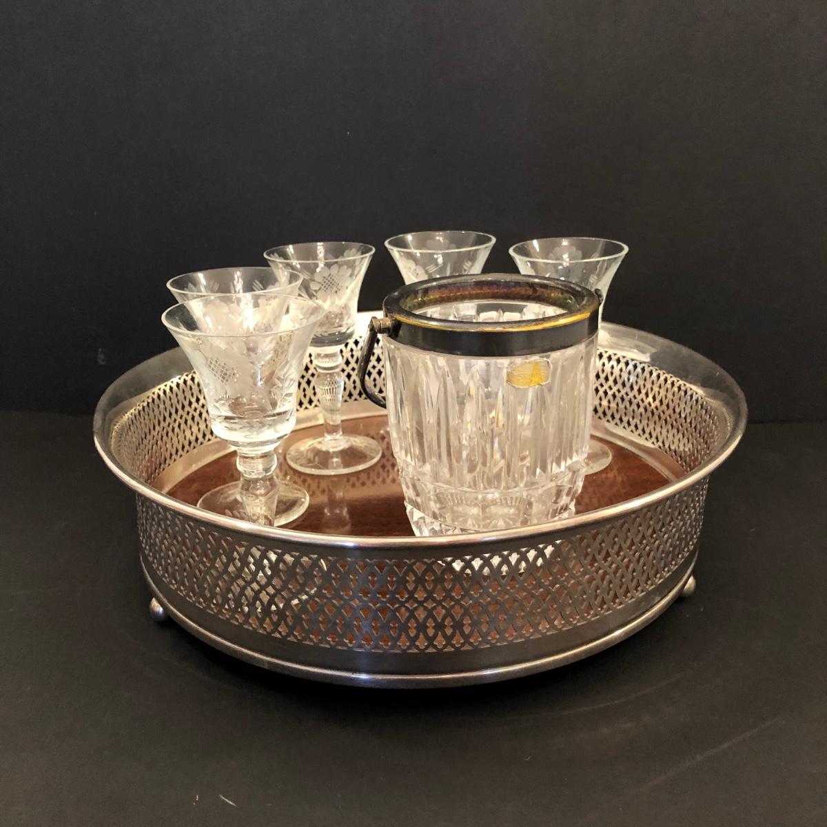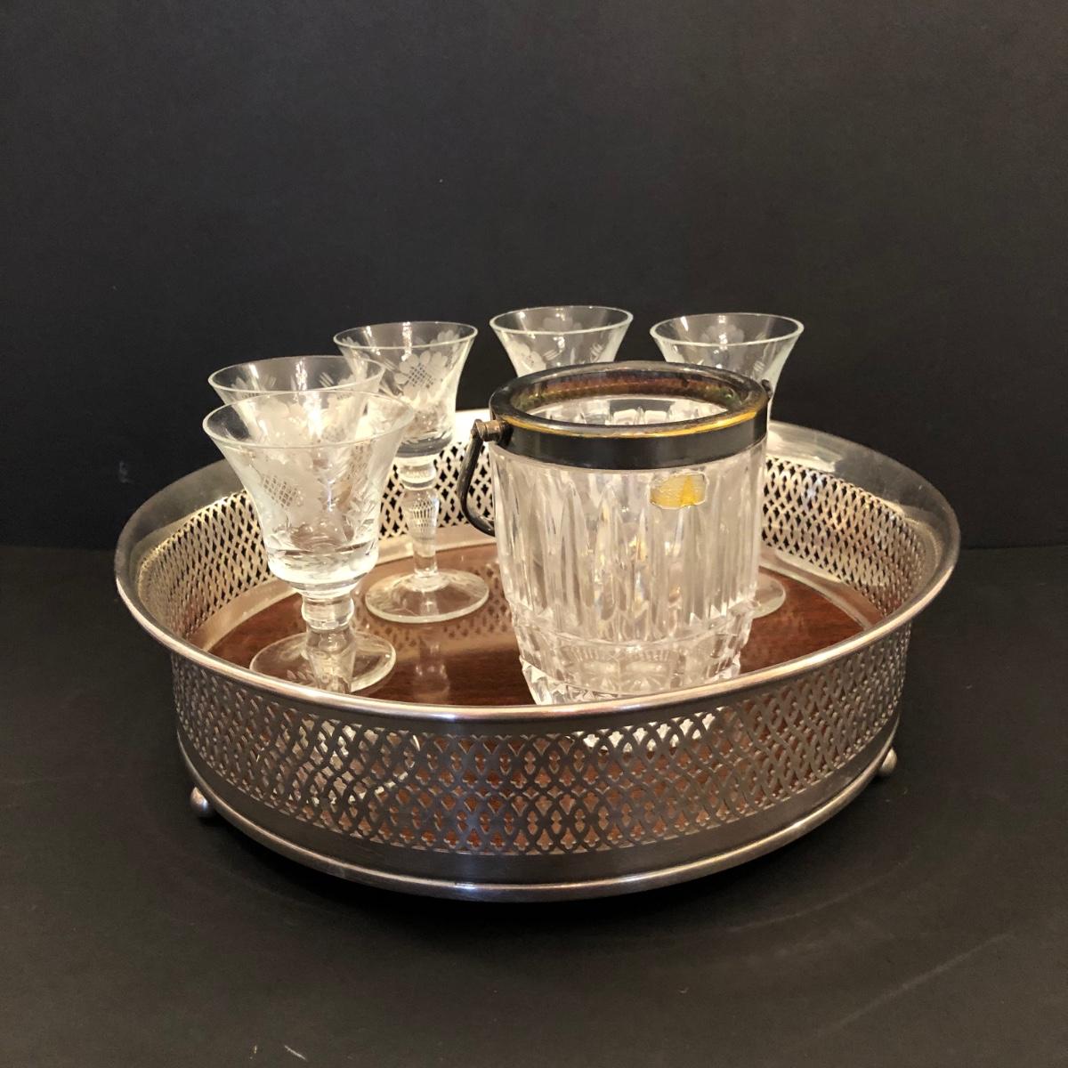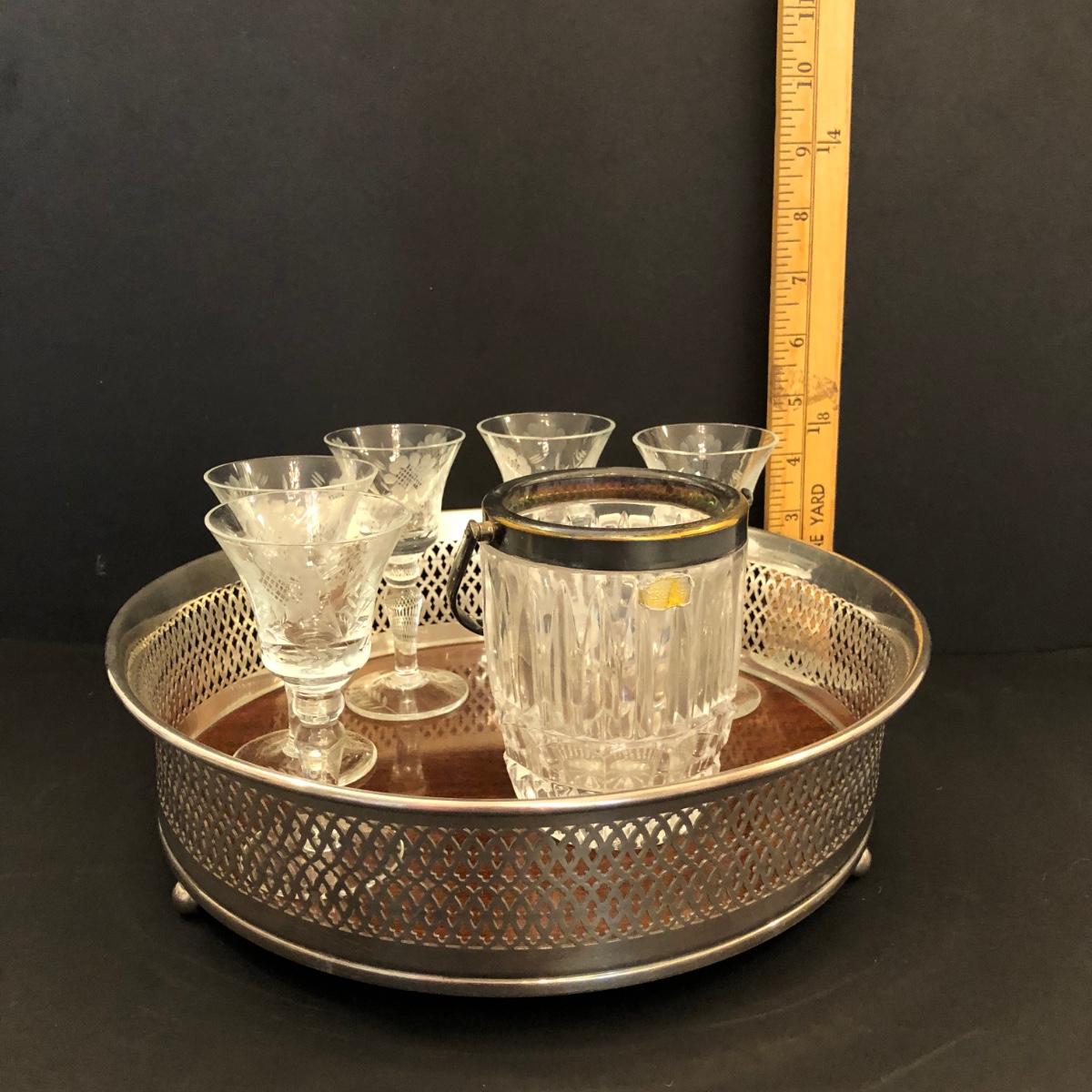 LOT106M: Charles Beller Formica Silver Plate Drink Tray w/ Etched Drink Glasses & Lead Crystal Ice Bucket