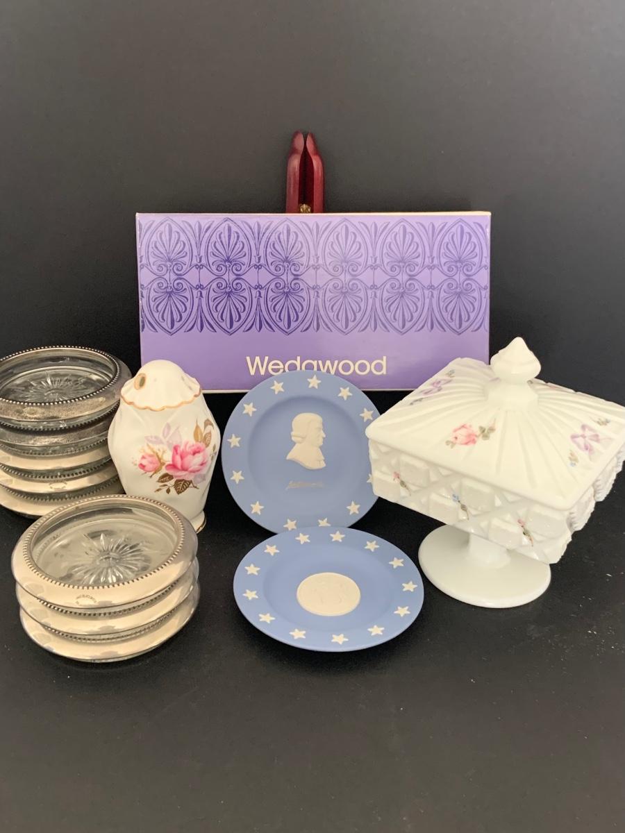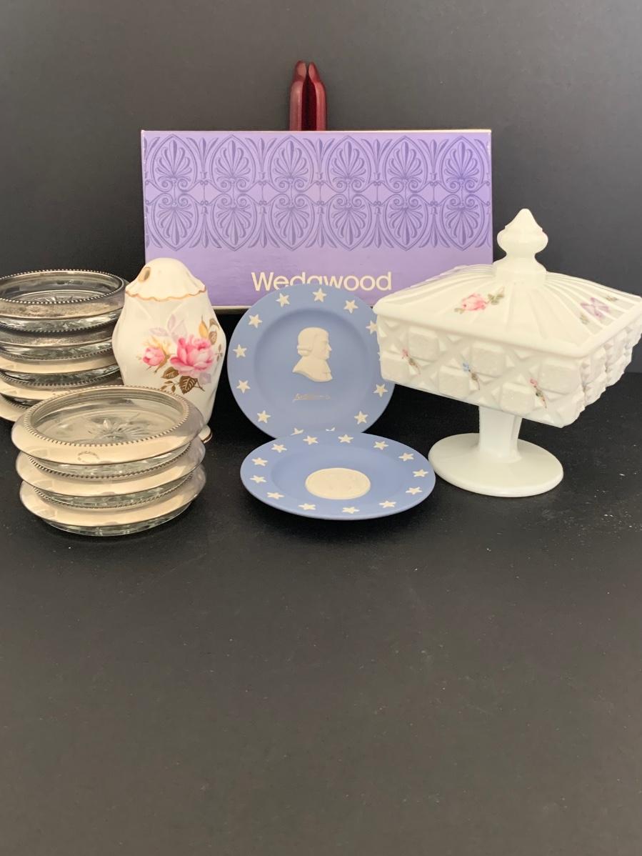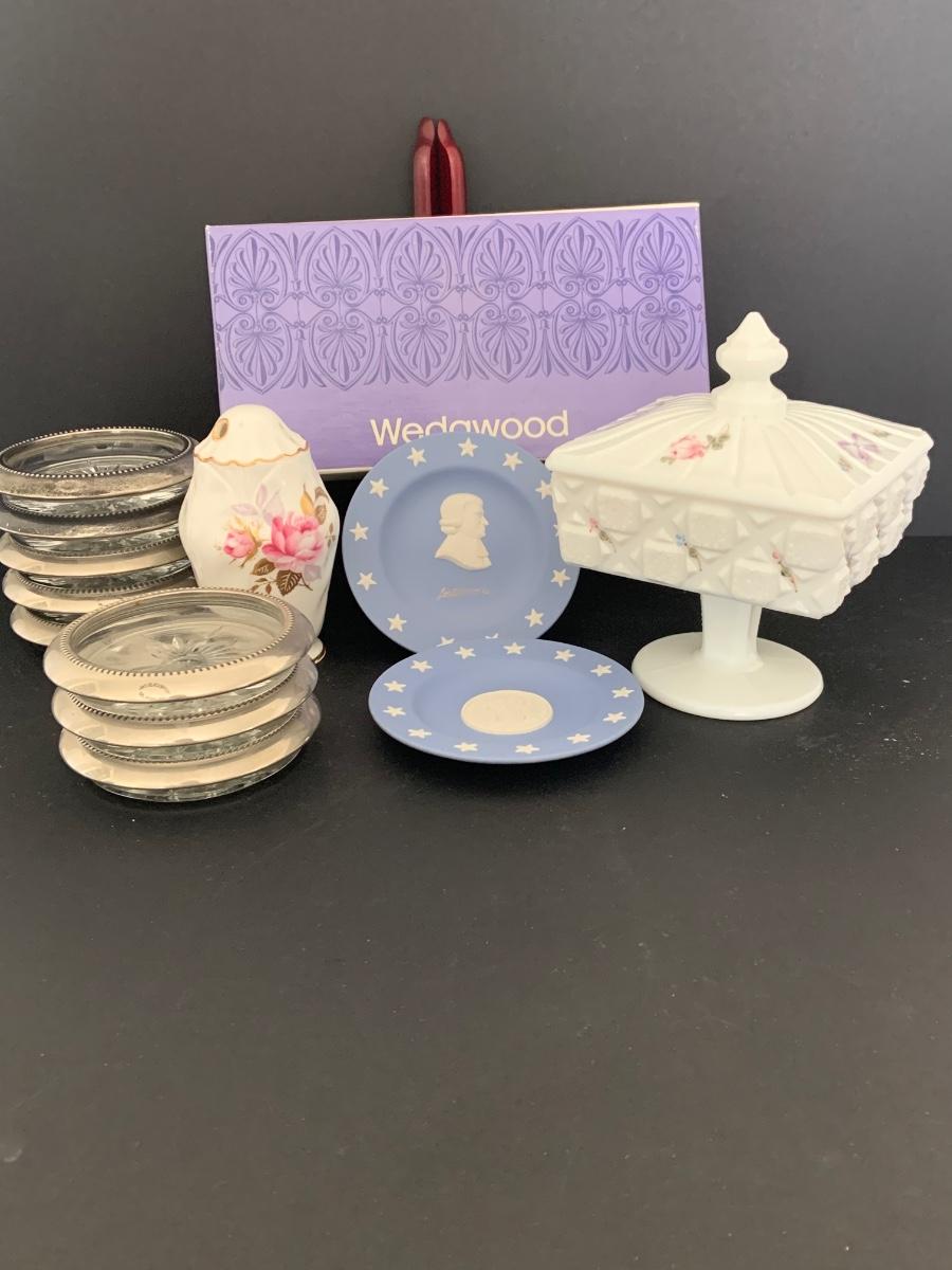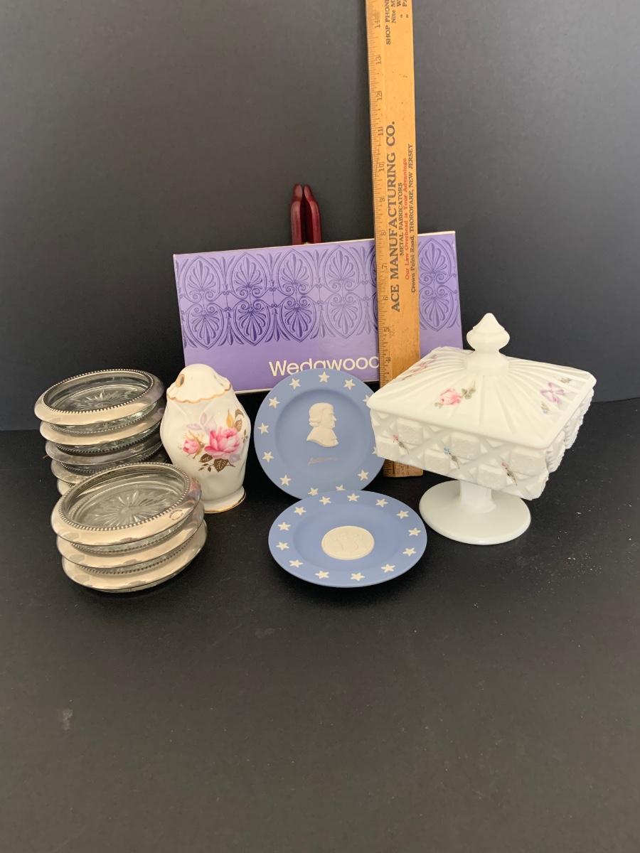 LOT:112G: Wedgwood Blue Jasper Bicentennial State Seal Series NEW JERSEY; Wes Blackinton Silver-plated Crystal Coasters; an Ansley China Shaker and a Square Milk-Glass Compote with Lid