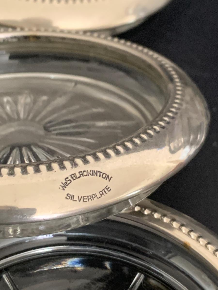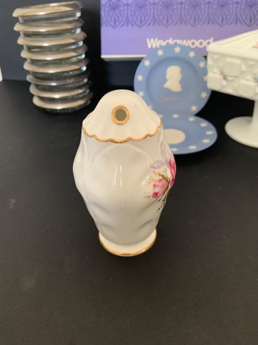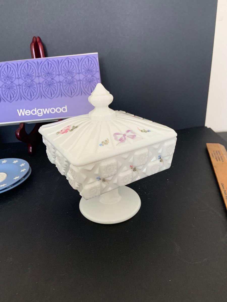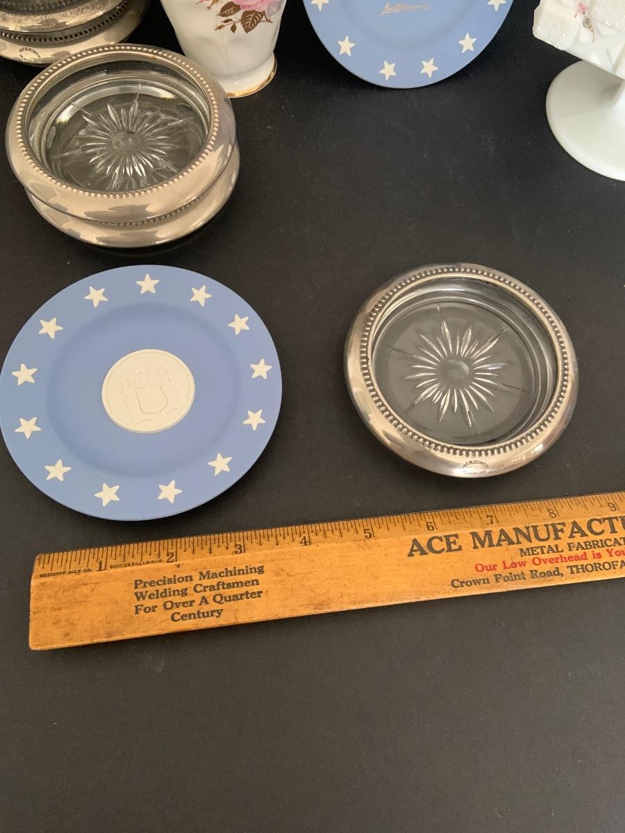 LOT:112G: Wedgwood Blue Jasper Bicentennial State Seal Series NEW JERSEY; Wes Blackinton Silver-plated Crystal Coasters; an Ansley China Shaker and a Square Milk-Glass Compote with Lid