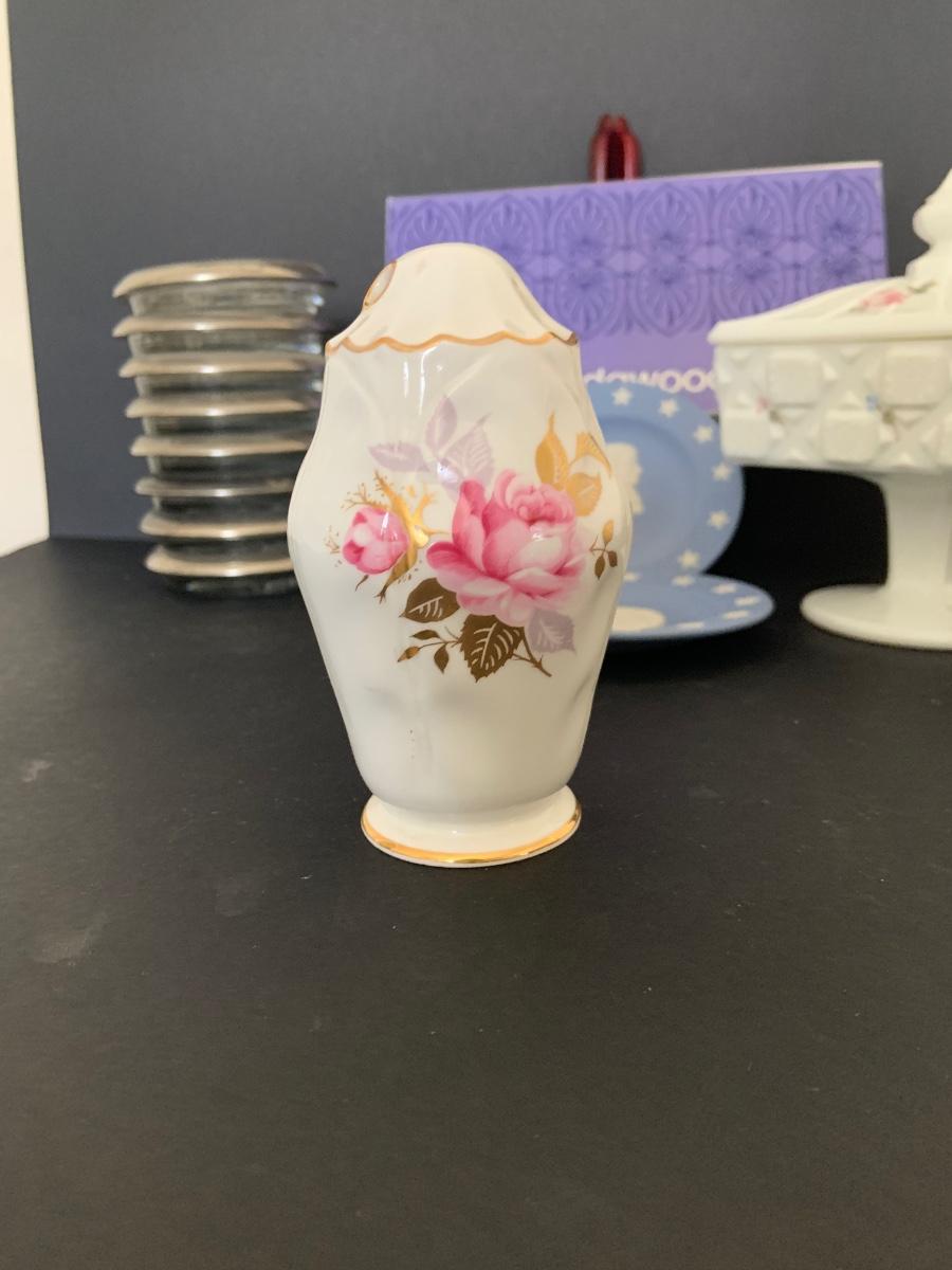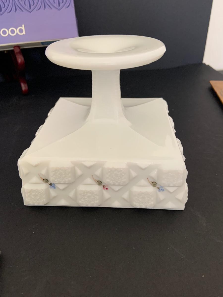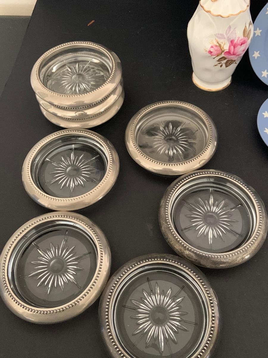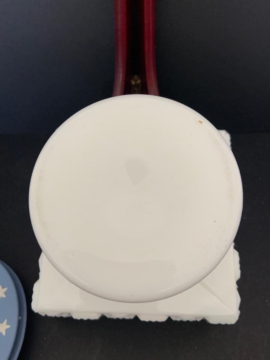 LOT:112G: Wedgwood Blue Jasper Bicentennial State Seal Series NEW JERSEY; Wes Blackinton Silver-plated Crystal Coasters; an Ansley China Shaker and a Square Milk-Glass Compote with Lid